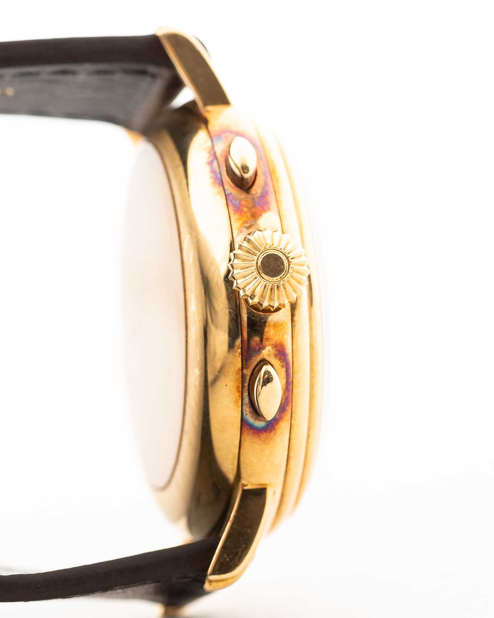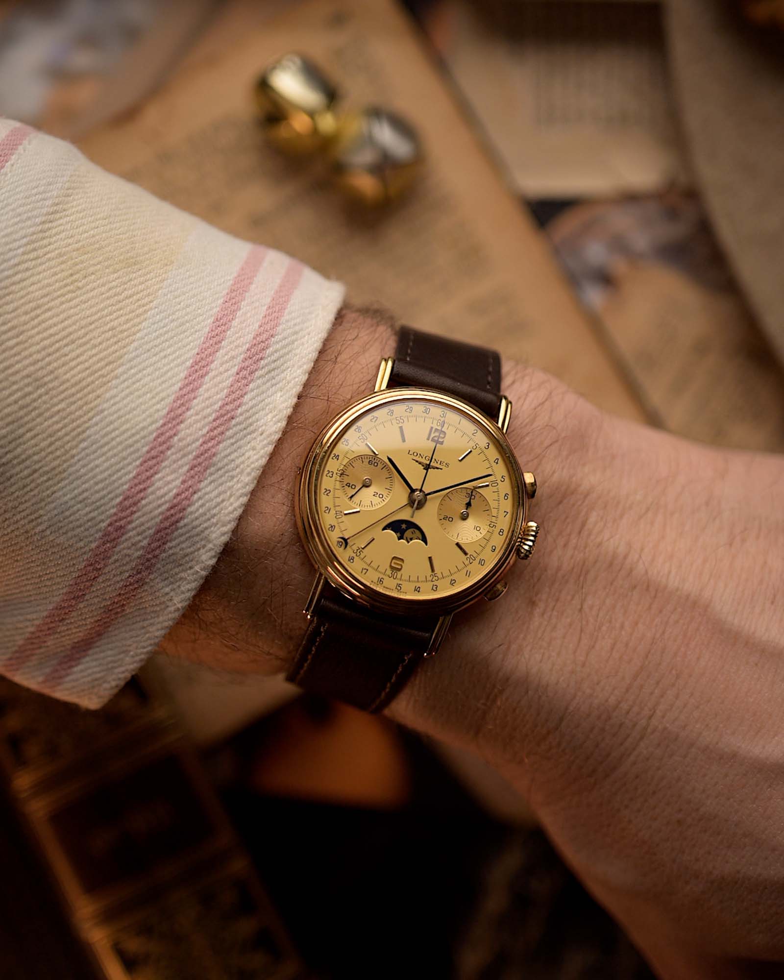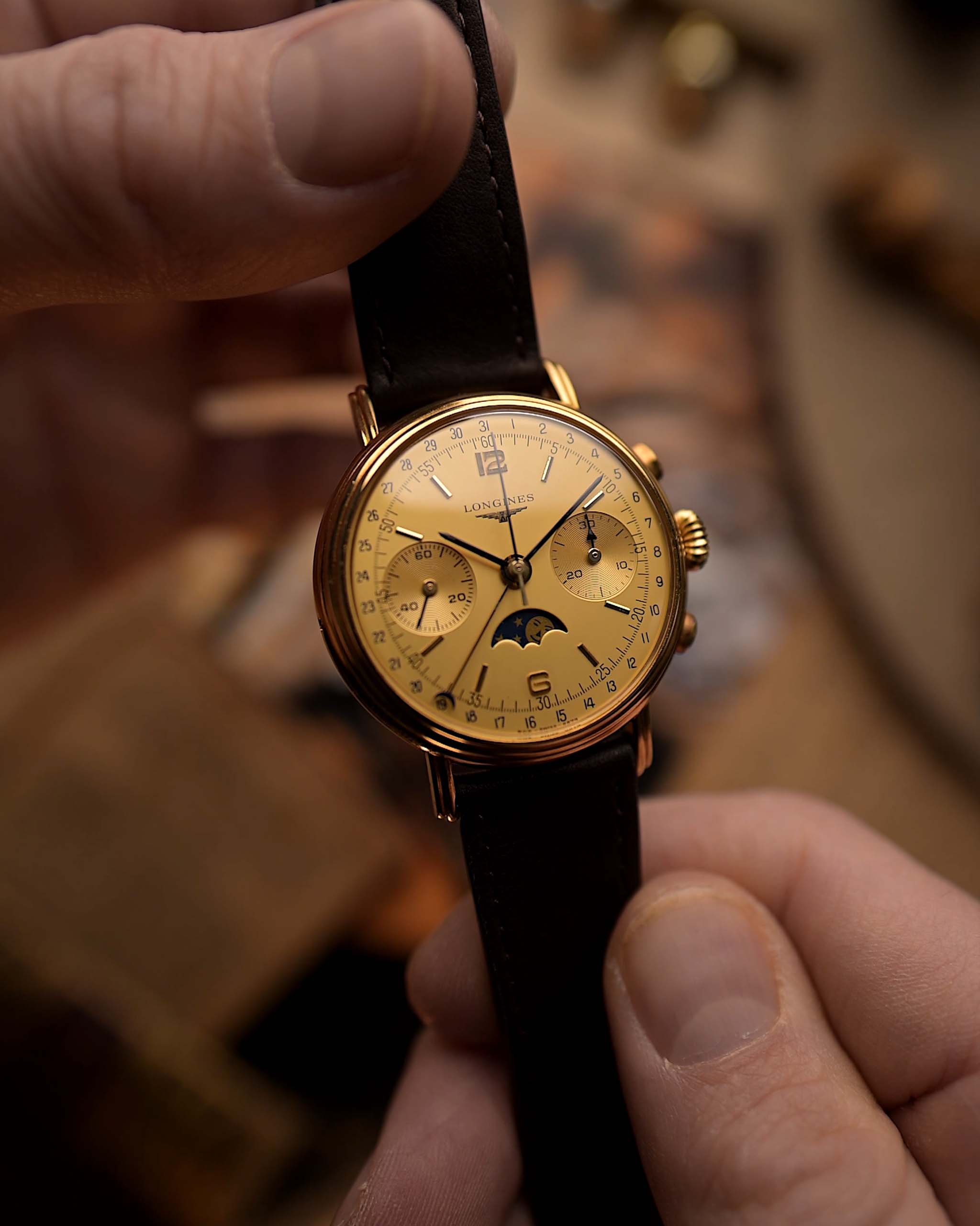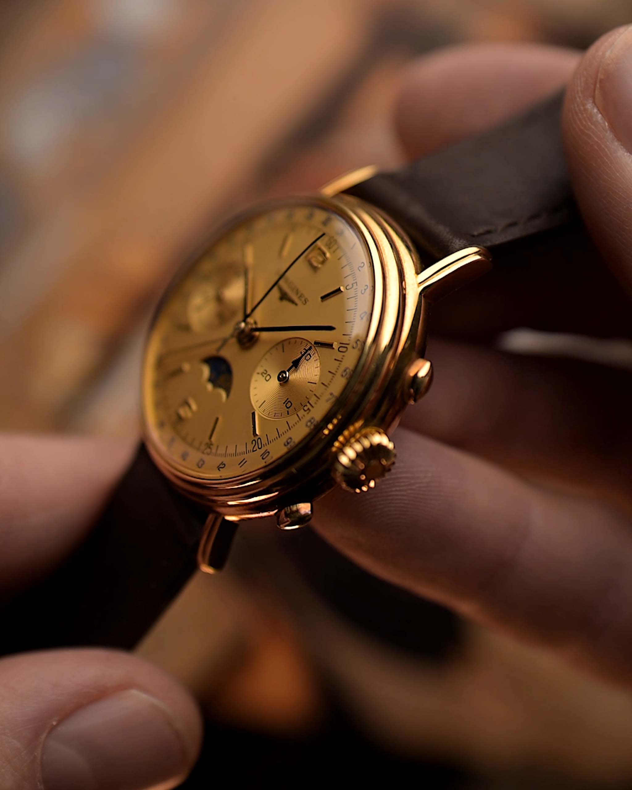 Cronógrafo Longines 6574 con fase lunar, oro de 18 quilates, década de 1980