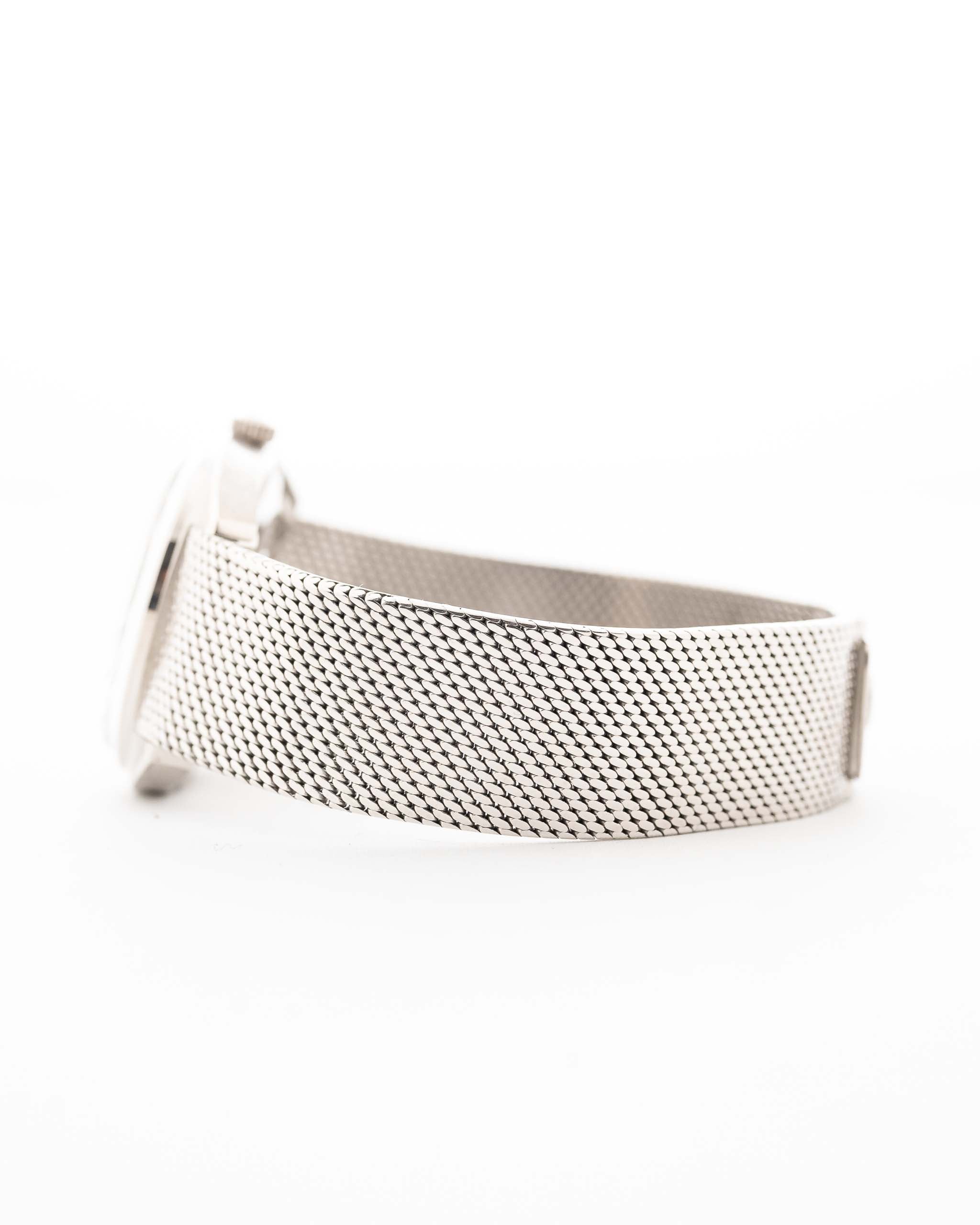 The Omega Constellation has always stood as a symbol of precision and prestige — and this rare Ref. 168.019 in 18k white gold takes that legacy to a whole new level. Introduced during the golden age of dress watches, this 1968 piece showcases the bold C-shape case design Omega adopted in the late ‘60s, paired with a stunning silver linen dial and an ultra-elegant 18k white gold Milanese bracelet.