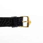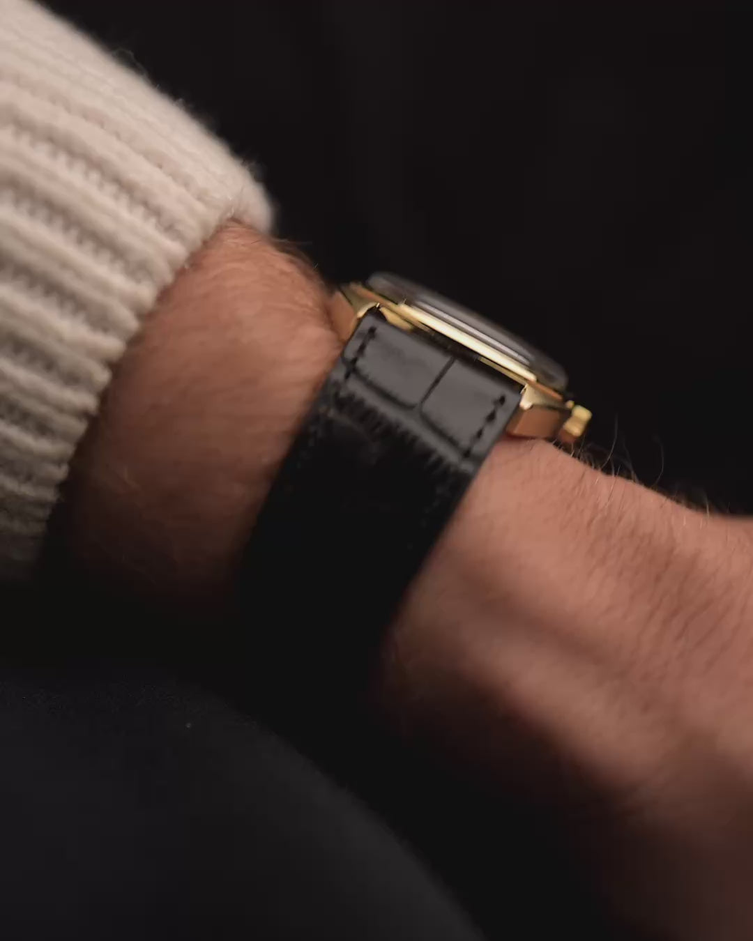 Housed in a 35 mm yellow gold-plated case, this Constellation features a clean day-date display, elegant stick hour markers, and a perfectly balanced dial layout. Paired with a glossy black alligator-embossed strap, this piece feels right at home whether you're at a formal dinner or enjoying a weekend espresso.