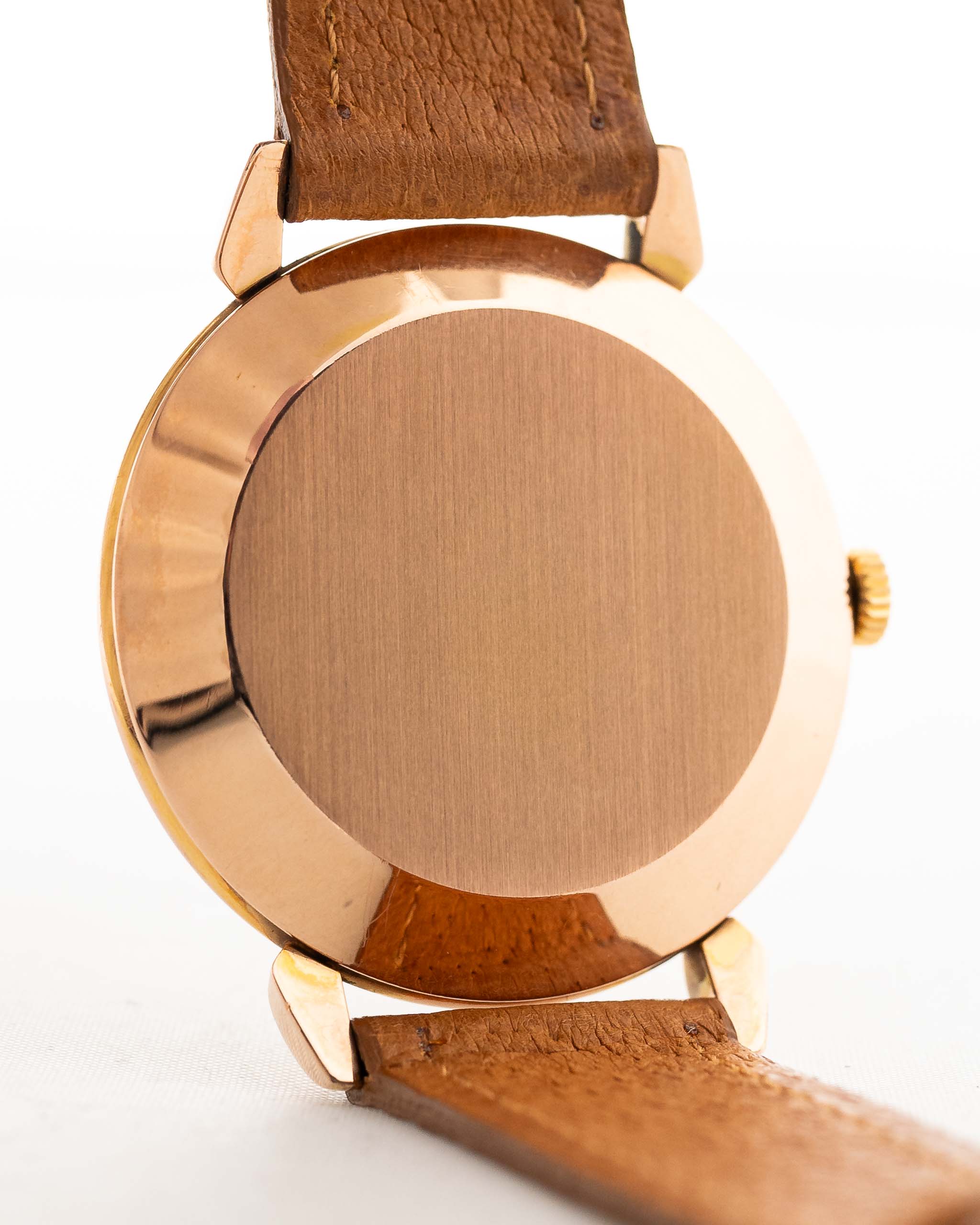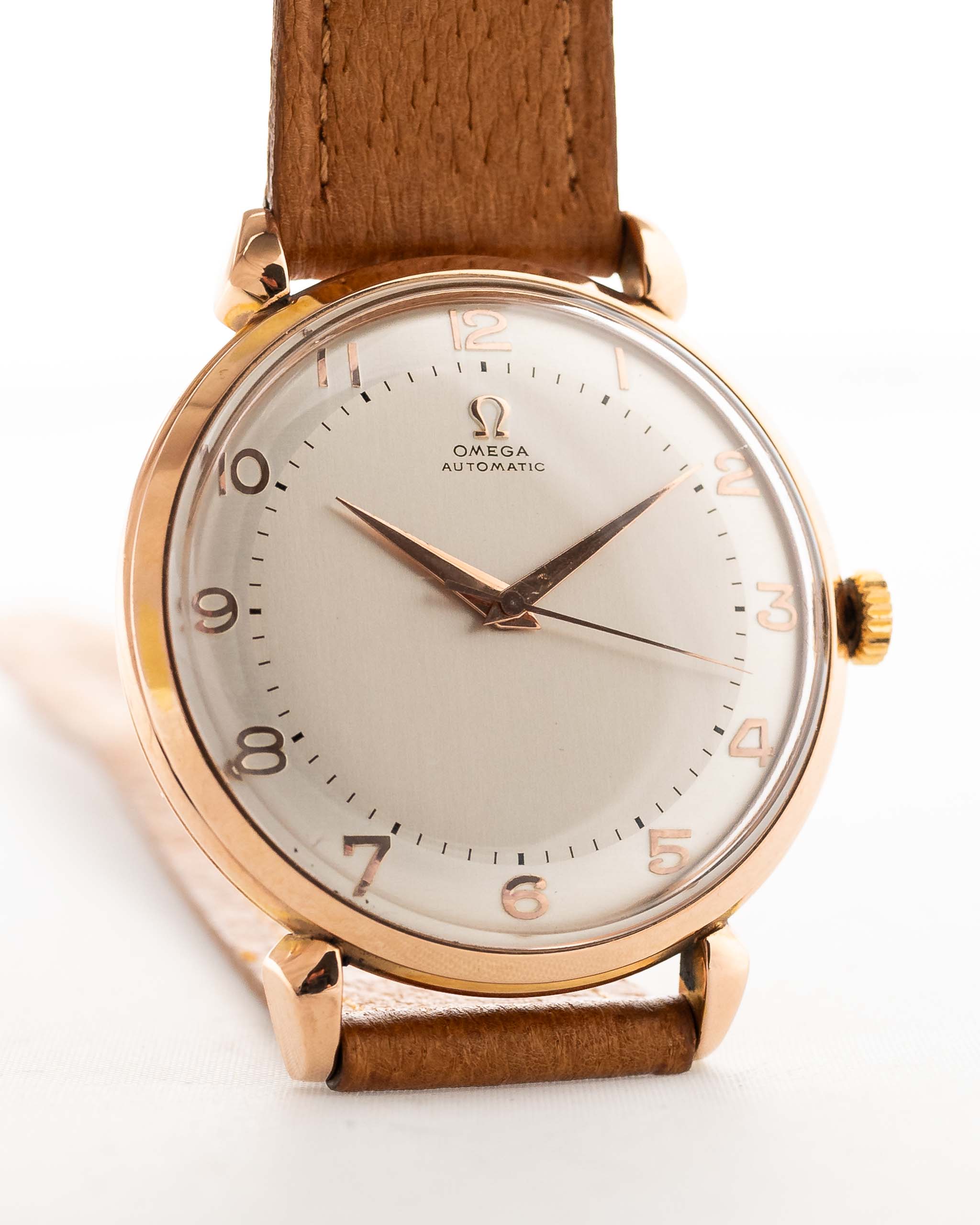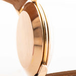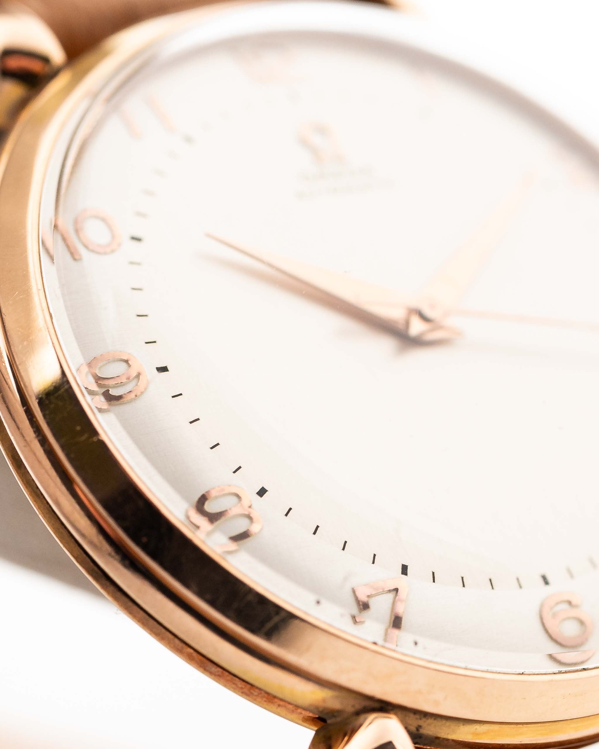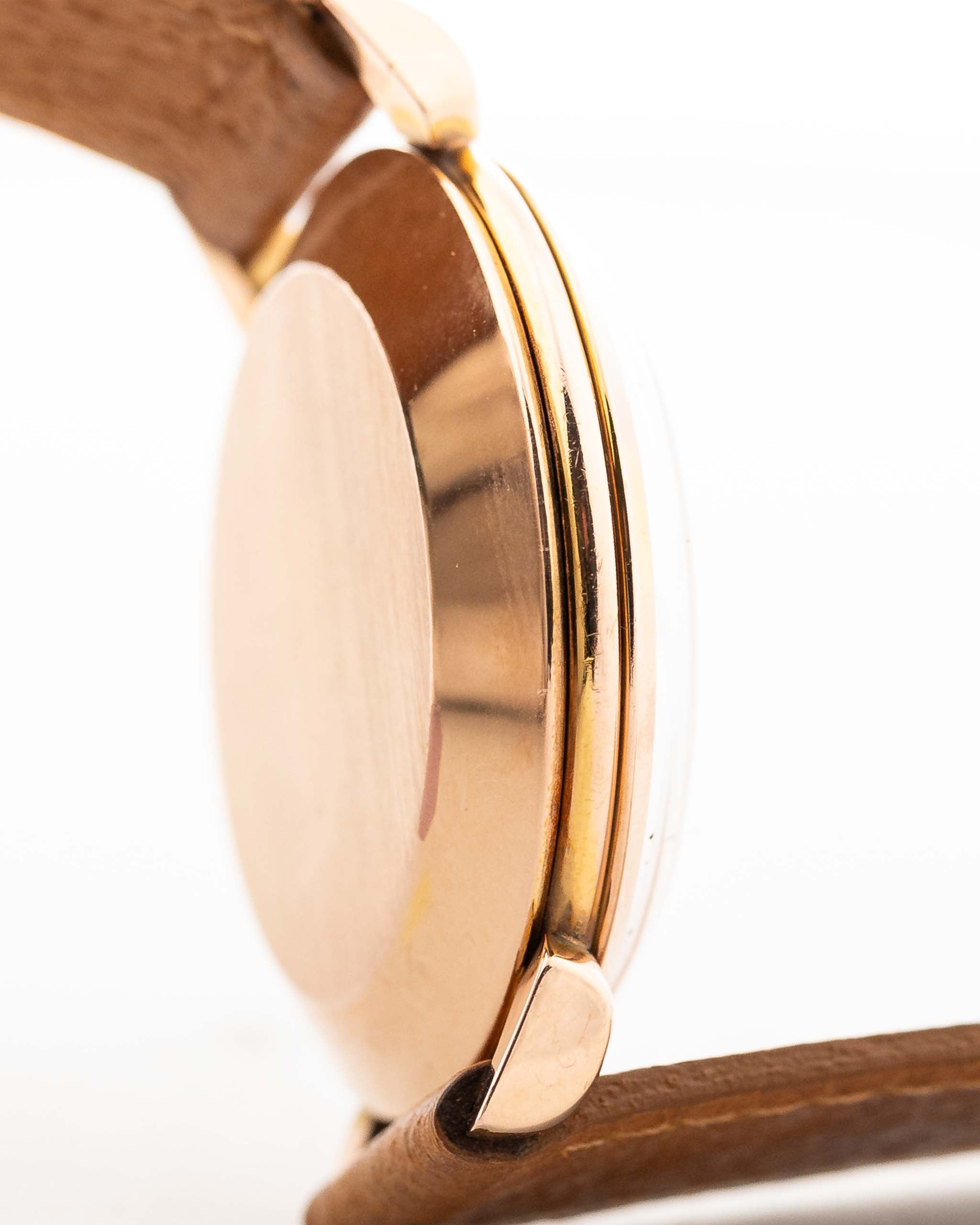 Este Omega de 1947 tiene todo lo que se busca en un reloj de vestir: una caja de 37 mm bien equilibrada, esfera brillante y ligeramente bicolor con números rosas art déco, hermosas agujas de oro rosa y logotipo Omega aplicado. Las voluminosas asas en forma de lágrima y la caja chapada en oro rosa son la guinda del pastel.