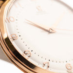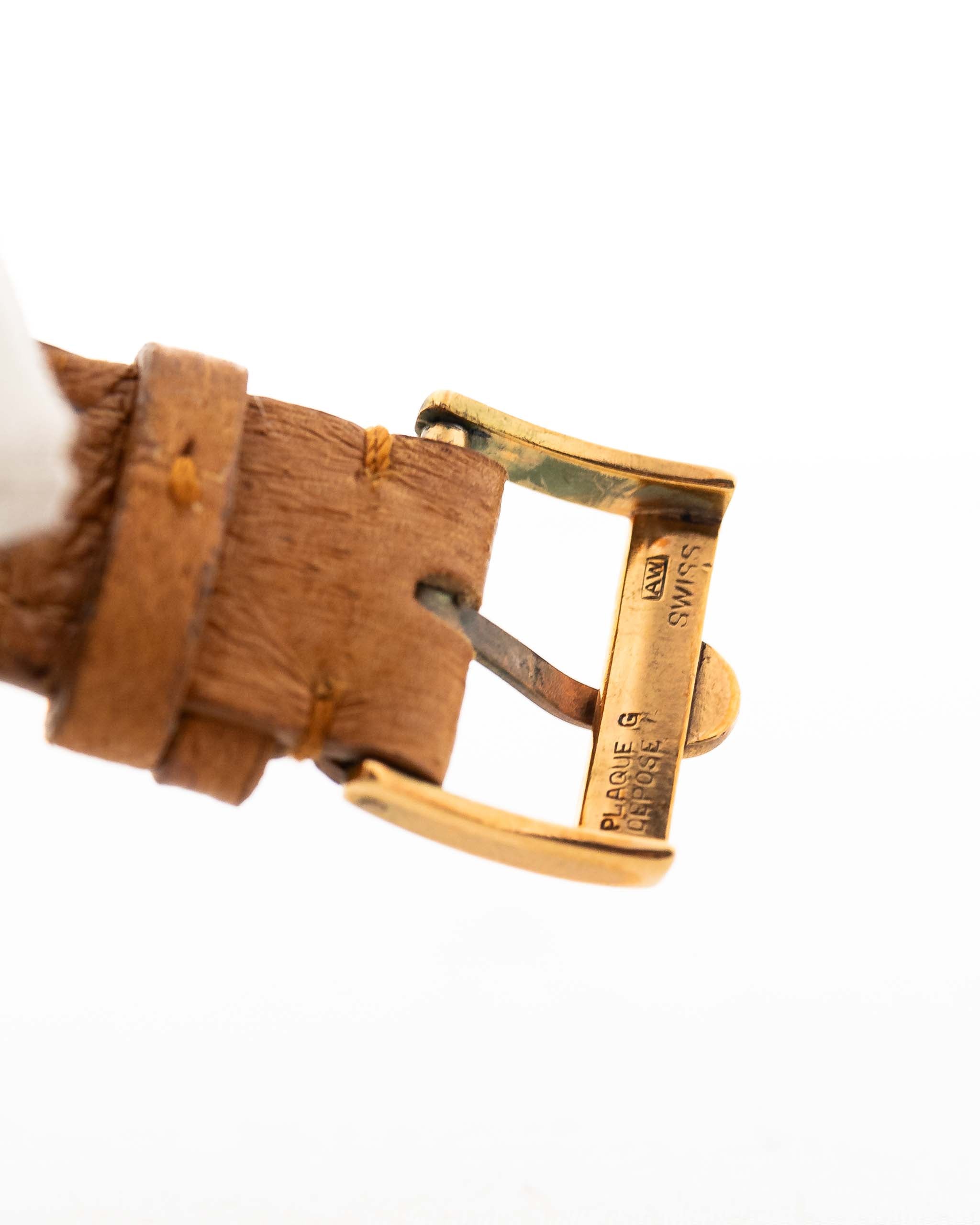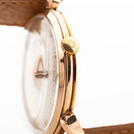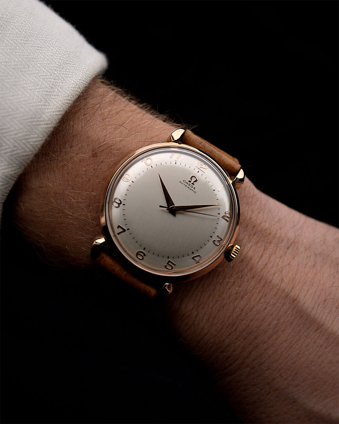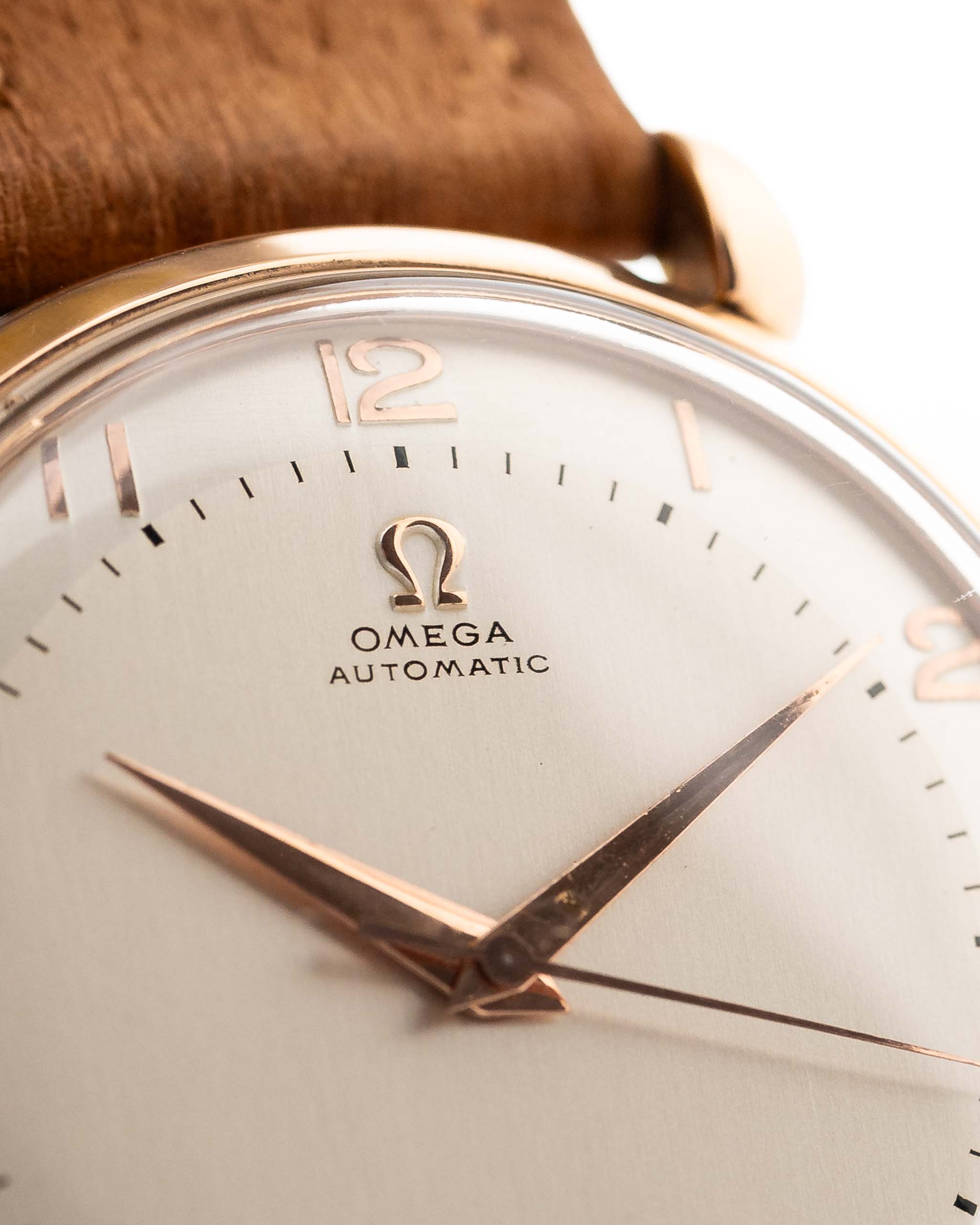 Este Omega de 1947 tiene todo lo que se busca en un reloj de vestir: una caja de 37 mm bien equilibrada, esfera brillante y ligeramente bicolor con números rosas art déco, hermosas agujas de oro rosa y logotipo Omega aplicado. Las voluminosas asas en forma de lágrima y la caja chapada en oro rosa son la guinda del pastel.