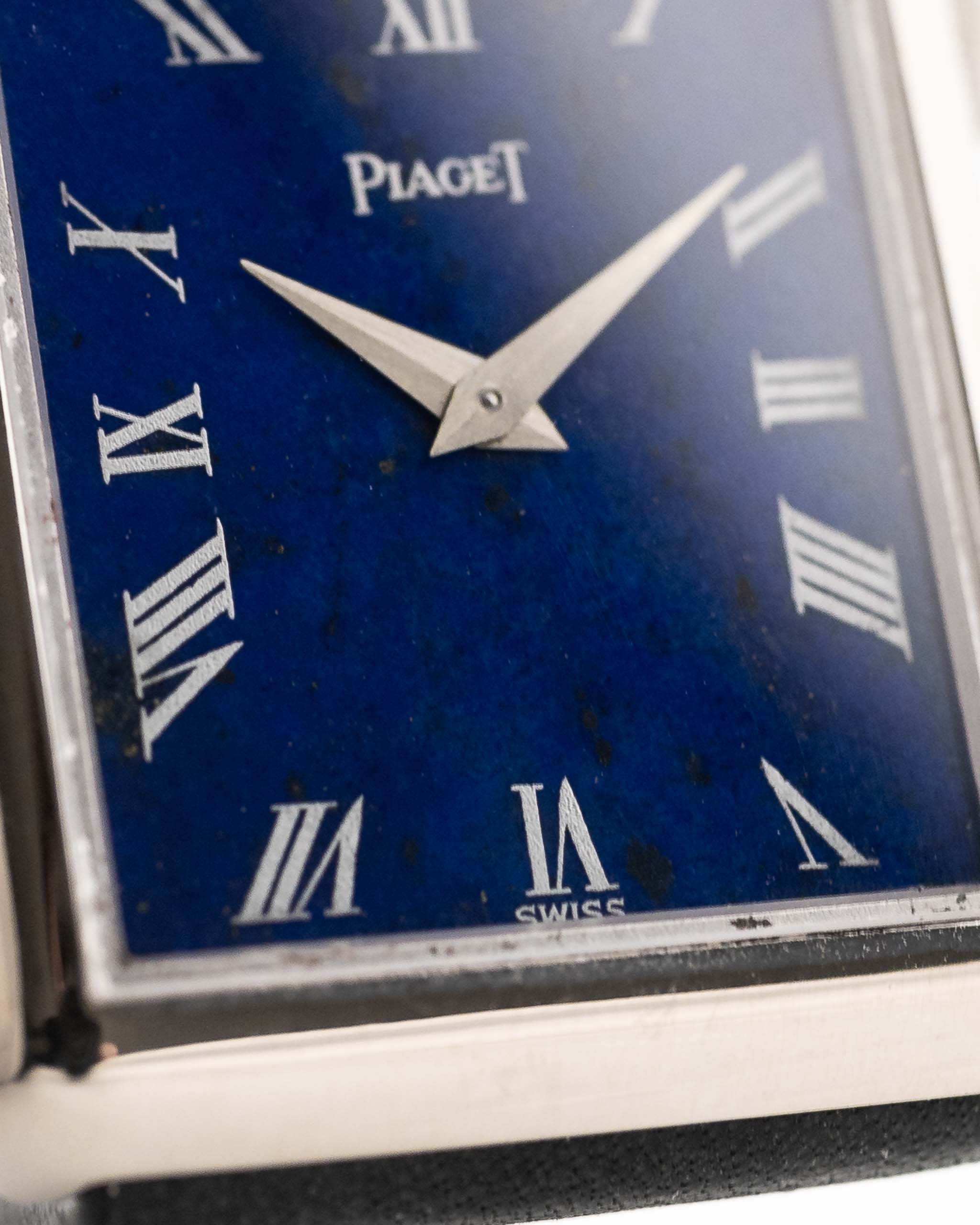 Reloj Piaget Tank 9150 vintage Lapislázuli 18k romano de los años 70 de pulsera. Caja de 23 mm de oro blanco de 18 quilates, esfera de lapislázuli, calibre 9P de cuerda manual, correa de piel negra en perfecto estado.