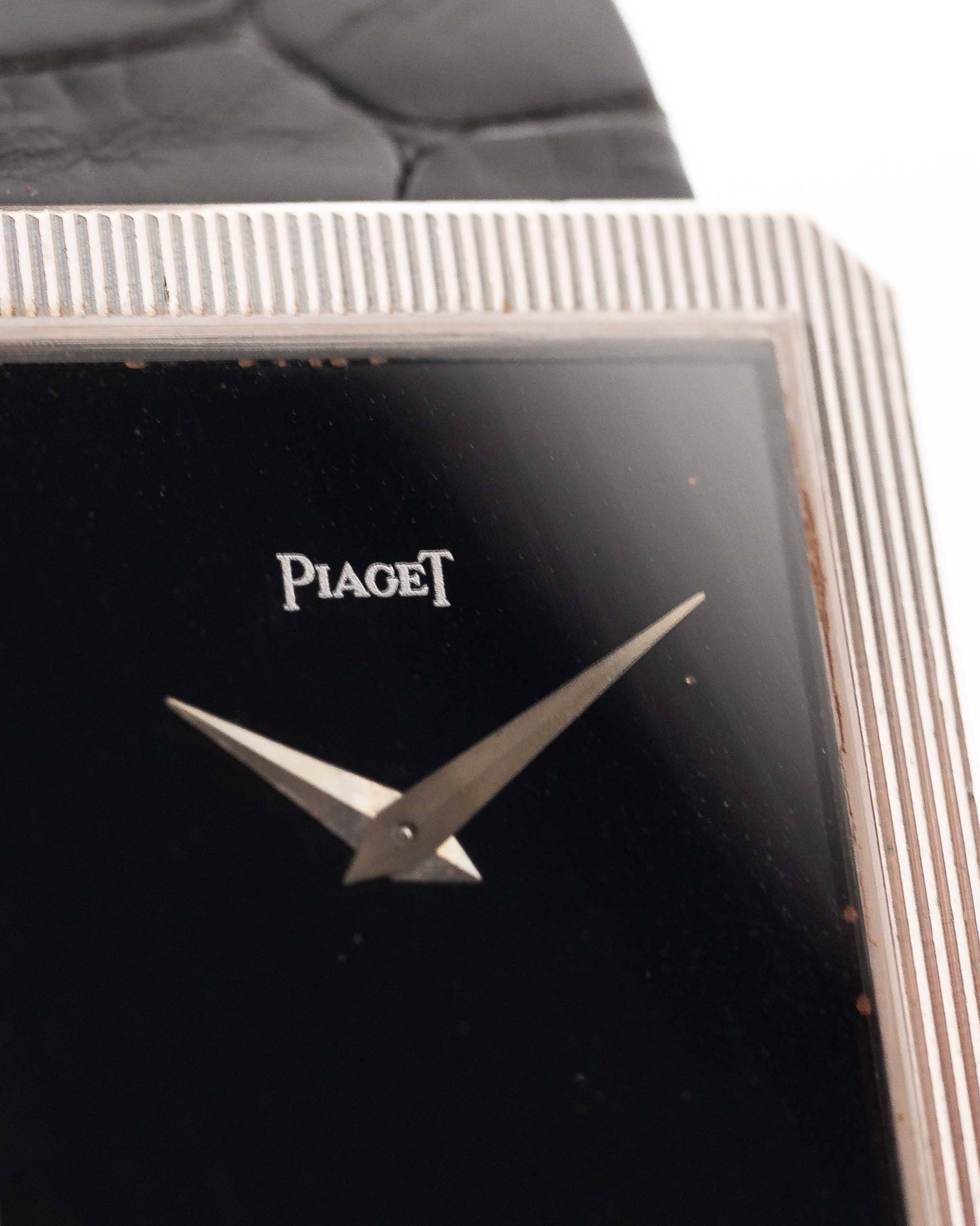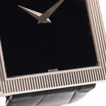 Reloj Piaget Protocole 9154 Onyx vintage de pulsera de los años setenta. Caja de oro blanco de 18 quilates de 25 mm, movimiento de cuerda manual, esfera de ónice y pulsera de piel.