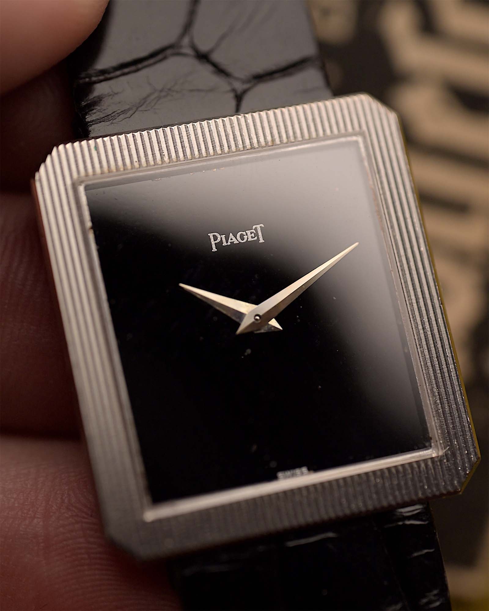 Reloj Piaget Protocole 9154 Onyx en una muñeca con fondo difuminado