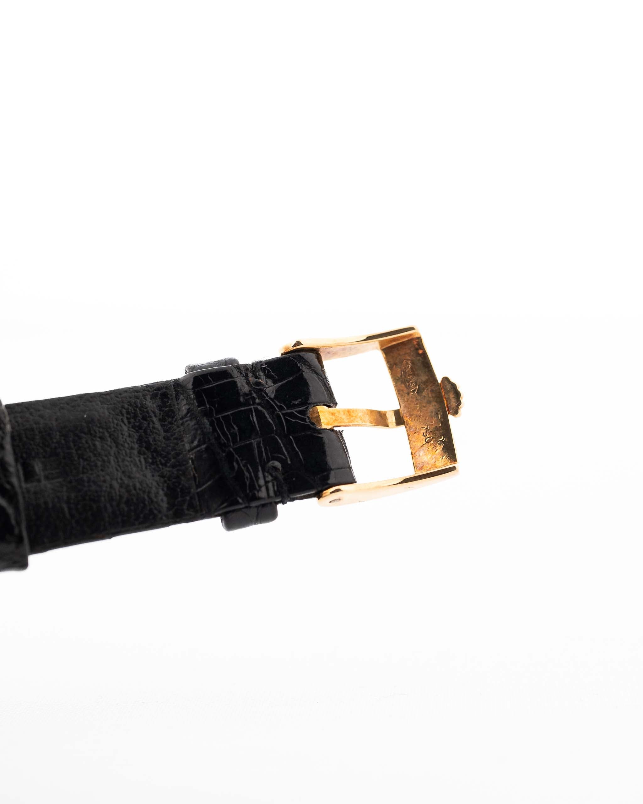 Foto de cerca de un Rolex Cellini 4133 18k de los años 1990. Caja de 31 mm en oro amarillo con movimiento de cuerda manual, esfera plateada, correa original de piel y hebilla de oro de 18 quilates.
