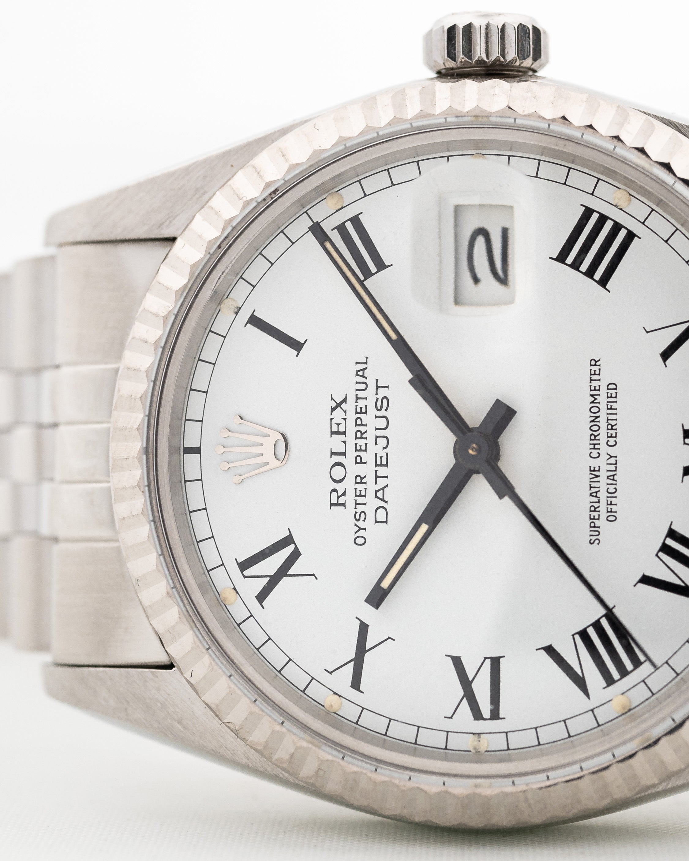 Esta pieza en particular de 1984 destaca por su bisel estriado de oro blanco, una esfera Buckley blanca muy rara e impecable y una caja muy robusta con bordes afilados en un estado excepcional.