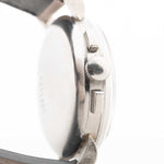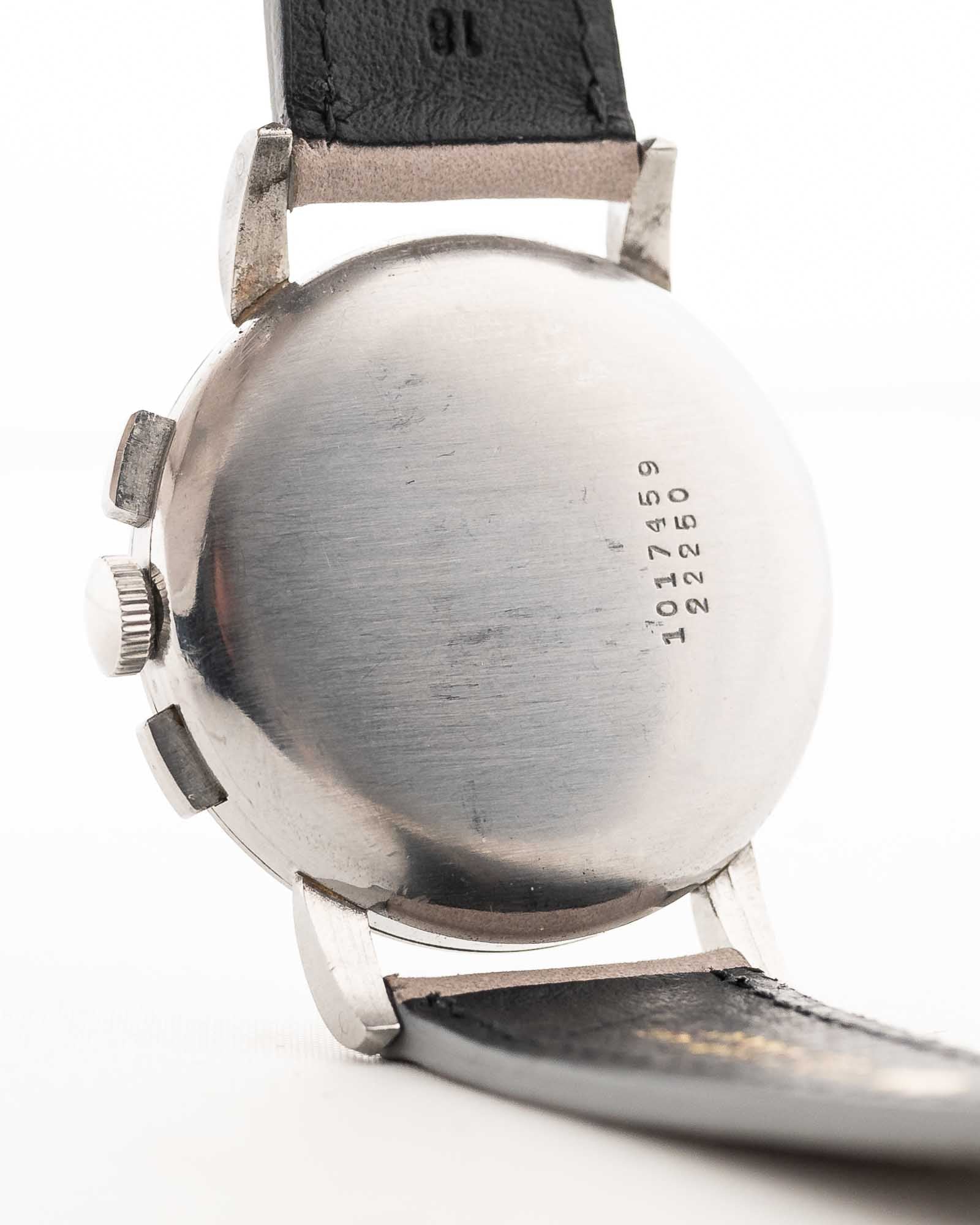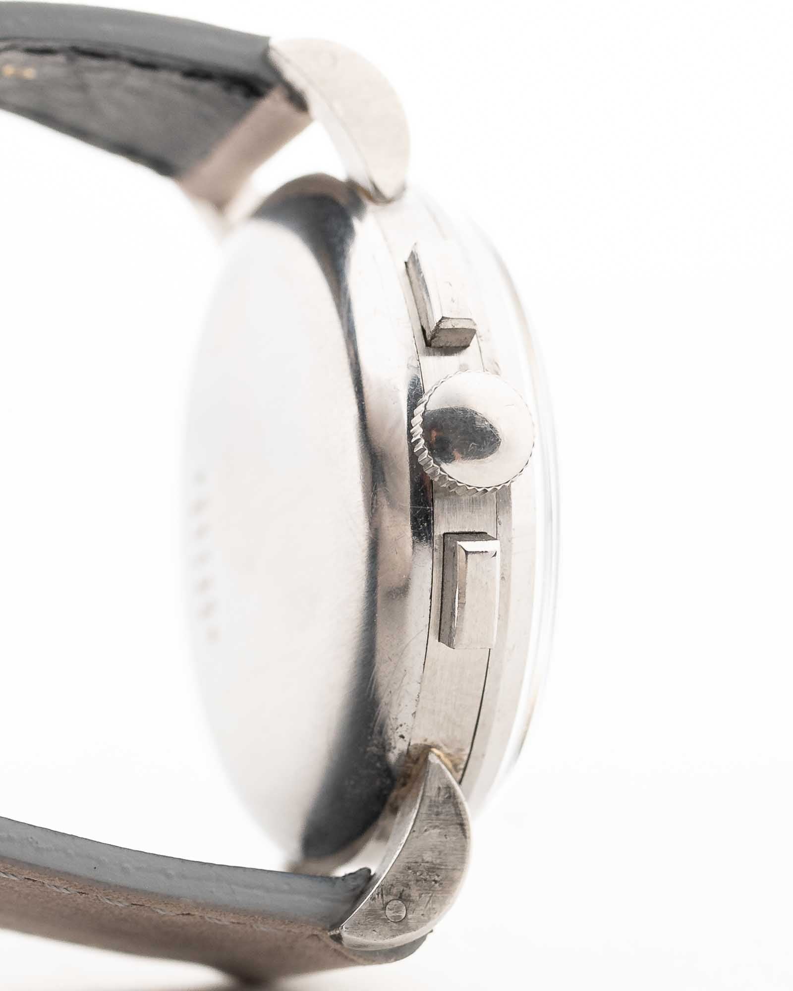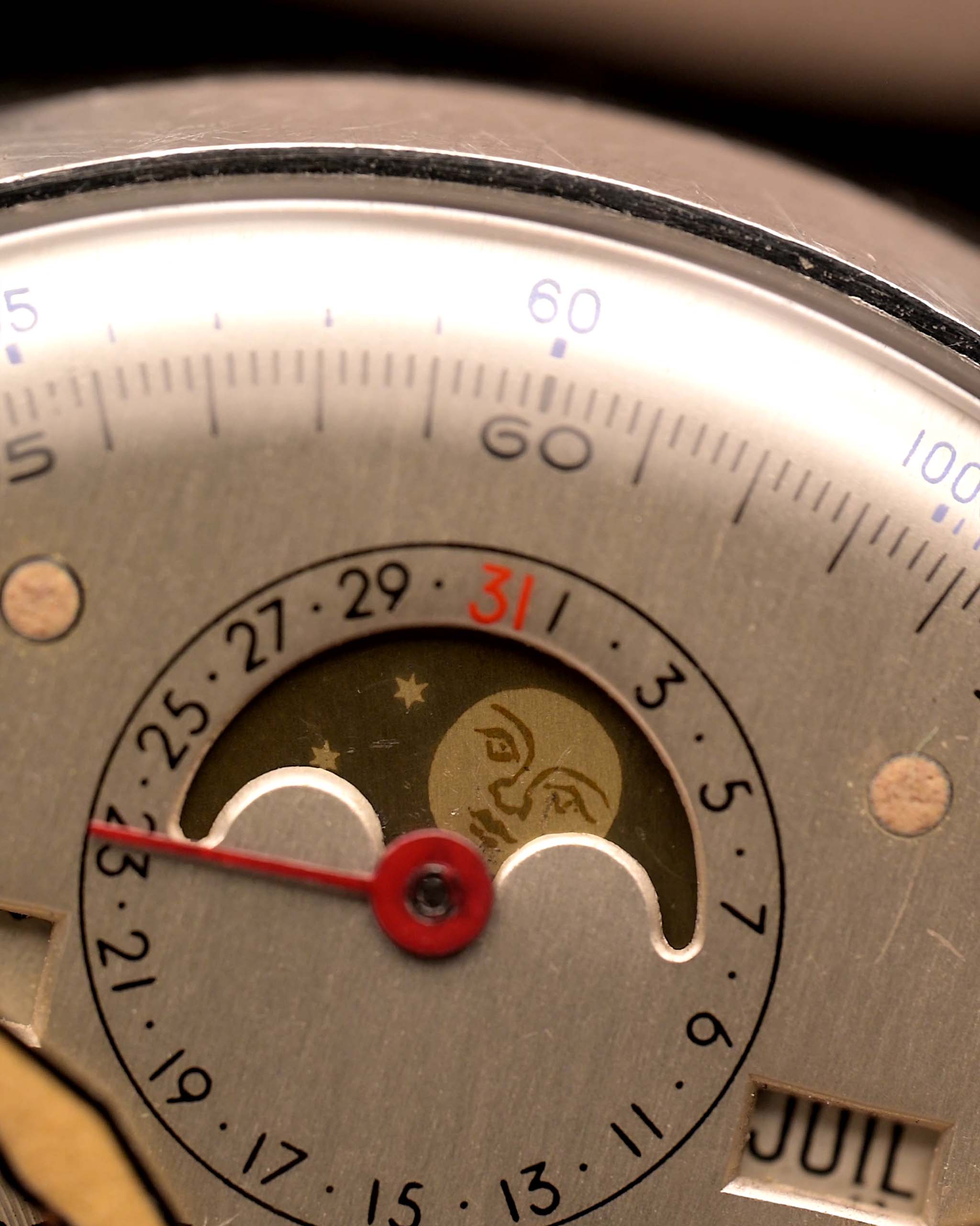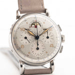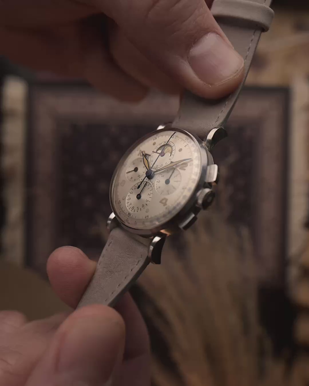 Esta pieza presenta una caja de acero inoxidable bellamente conservada con unas raras asas en forma de araña, que le confieren una escultural presencia en la muñeca. La disposición de la esfera, que combina cronógrafo, triple calendario y fases lunares, es uno de los diseños más armoniosos e icónicos de la época.