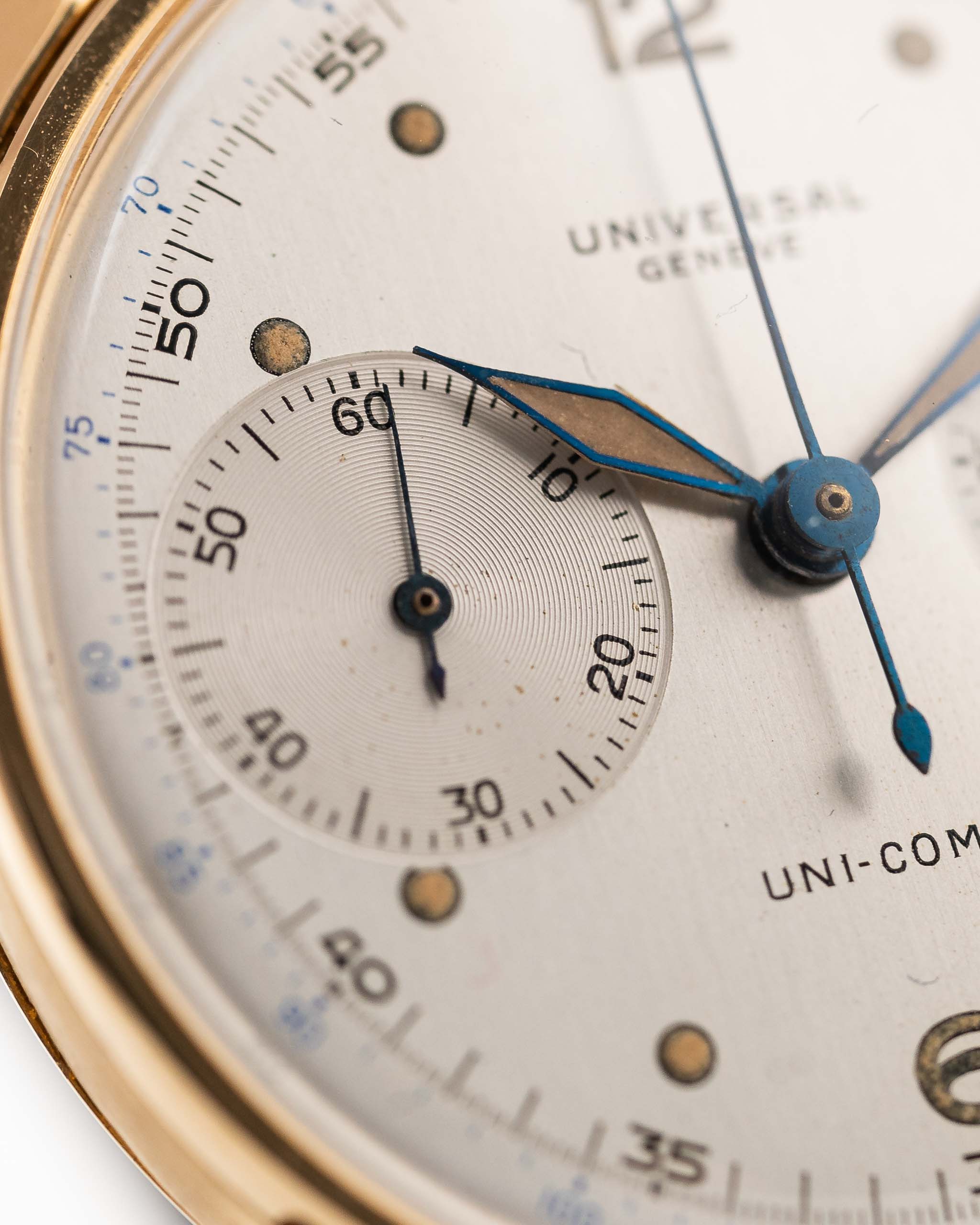 Vintage Universal Geneve 5166 Uni Compax oro de 18 quilates 1950 plata esfera cepillada vertical primer plano