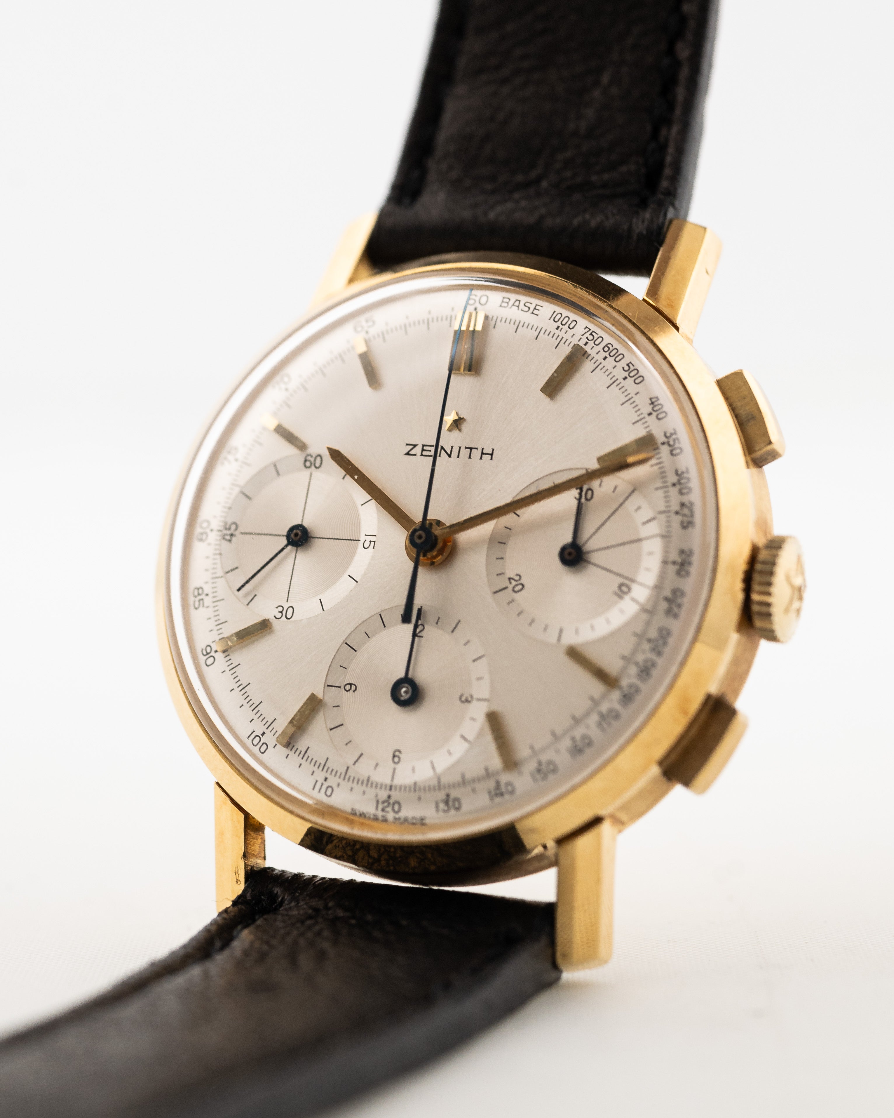 He aquí un magnífico ejemplo de que Zenith es y siempre ha sido un fabricante suizo de primera línea de algo más que los cronógrafos El Primero. Nuestro ejemplo está equipado con el apreciado calibre 146 HP de Zenith, un movimiento cronógrafo con rueda de pilares diseñado por Martel, una empresa que fue absorbida por Zenith en 1960 y que, antes de esa fecha, suministraba movimientos a otros fabricantes como Universal Genève.