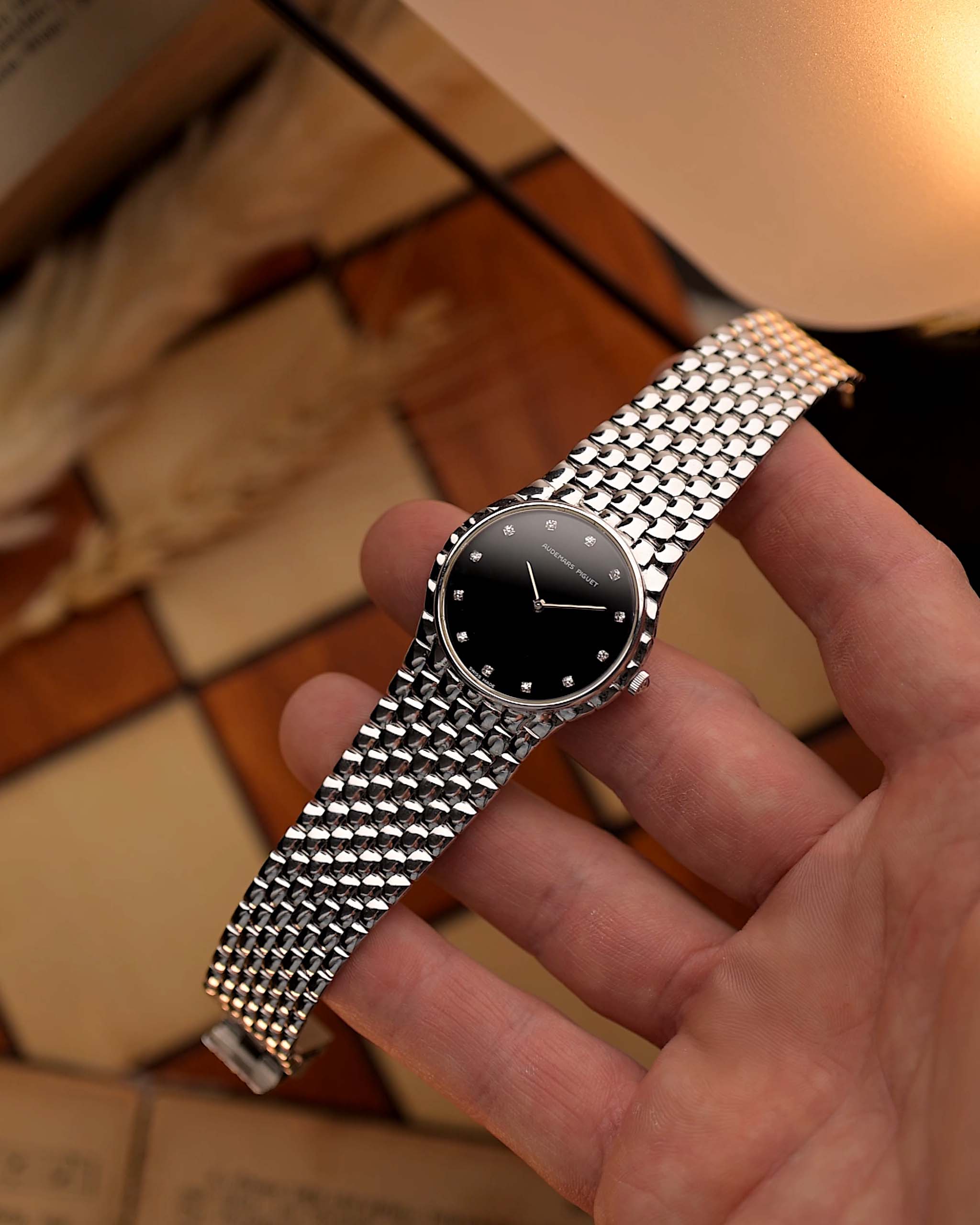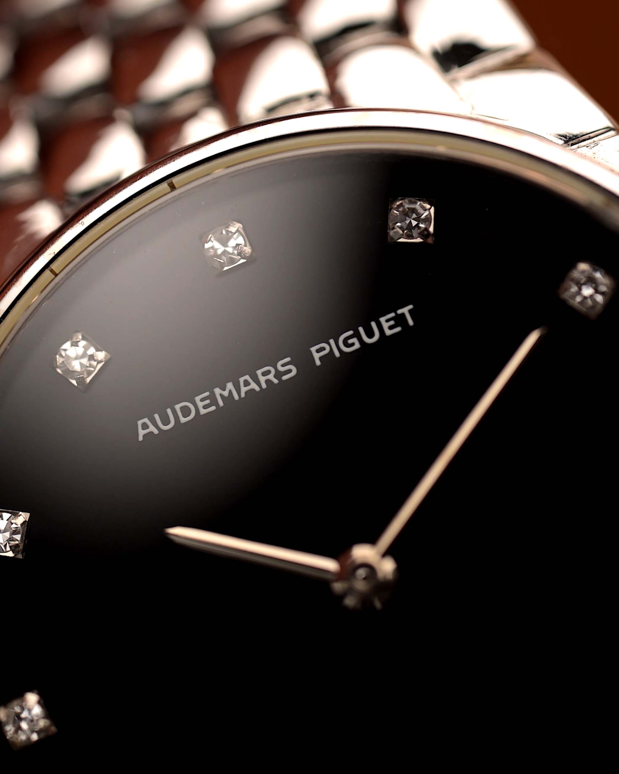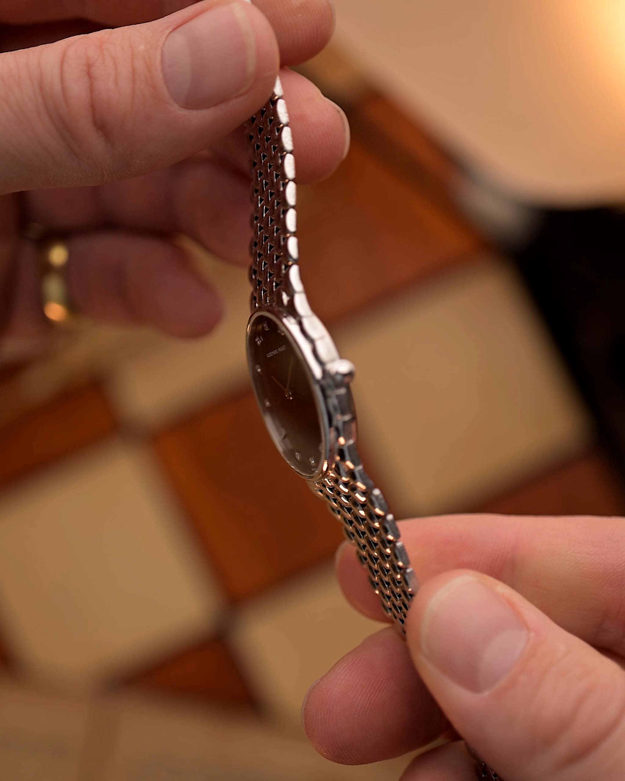 La caja de oro blanco de 18 quilates y 31mm se combina con un brazalete de oro integrado meticulosamente acabado a mano, lo que confiere al reloj su característica fluidez serpentina, una forma que parece deslizarse sin esfuerzo por la muñeca. La esfera negra, que brilla bajo diferentes ángulos de luz, está adornada con 12 índices de diamantes engastados en fábrica, lo que añade una discreta opulencia a su carácter minimalista.