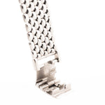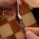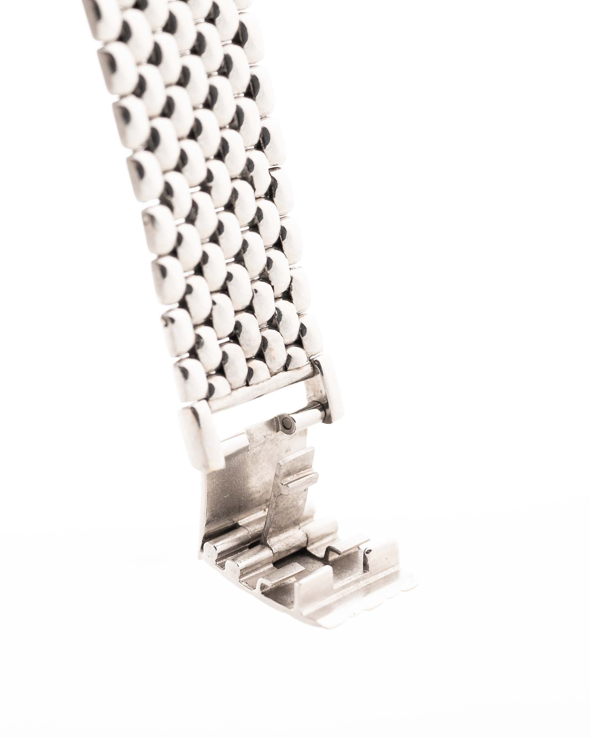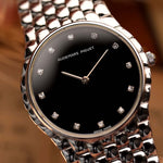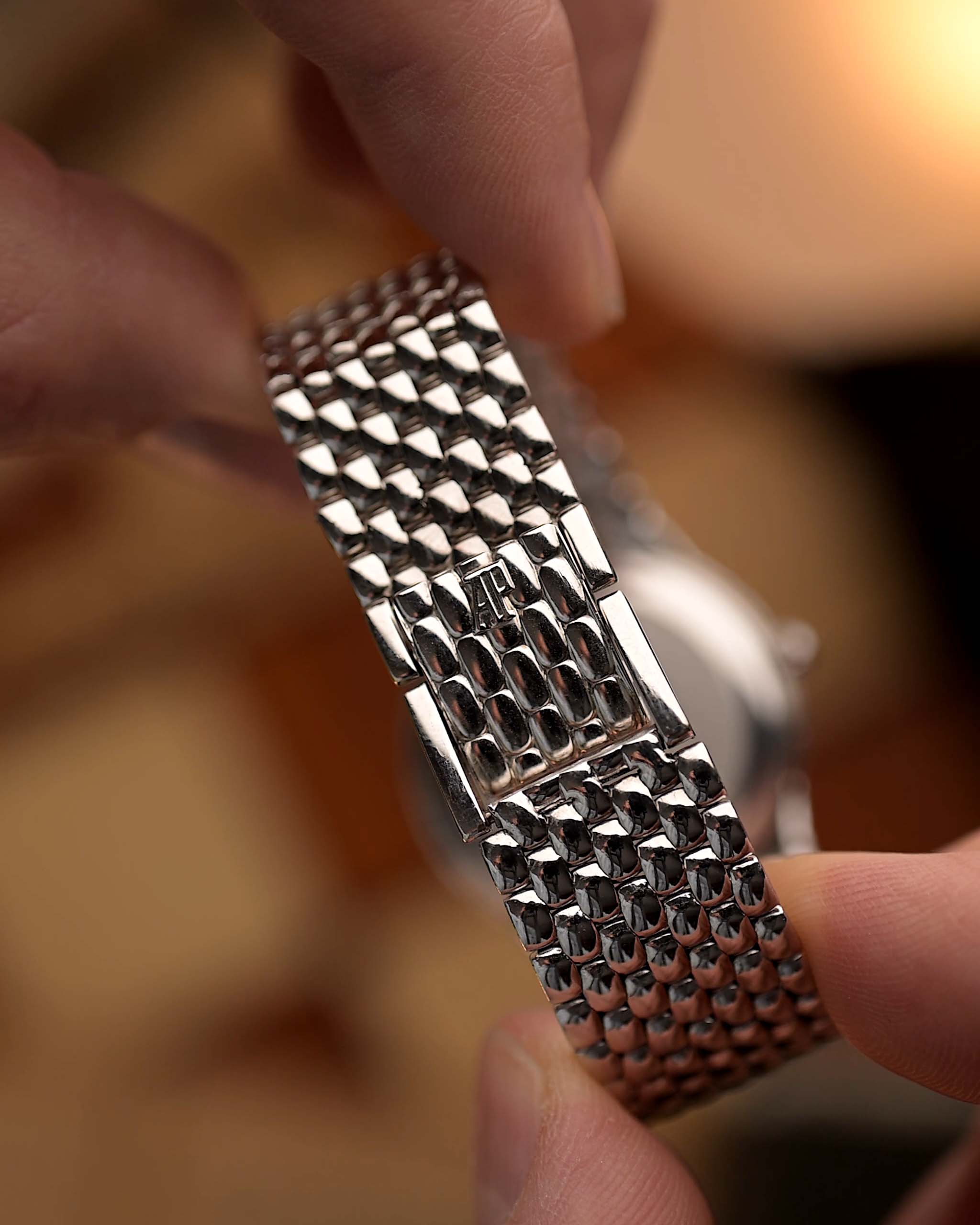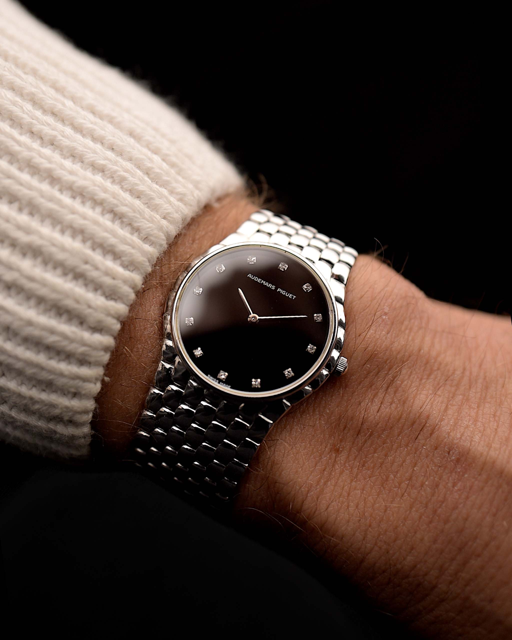 La caja de oro blanco de 18 quilates y 31mm se combina con un brazalete de oro integrado meticulosamente acabado a mano, lo que confiere al reloj su característica fluidez serpentina, una forma que parece deslizarse sin esfuerzo por la muñeca. La esfera negra, que brilla bajo diferentes ángulos de luz, está adornada con 12 índices de diamantes engastados en fábrica, lo que añade una discreta opulencia a su carácter minimalista.