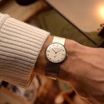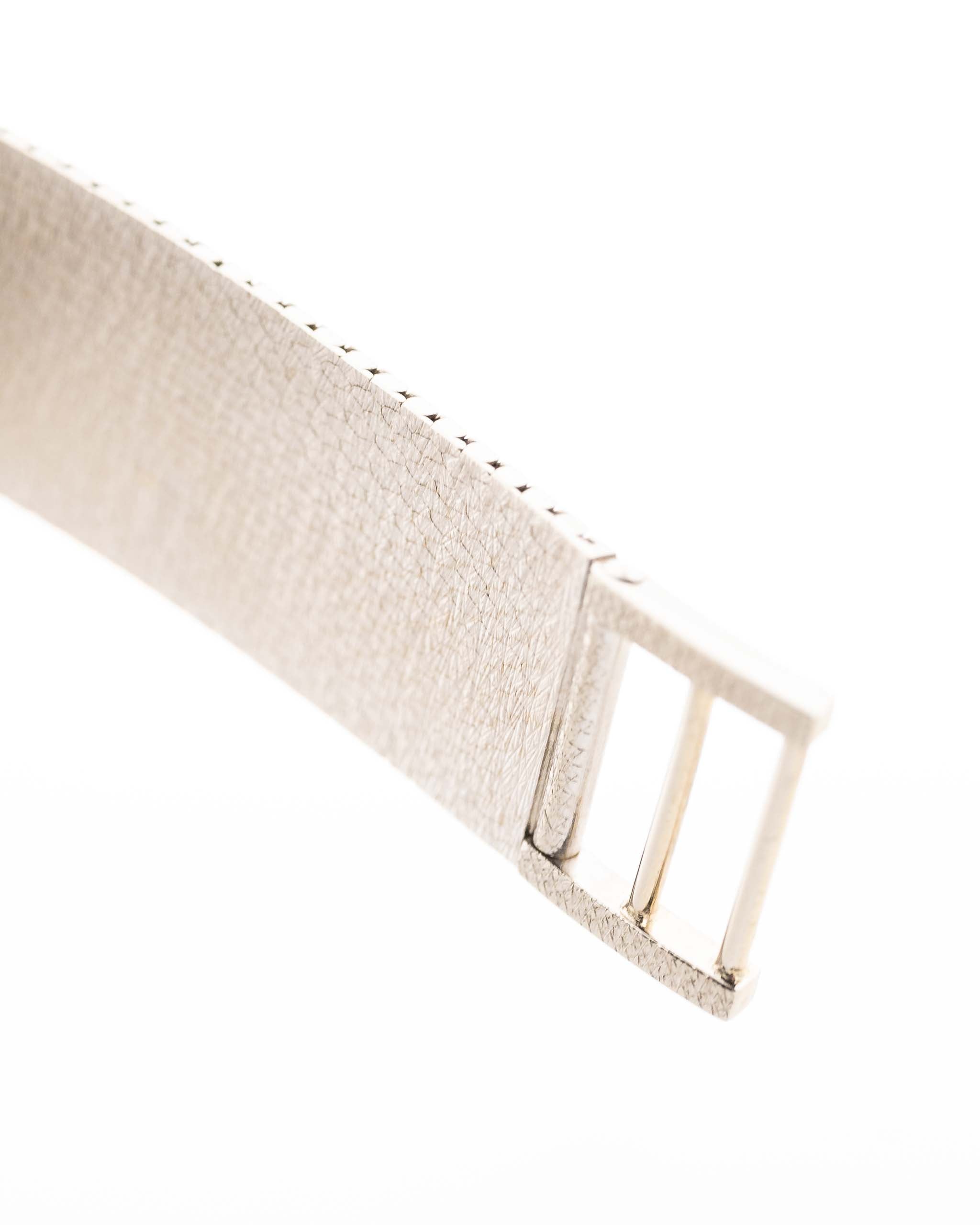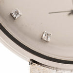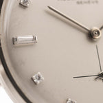 La esfera plateada cuenta con índices horarios de diamantes engastados en fábrica: sutiles, equilibrados e inconfundiblemente lujosos. Junto con las finas agujas bastón y la disposición minimalista, crea una estética discretamente sofisticada que se siente atemporal incluso hoy en día.