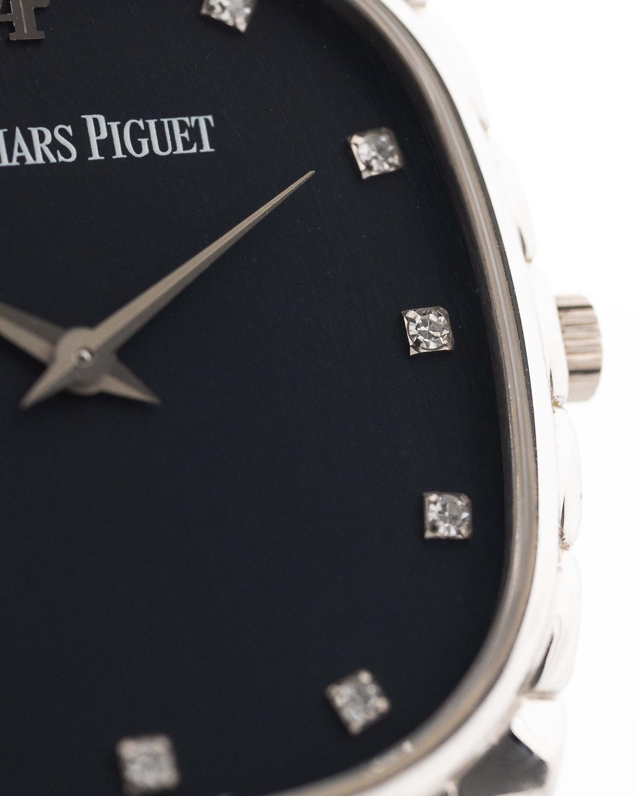 Primer plano de un reloj Cobra Vintage Audemars Piguet, oro blanco de 18 quilates, esfera de diamantes azul noche, movimiento manual, brazalete integrado, fondo borroso