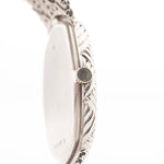 Este raro Audemars Piguet de finales de los años 70 es un ejercicio de tranquila opulencia. Elaborado íntegramente en oro blanco de 18 quilates, su exclusiva caja octogonal-elíptica alberga una impecable esfera de ónice negro salpicada por doce índices de diamantes engastados en fábrica: lujo discreto en su máxima expresión.
