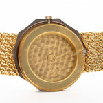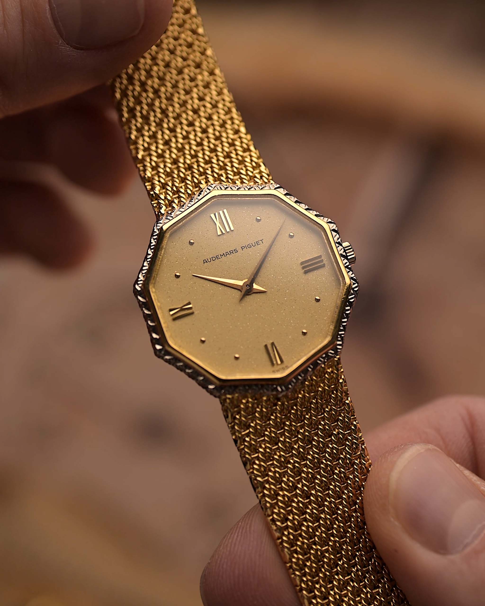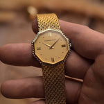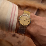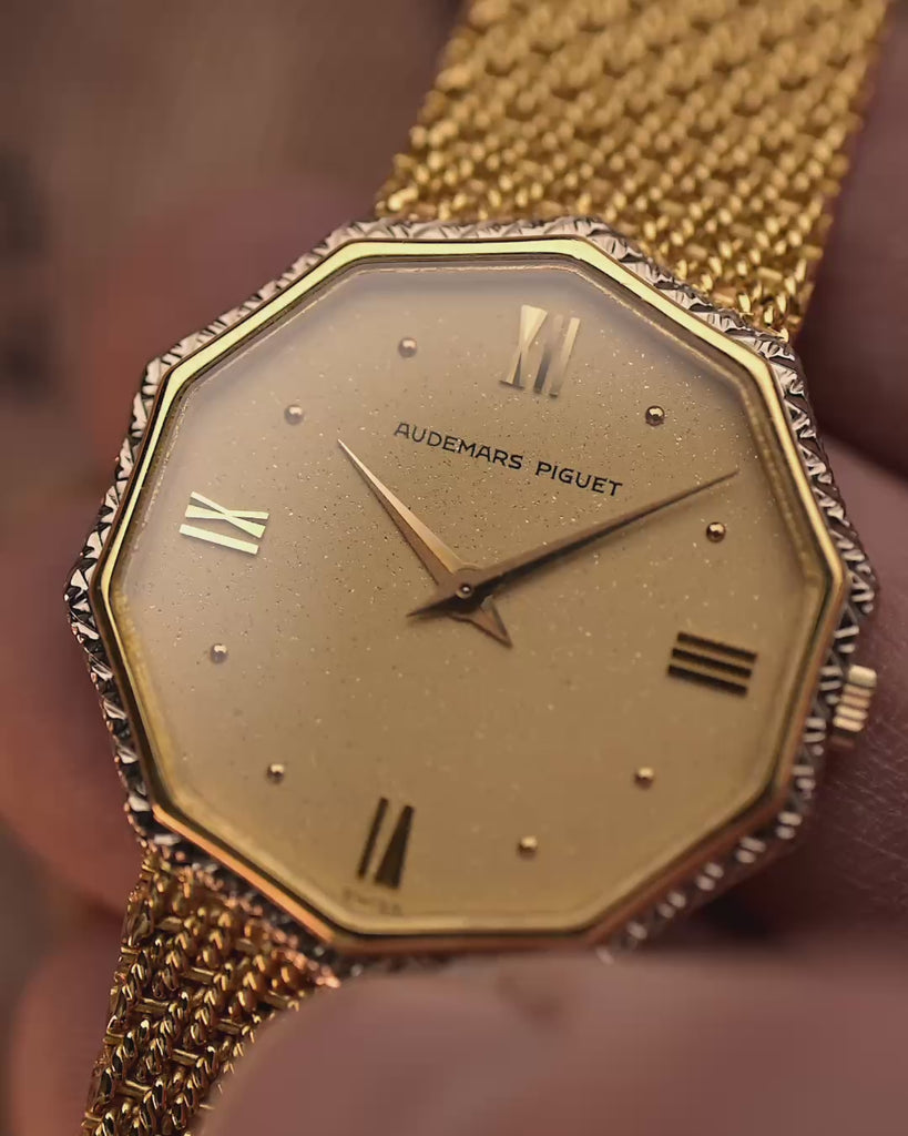 Un Audemars Piguet poco común y llamativo de principios de la década de 1980, que se caracteriza por su distintiva caja octogonal y sus refinados detalles en dos tonos. Fabricado en oro amarillo de 18 quilates, el reloj cuenta con una impecable esfera de aventurina dorada con el logotipo de AP, números romanos en las 12, 3, 6 y 9, y unas elegantes agujas alfa.