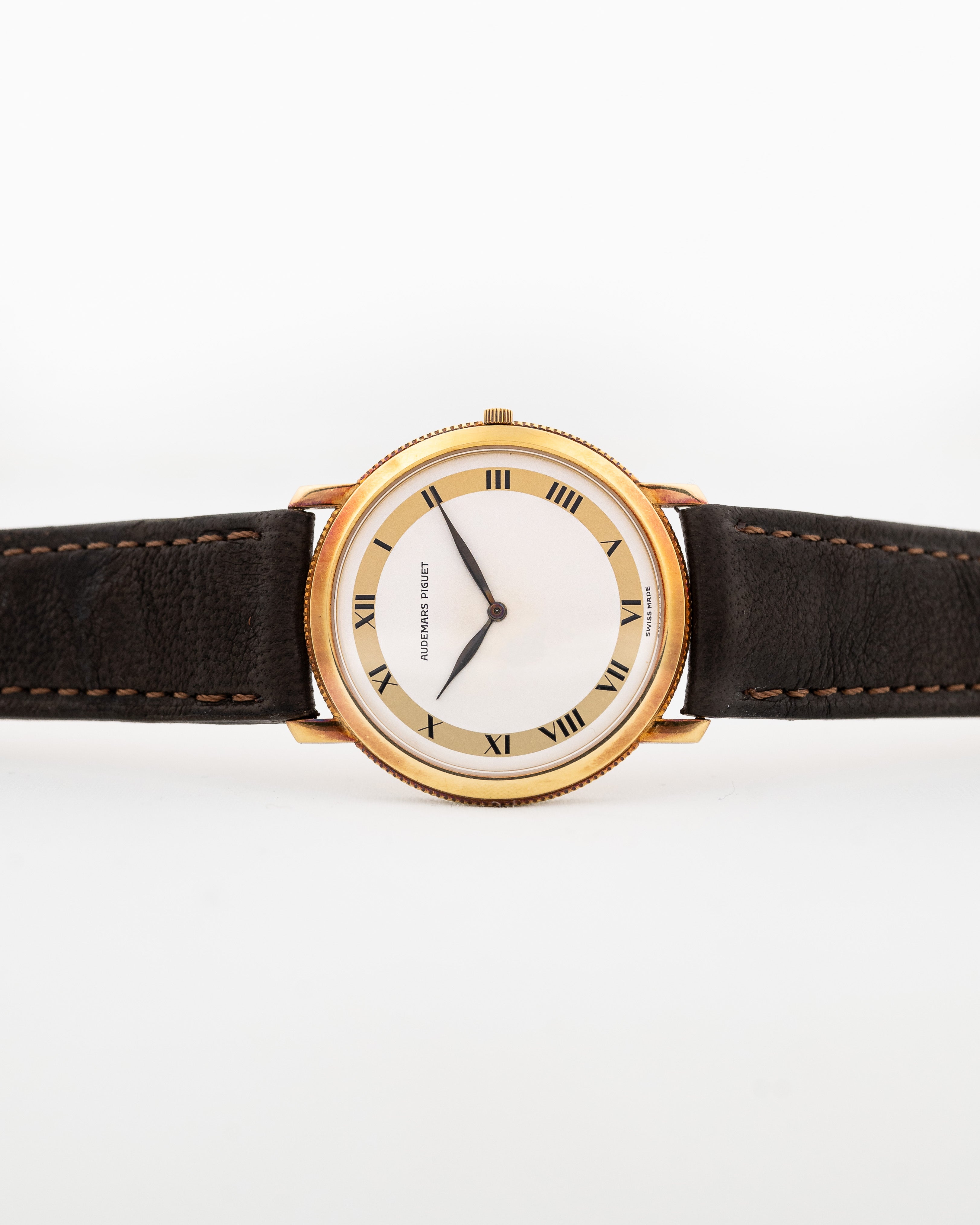 Aquí tenemos un reloj de vestir Audemars Piguet de la década de 1980 bellamente acabado con una esfera romana de dos tonos increíblemente diseñada. Esta pieza en particular se destaca por su hermosa condición sin pulir y un fuerte 18k caja de oro amarillo ultra-delgada.