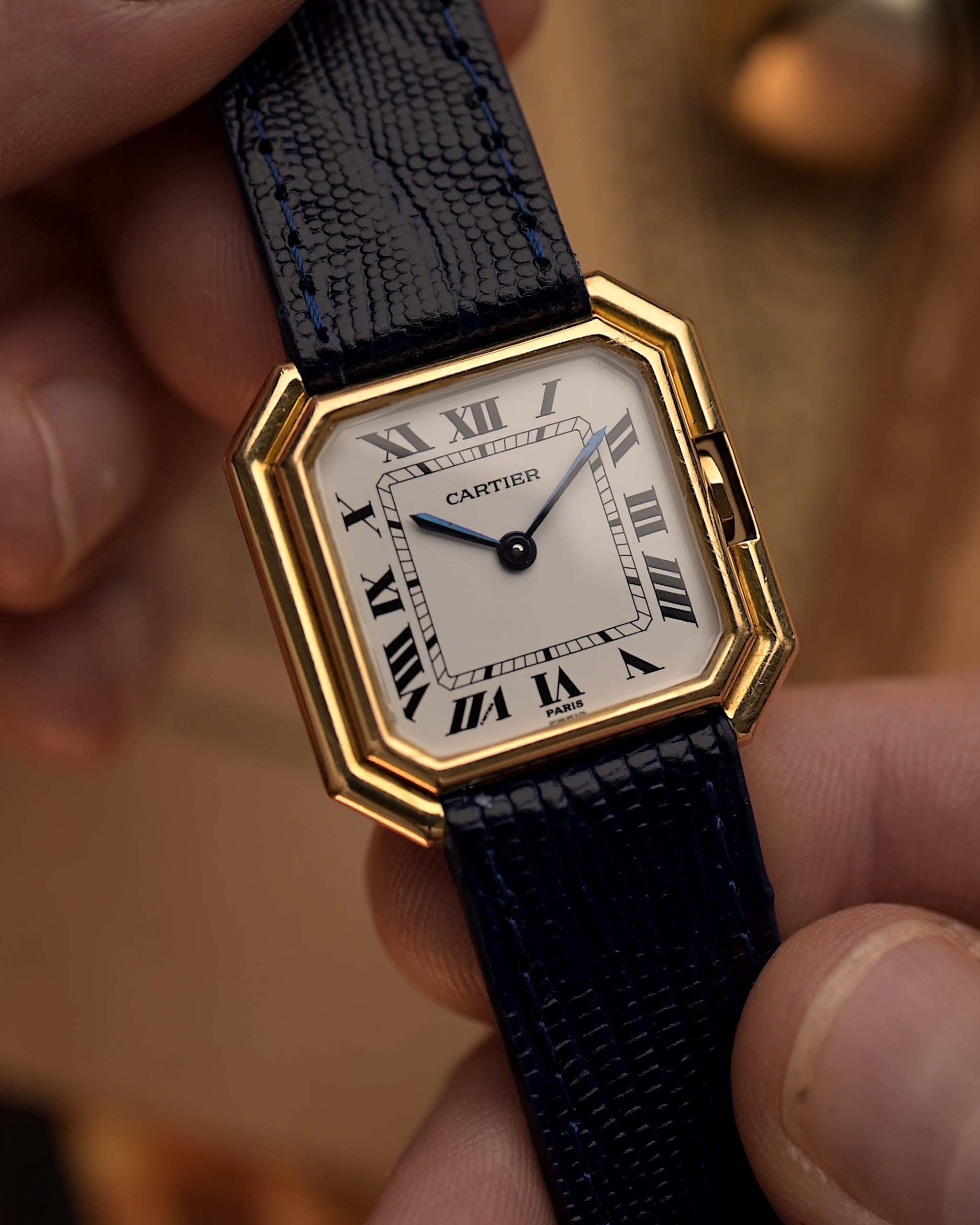 Con su distintiva caja cuadrada y sus esquinas recortadas, el Cartier Ceinture reimaginala elegancia de la hebilla del cinturón («ceinture» en francés) en una pieza de escultura relojera. Esta versión de 27 mm, la más grande de las dos reediciones de principios de la década de 1970, es la codiciada variante con esfera «PARIS», un sello distintivo que indica que se vendió en la tienda insignia original de Cartier en París.