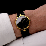 Aquí tenemos un Cartier Tank Vermeil vintage con una elegante esfera negra y detalles dorados de la década de 1990. Presenta una caja de plata 925 chapada en oro, la corona cabujón azul original y una esfera en perfecto estado.