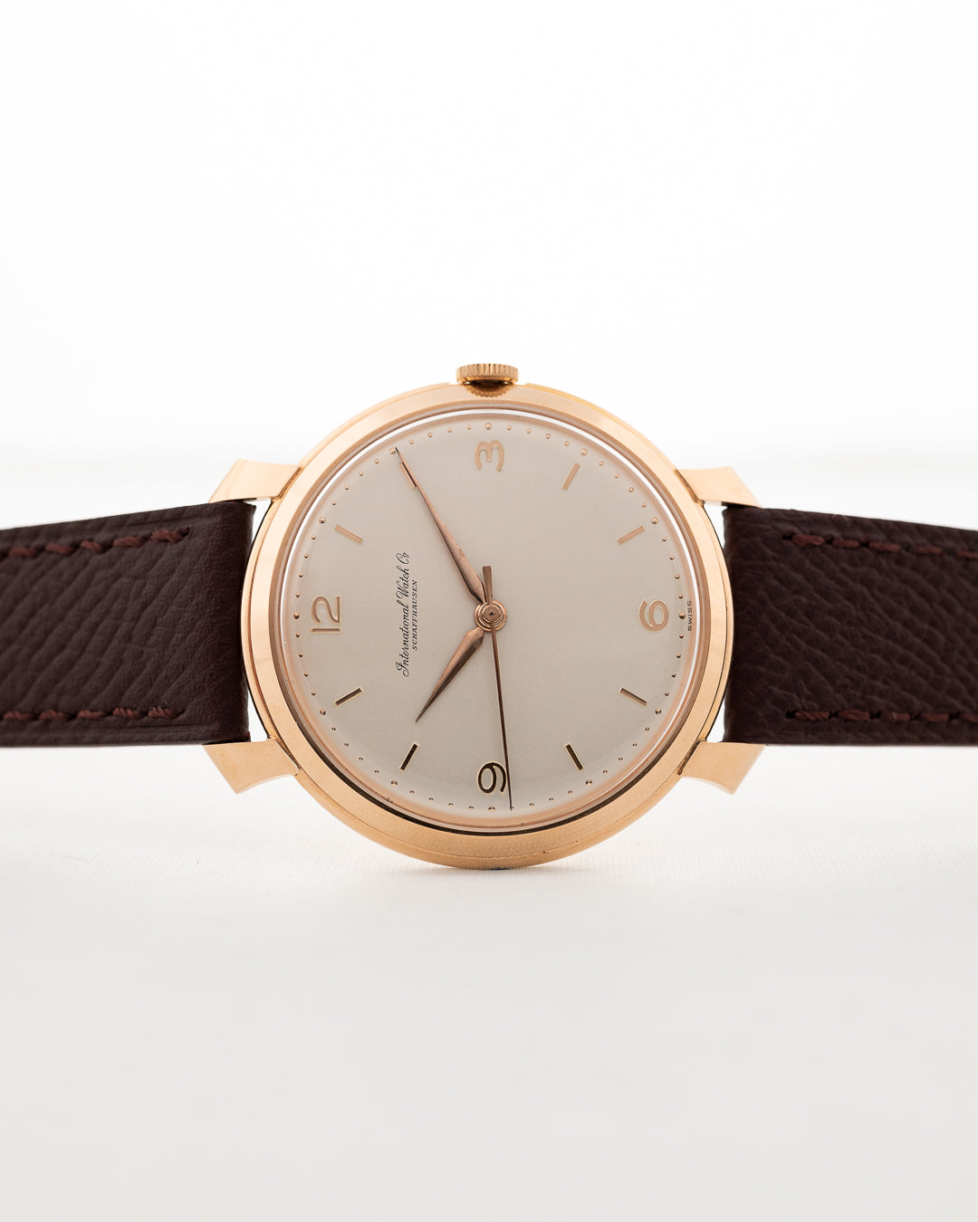 IWC ha producido una gran variedad de relojes de pulsera desde muy pronto, desde relojes de vestir hasta relojes de aviación. Este ejemplo, en oro rosa de 18 quilates con asas de aleta de tiburón, sería una constante en las colecciones de cualquiera, sobre todo porque se presenta en estado NOS.