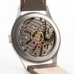 Nuestro ejemplar de 1942, con caja de acero inoxidable, asas ligeramente angulosas y una hermosa esfera de color dorado de dos tonos para los segundos secundarios, seguiría siendo una constante en las colecciones de cualquiera, sobre todo por presentarse en este estado excepcional.