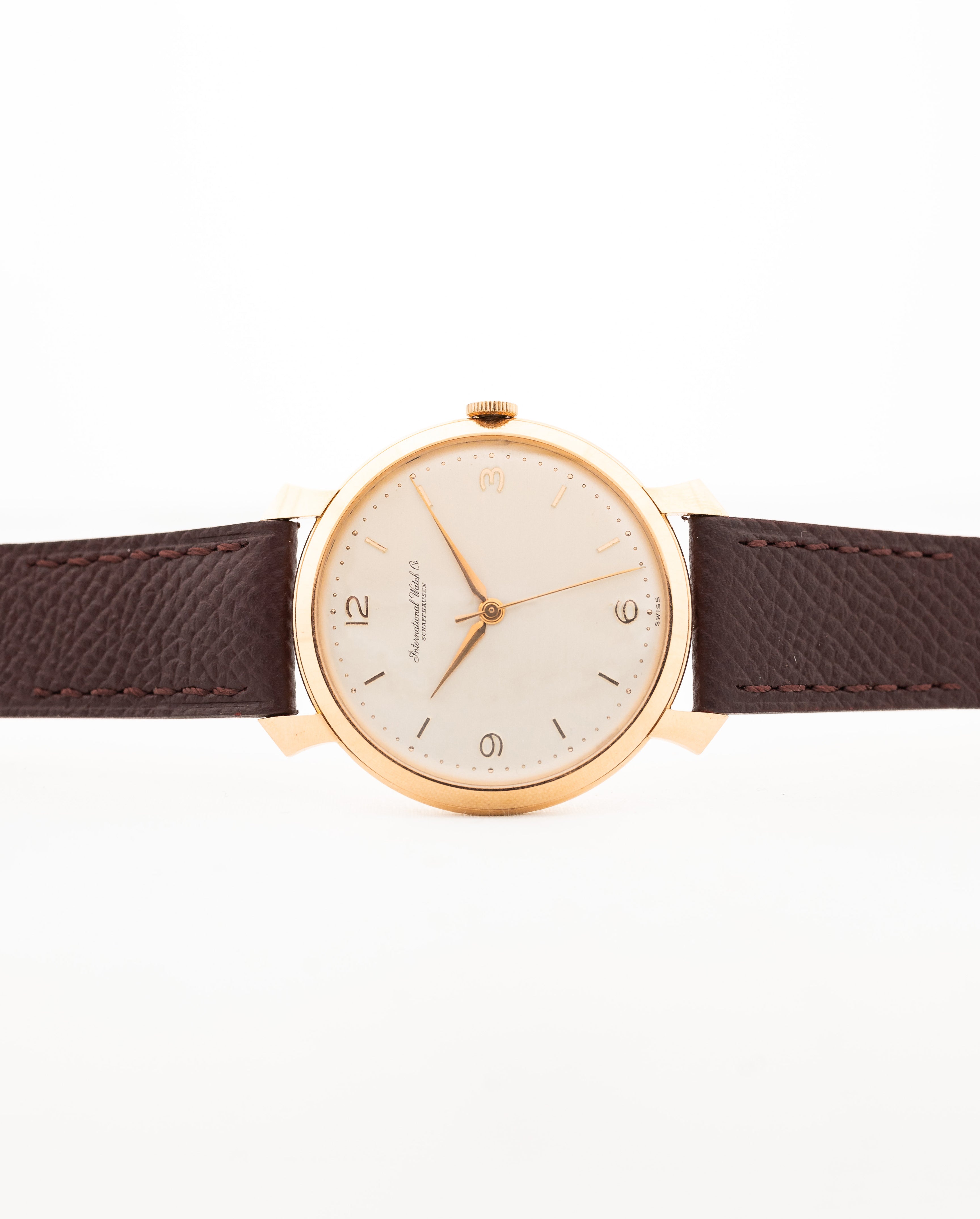IWC ha producido una gran variedad de relojes de pulsera desde muy pronto, desde relojes de vestir hasta relojes de aviación. Este ejemplar, en oro rosa de 18 quilates, con su esfera blanca/plateada, sería una constante en las colecciones de cualquiera, sobre todo porque viene con unas preciosas asas de aleta de tiburón.