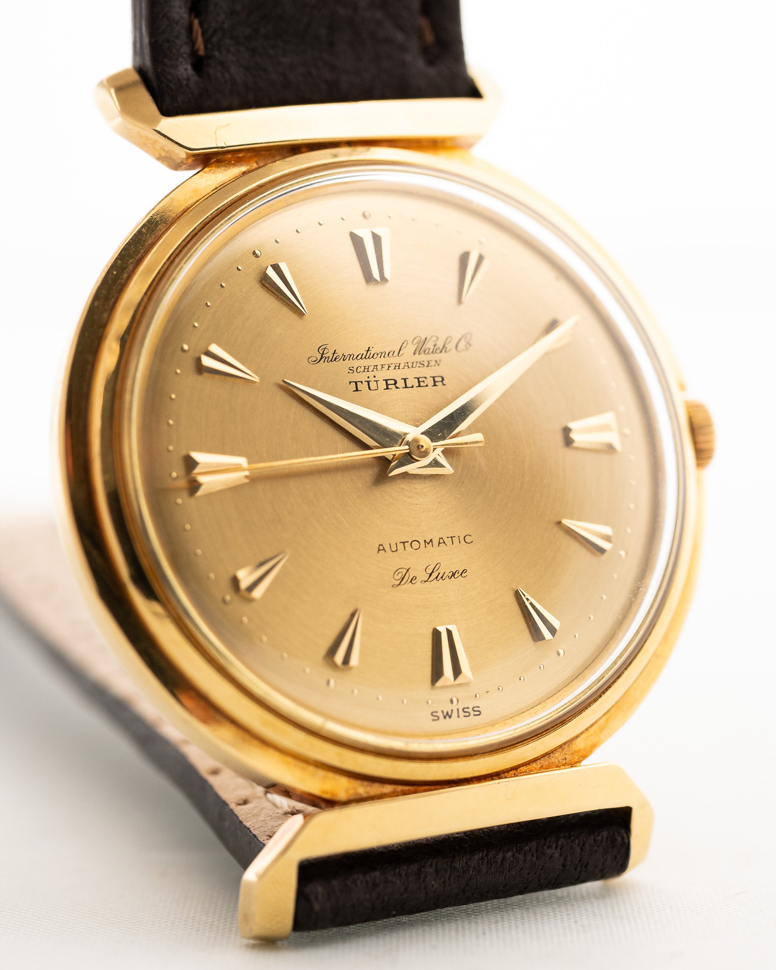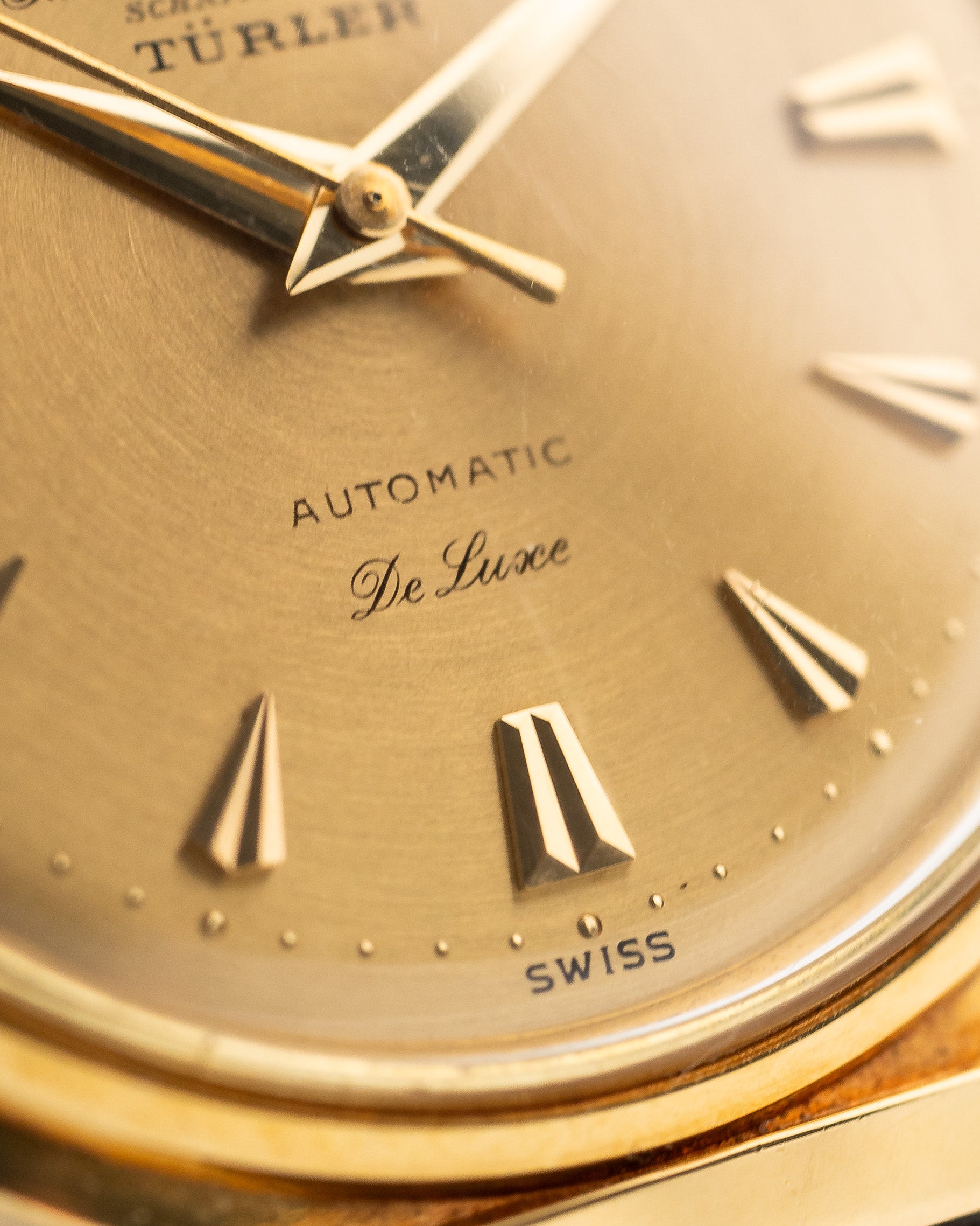 La caja, también de oro macizo de 18 quilates, presenta un bisel ligeramente escalonado que añade aún más carácter a esta belleza. Lo que hace que este modelo en particular sea aún más deseable es el doble signo "Türler", que nos está diciendo que fue vendido por el joyero "Türler" en primer lugar.