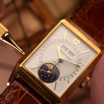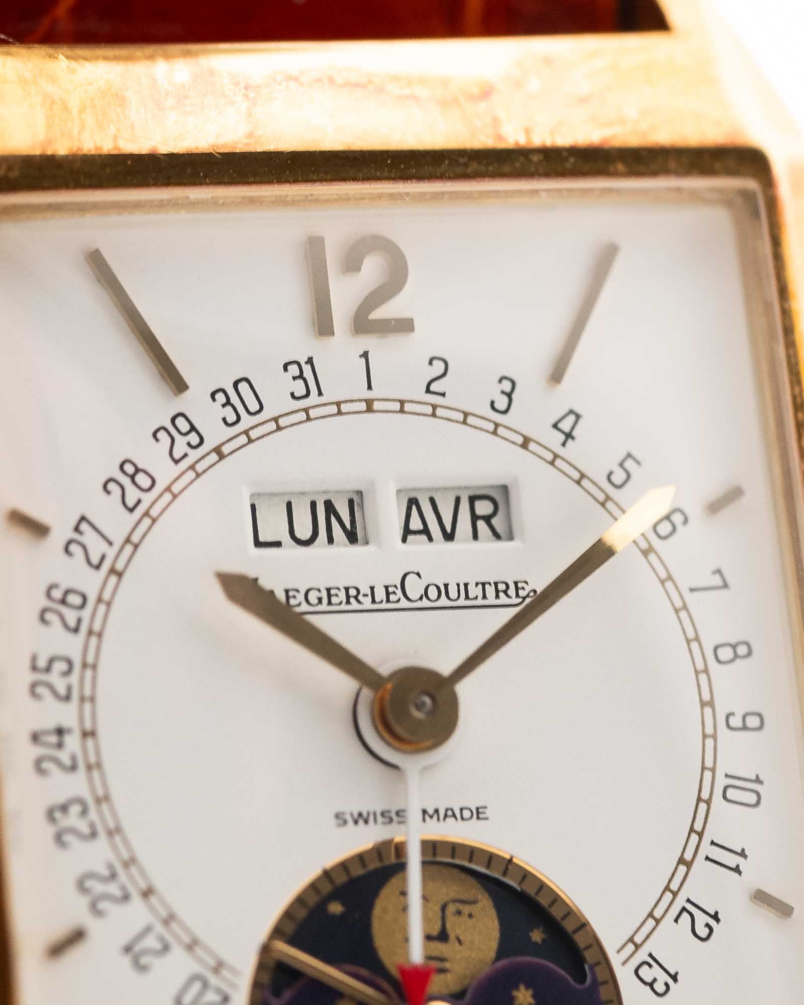 Fabricado en 1983 para celebrar los 150 años de Jaeger-LeCoultre, este Ref. 141.010.1 es un reloj de pulsera de edición limitada Série Unique , del que solo se fabricaron 600 unidades. Elaborado en oro amarillo de 18 quilates, cuenta con una refinada caja rectangular y un sofisticado triple calendario con fase lunar, un sello distintivo de la alta relojería clásica.