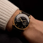 Este modelo destaca por su llamativa esfera negra, sus índices aplicados y sus elegantes agujas dauphine, una expresión pura de la estética moderna de mediados de siglo. La caja chapada en oro amarillo ofrece una fuerte presencia en la muñeca, sin dejar de ser refinada y fácil de llevar.