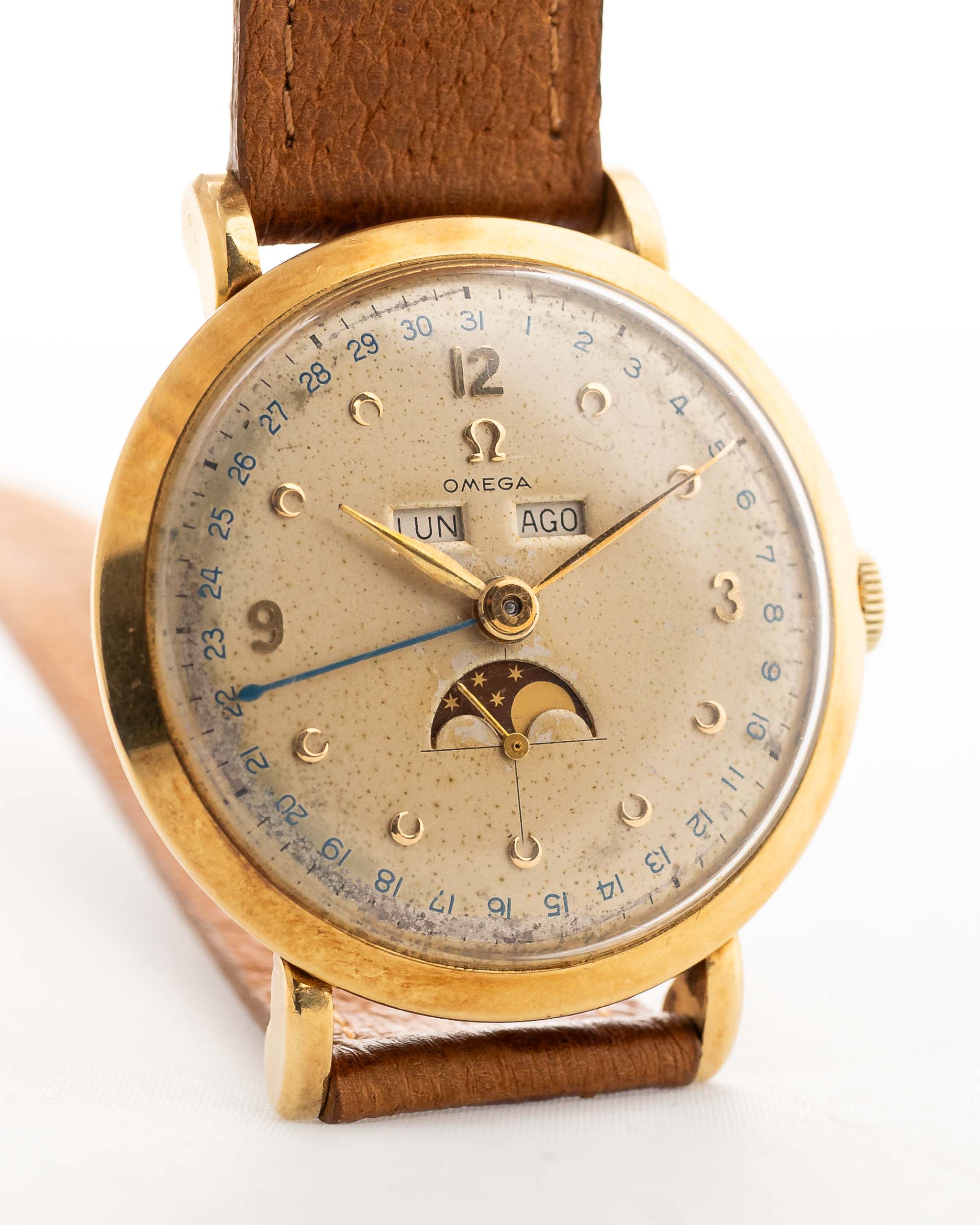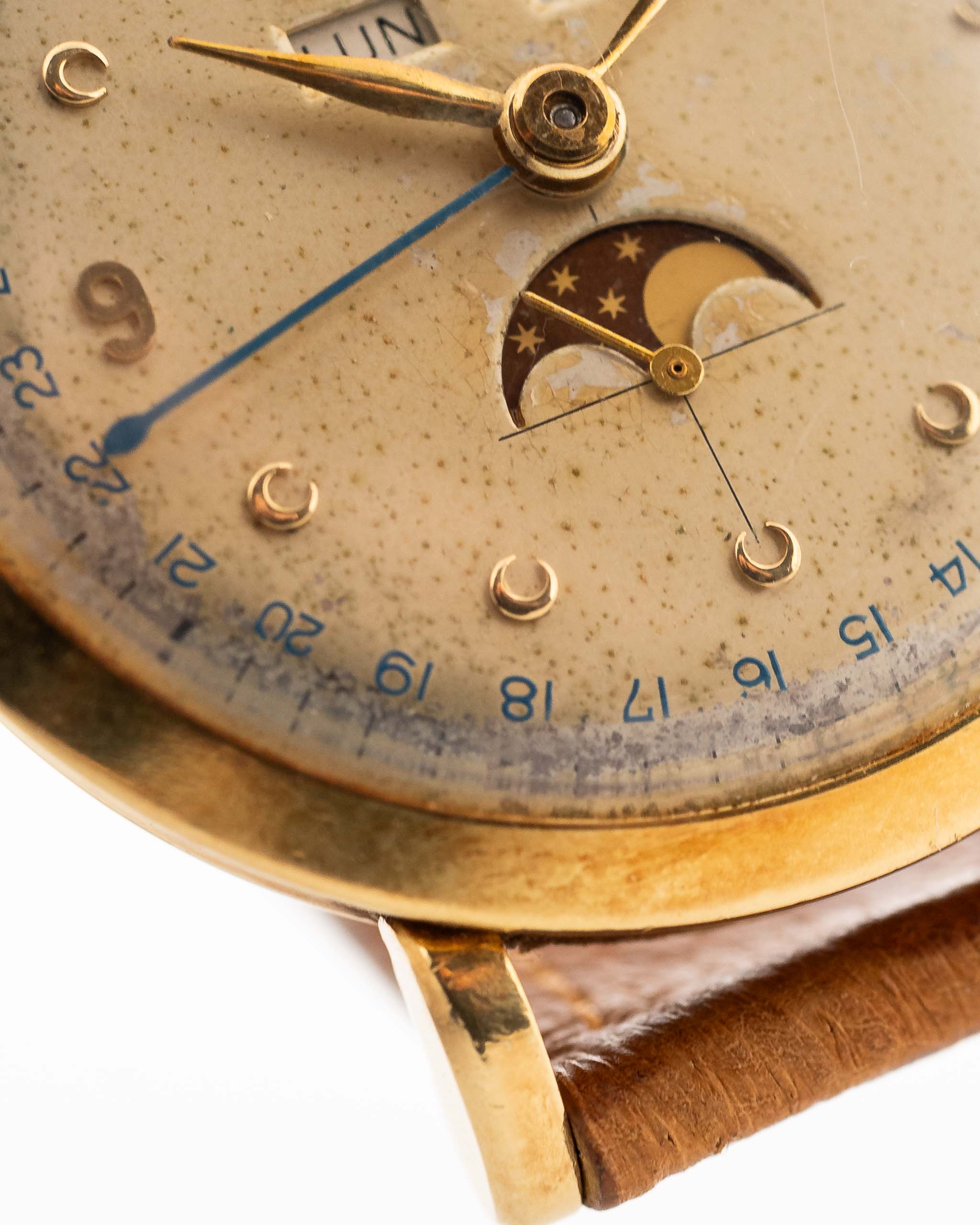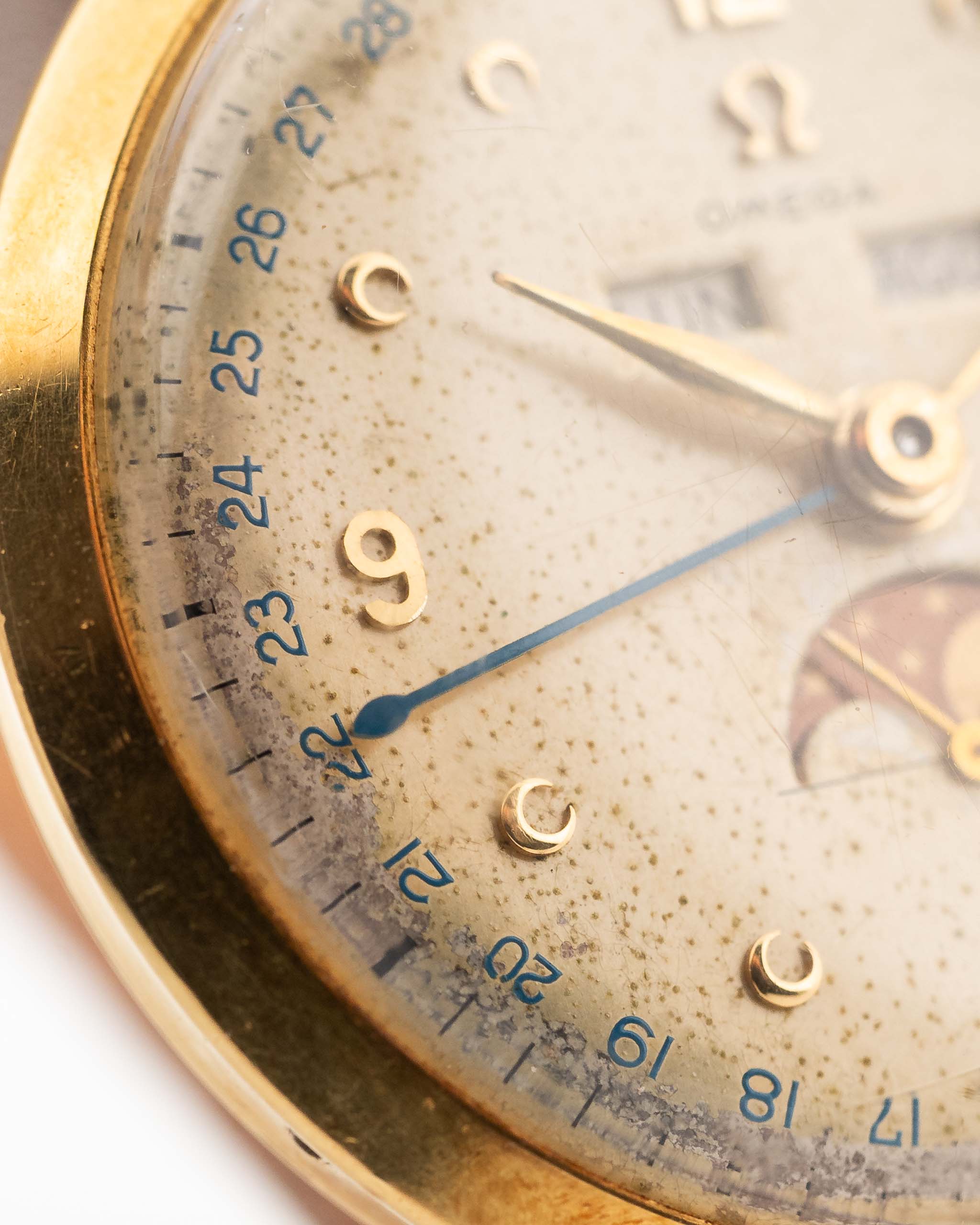 La rejilla exterior de la esfera presenta un llamativo anillo azul para el capítulo de la fecha. Las agujas originales de pan de oro amarillo están en magnífico estado, al igual que la aguja de la fecha de acero pavonado; la esfera está en buen estado general con algo de pátina.