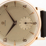 Aquí puede ver un fascinante y rarísimo Omega de 1947. Presenta una enorme caja de 39 mm de oro rosa de 18 quilates con unas bellísimas asas de araña torneadas hacia abajo, una fantástica esfera color crema con una ligera y uniforme pátina y agujas Dauphine de oro rosa de 18 quilates e índices horarios en forma de flecha/arábigos.