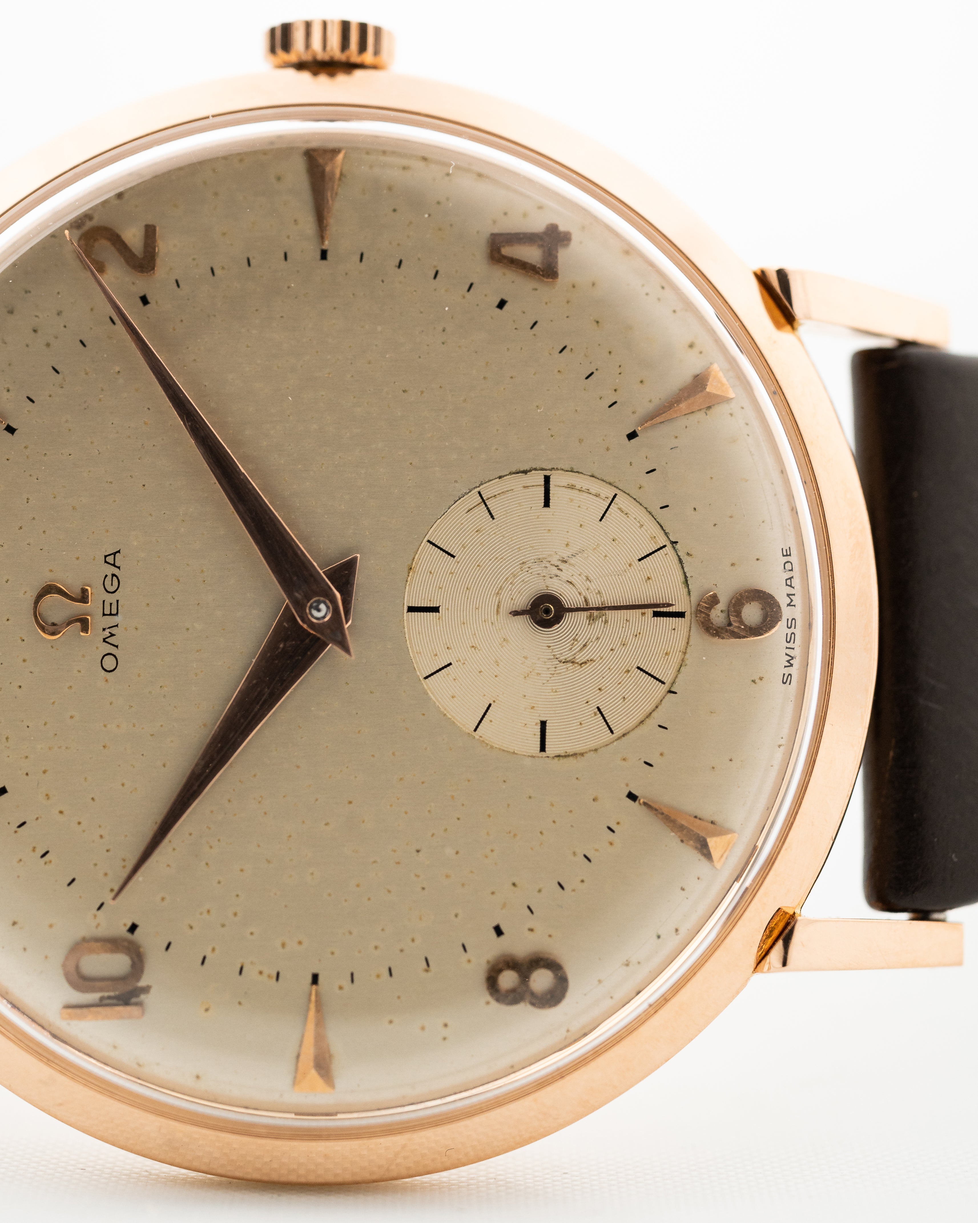 Este ejemplar en particular destaca por su bello aspecto general y su extraordinaria caja de oro rosa sobredimensionada. Es la primera vez que encontramos un Omega con caja de 39 mm.