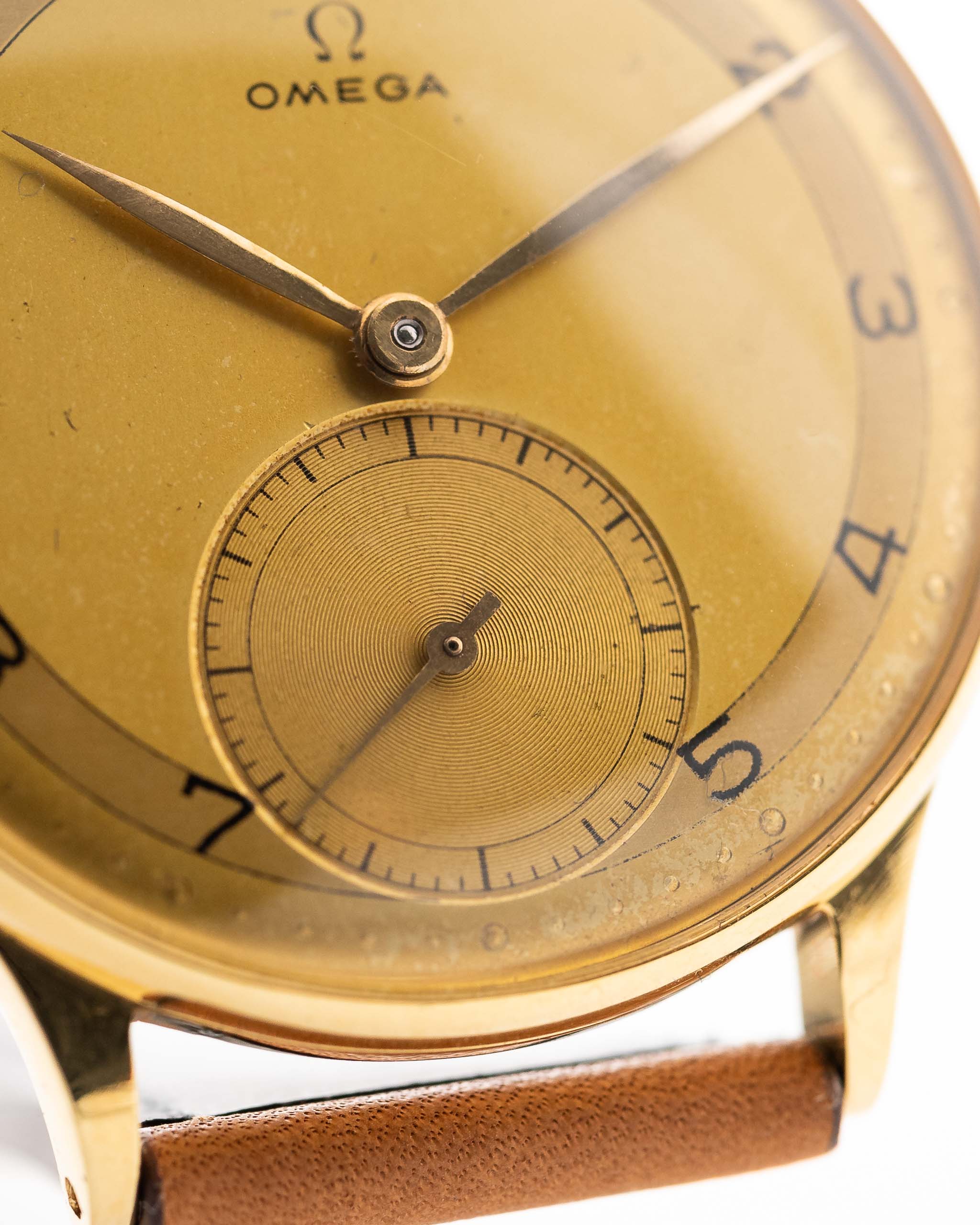Encontrar un Omega de la década de 1940 en estas condiciones es raro. ¿Encontrar uno con una esfera Art Déco de dos tonos, agujas de hoja perfectamente conservadas y una bella disposición de los sub-segundos? Casi imposible.