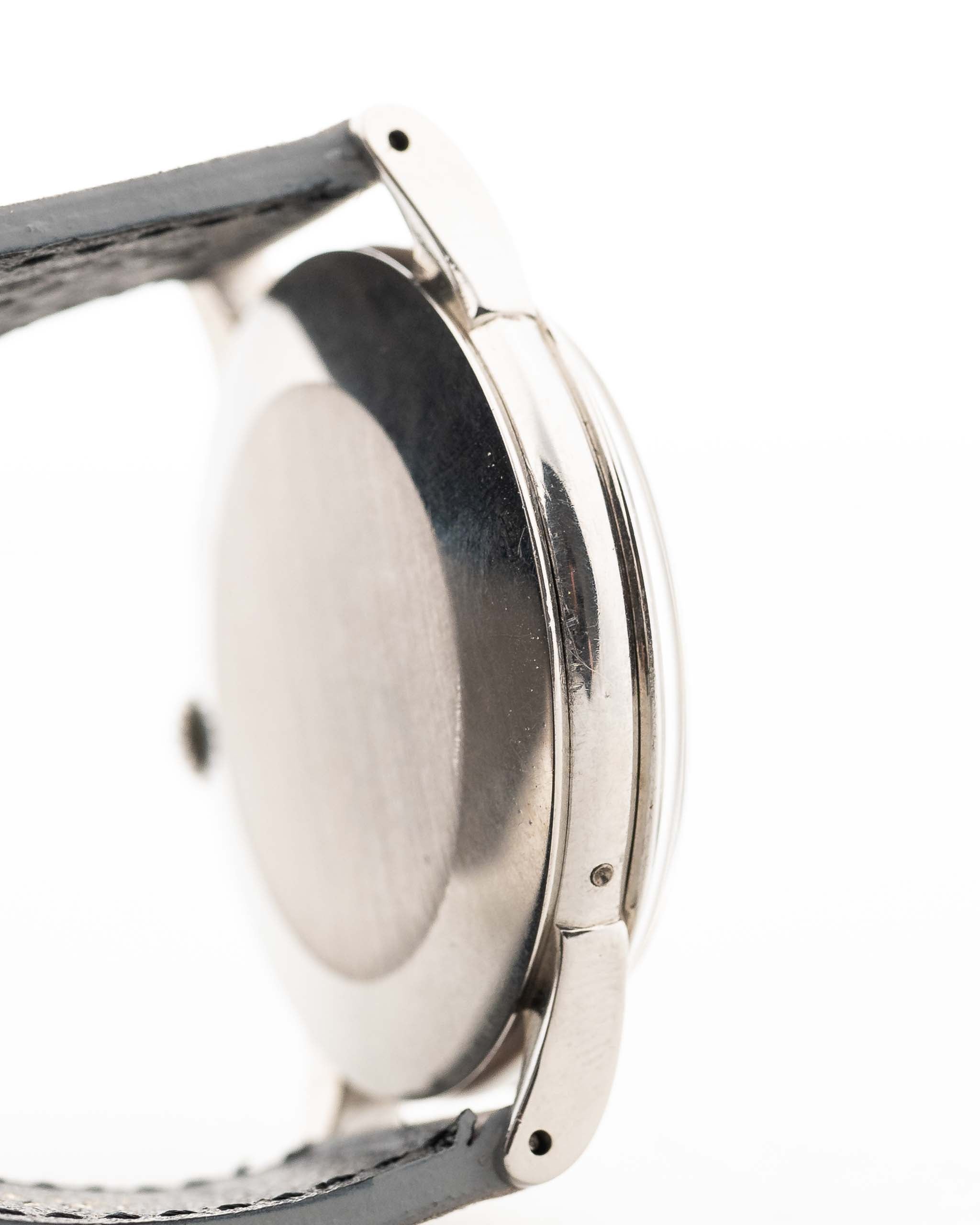 El Omega Cosmic se presentó en 1947 como el modelo más prestigioso del catálogo de Omega de la posguerra, y esta referencia 2486demuestra exactamente por qué. Alojado en una rara caja de acero inoxidable de 37 mm, cuenta con un calendario completo con complicación de fases lunares.