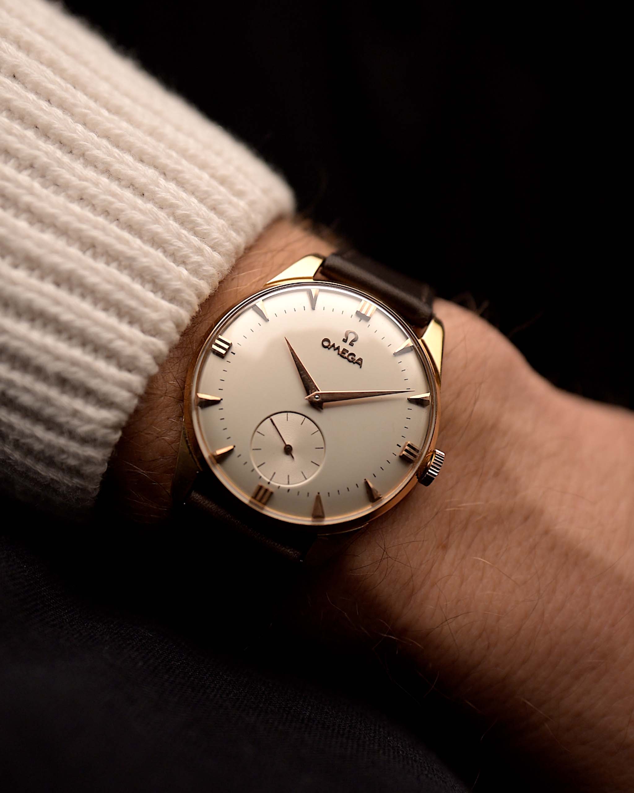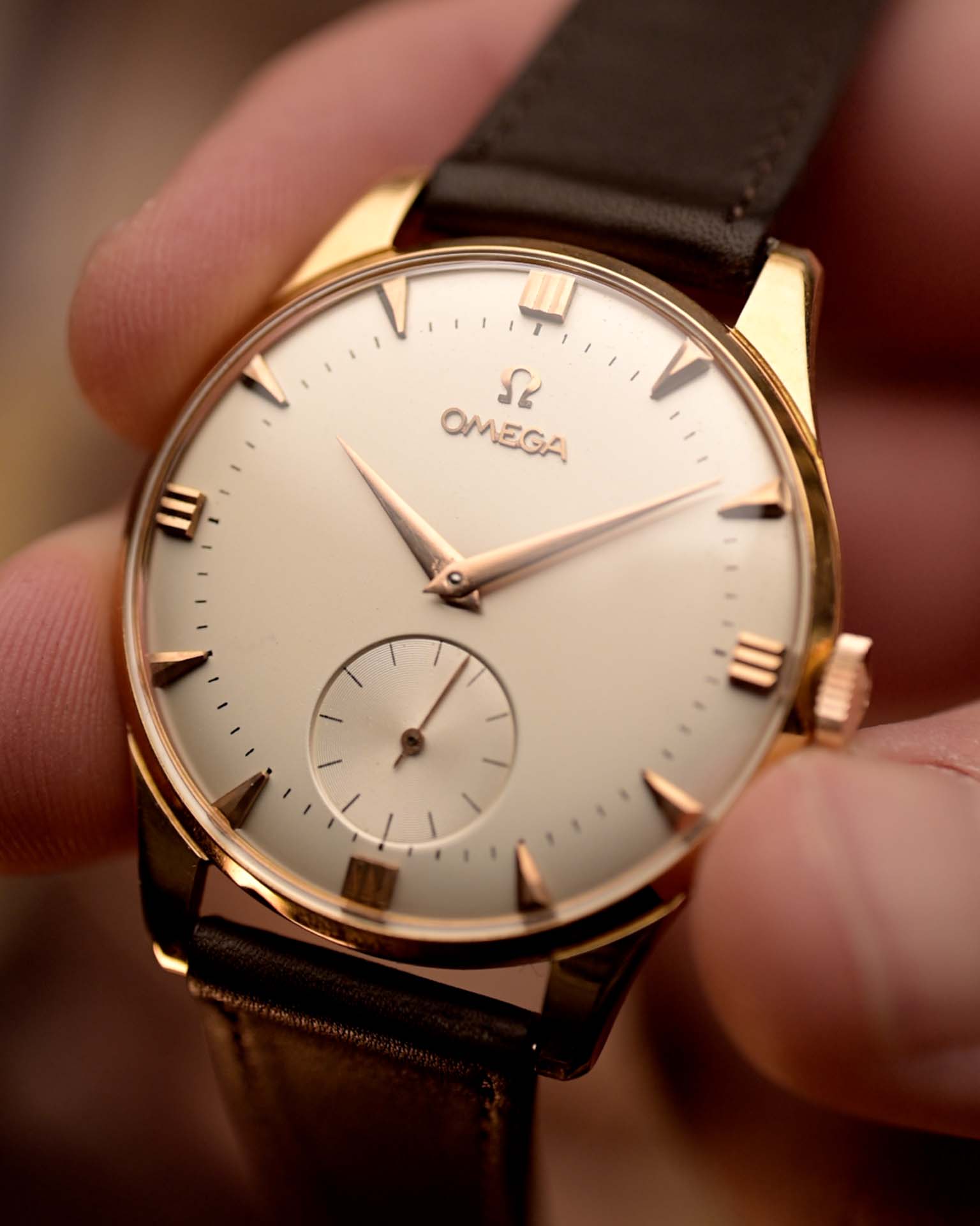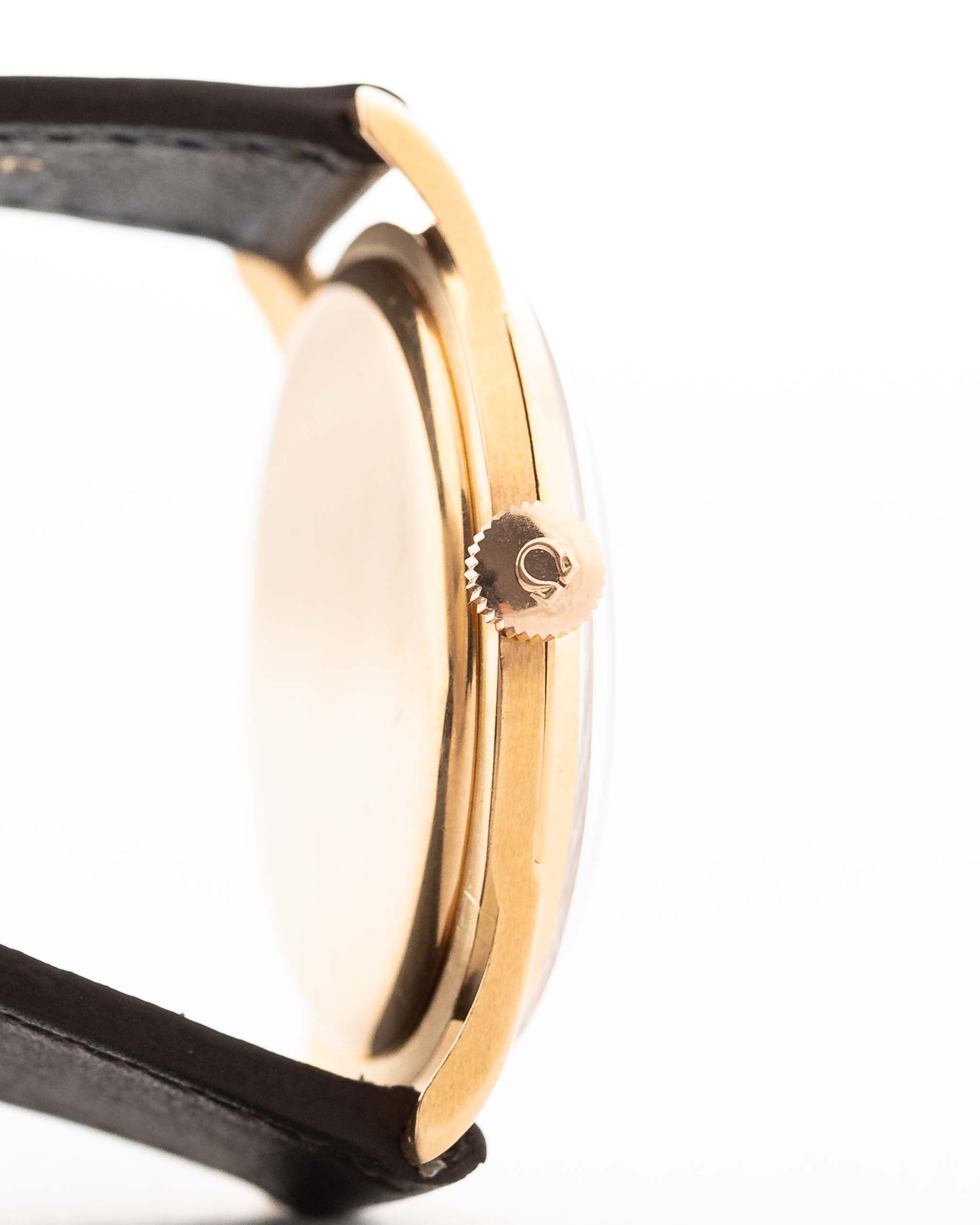 Este Omega Ref. 2896 de 1956 es un sorprendente ejemplo de la elegancia de mediados de siglo de la marca, definida por una geometría limpia, detalles refinados y proporciones bellamente equilibradas. La sobredimensionada caja de 36 mm de oro rosa de 18 quilates -grande para su época- confiere al reloj una presencia segura pero discreta en la muñeca.