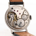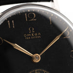 Foto de un vintage Omega Art Deco Black Syringe Sub Second 1939 en una muñeca. En acero inoxidable, 30mm con movimiento de cuerda manual, esfera negra mate original y correa de piel.