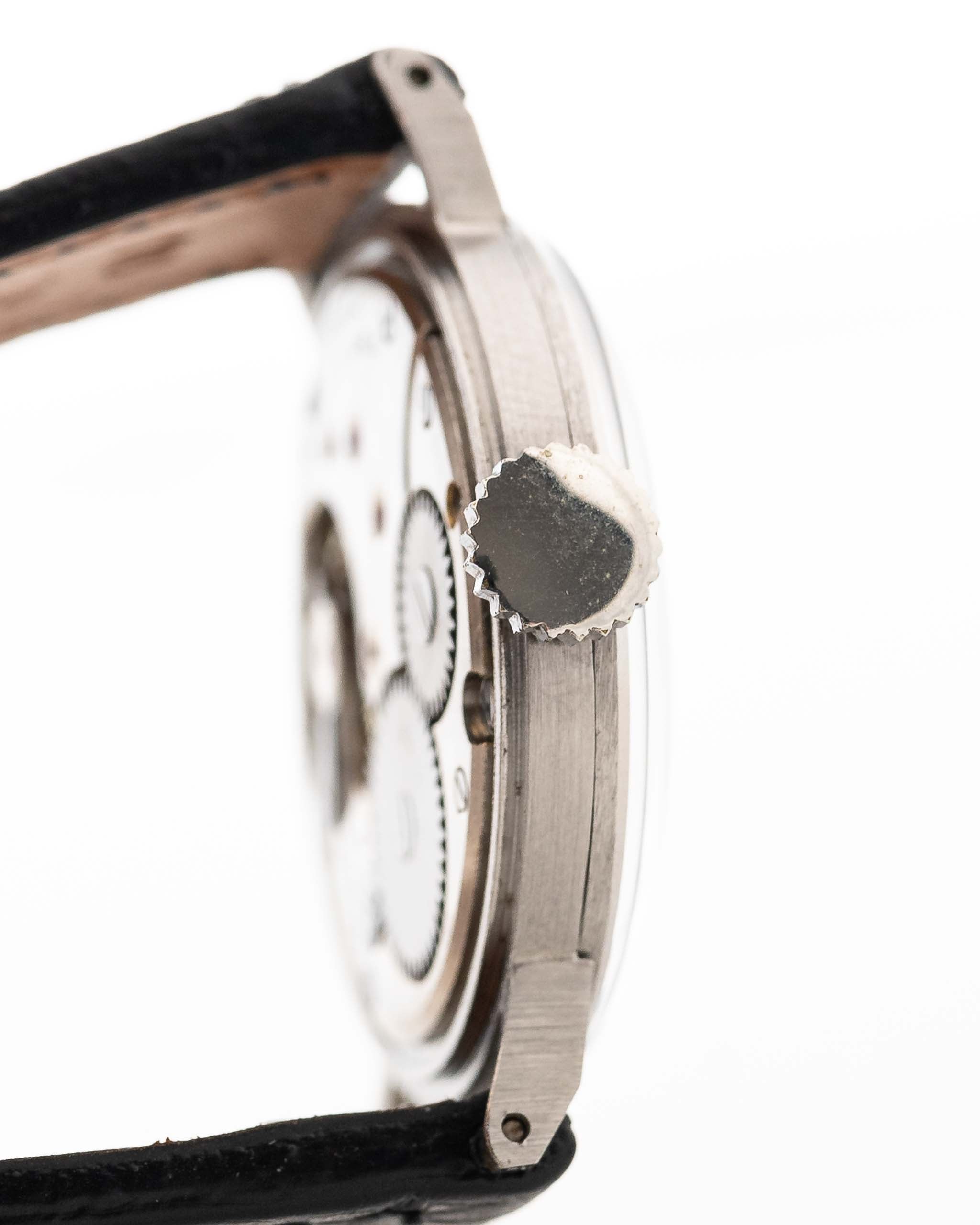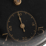 Foto de cerca de un Omega Art Déco Black Syringe Sub Second 1939 de época en una muñeca. En acero inoxidable, 30 mm con movimiento de cuerda manual, esfera negra mate original y correa de piel.