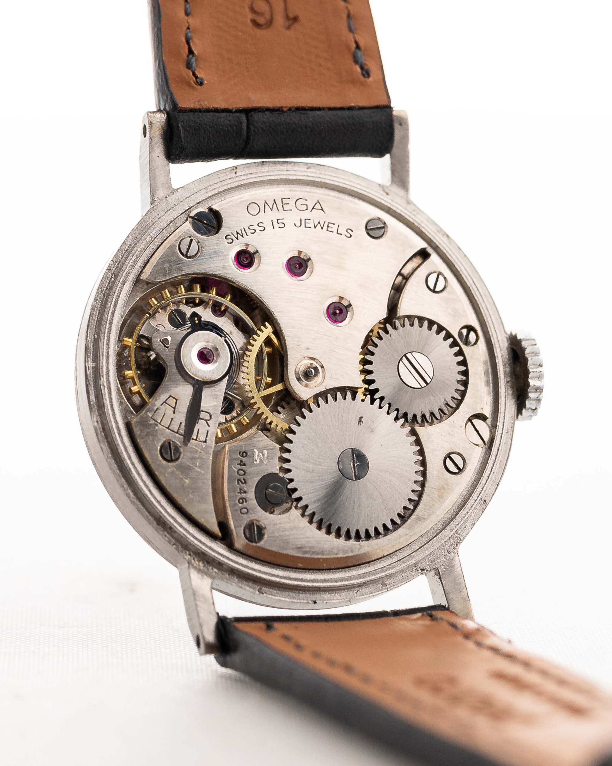 Encontrar un Omega de los años 30 en buen estado es difícil, pero hallar uno con una preciosa esfera negra mate, números Art Déco y agujas de jeringuilla doradas a juego es casi imposible.