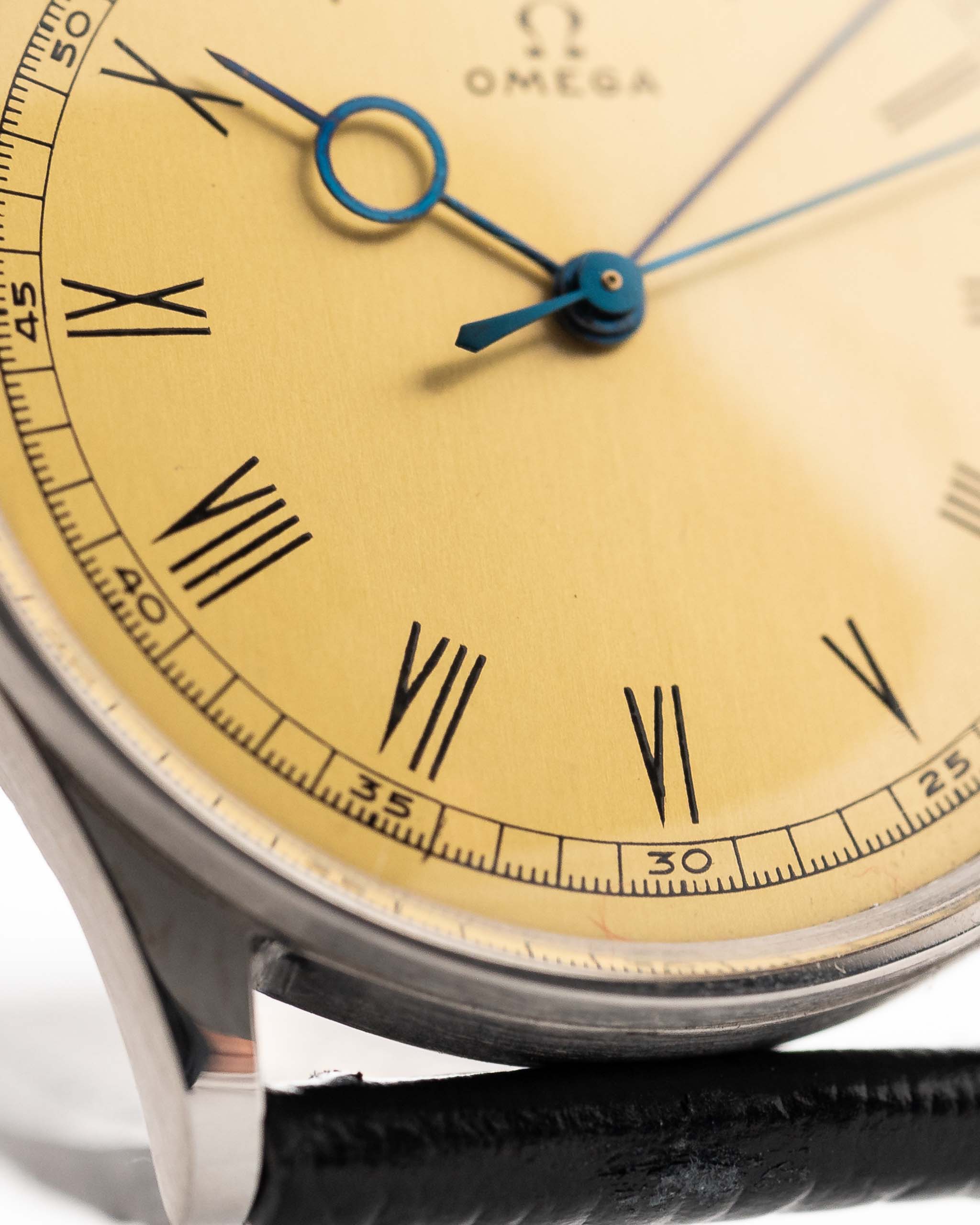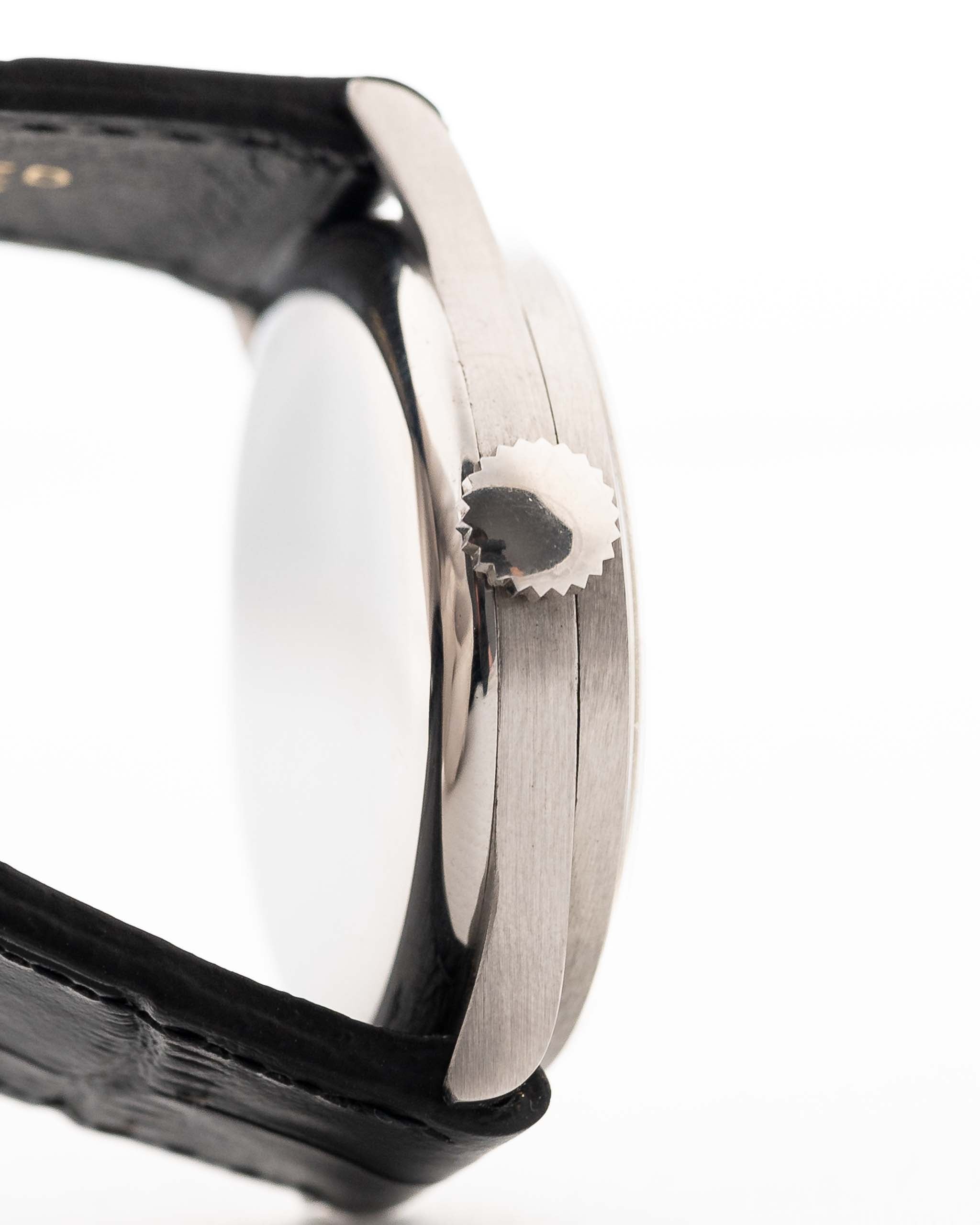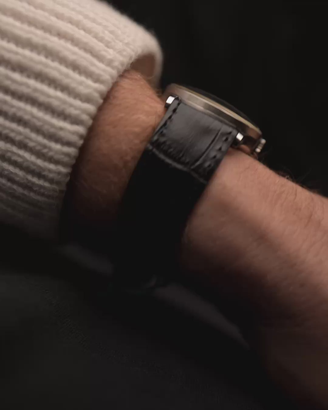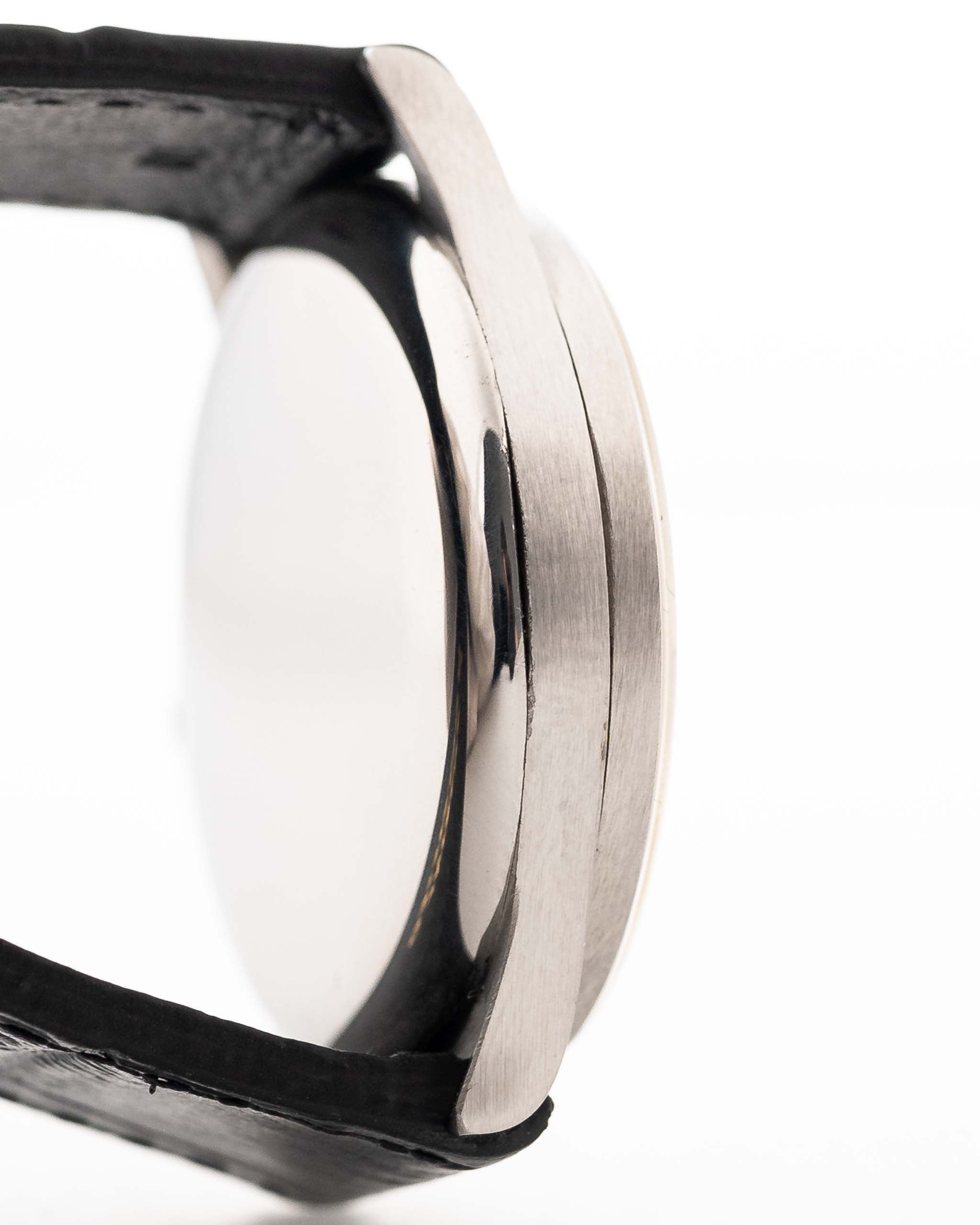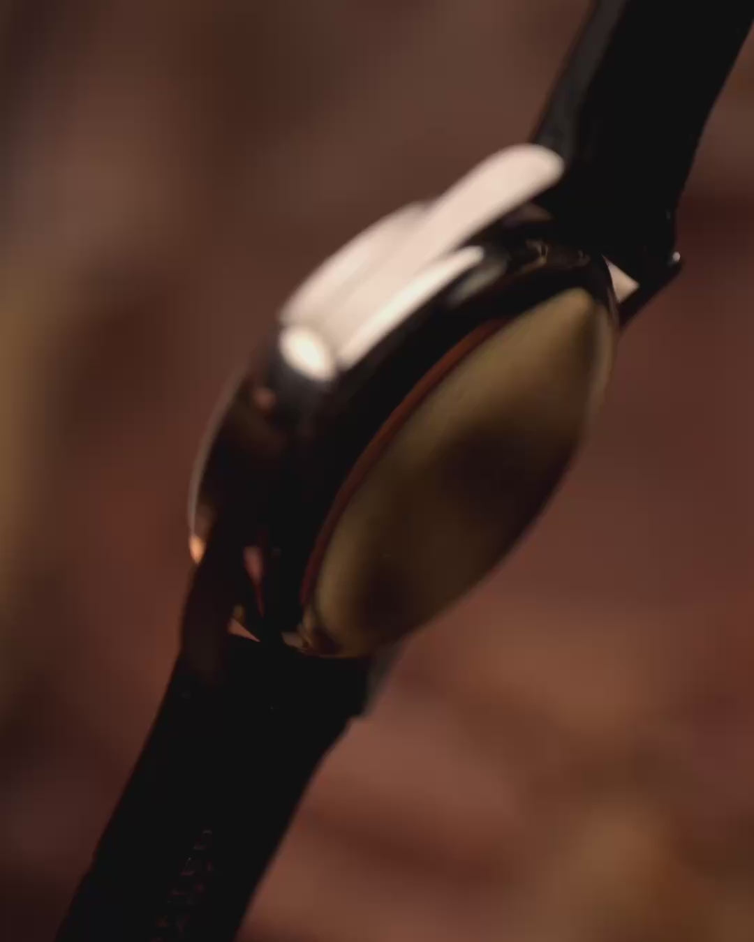 La caja de acero inoxidable de 32,5 mm confiere al reloj una presencia sorprendentemente moderna en la muñeca, al tiempo que conserva todo el encanto de un auténtico reloj de pulsera de antes de la guerra. La esfera intacta, con su cálido tono dorado y sus nítidos números romanos, sigue siendo un elemento destacado: grácil, arquitectónica y llena de carácter.