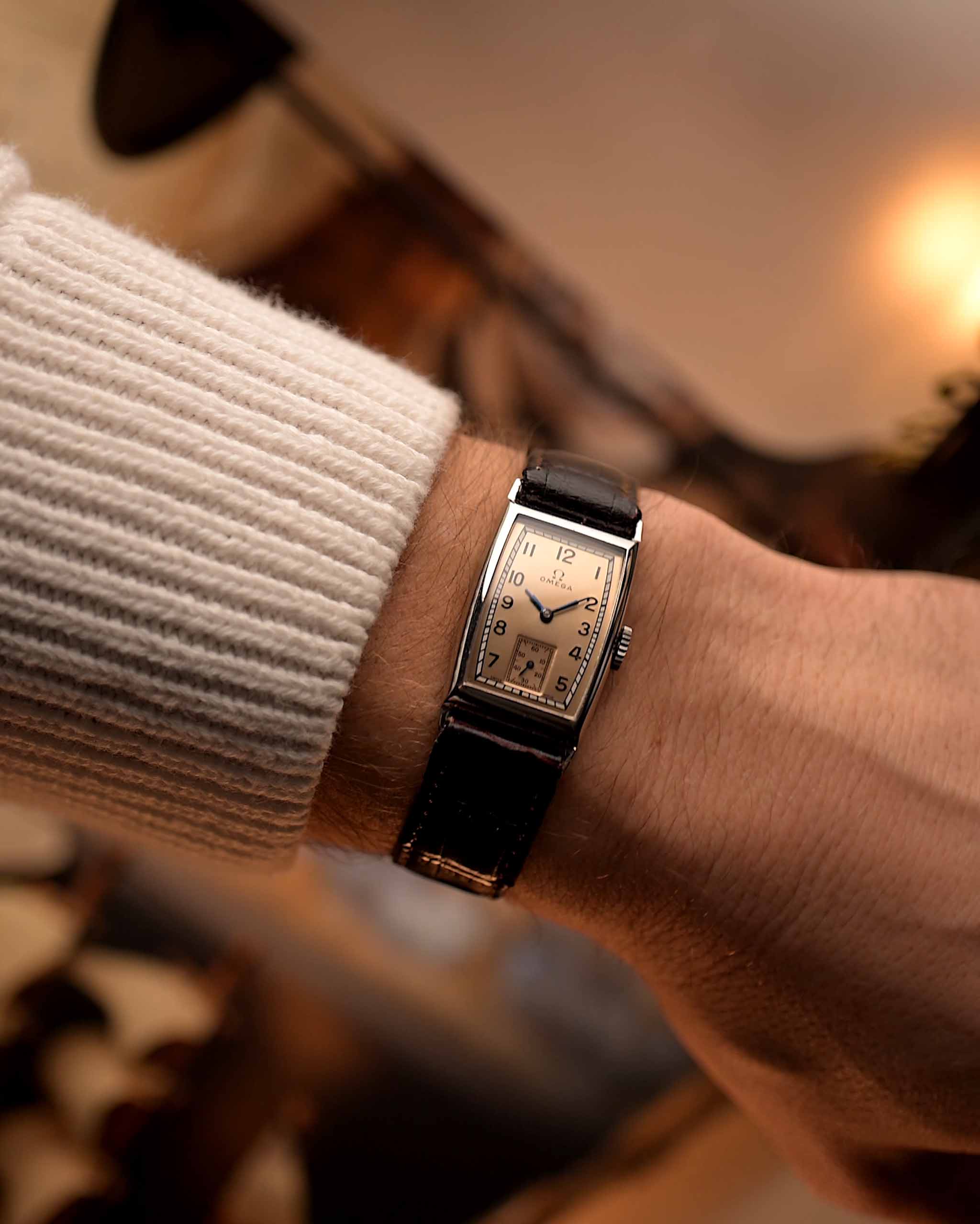 Este raro reloj de vestir Omega de 1930 encarna el refinamiento de la era Art Déco. Alojado en una caja rectangular de acero inoxidable, luce significativamente más grande de lo que sugieren sus dimensiones: un perfil llamativo y elegante en la muñeca.