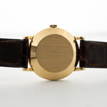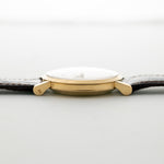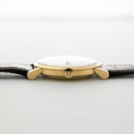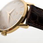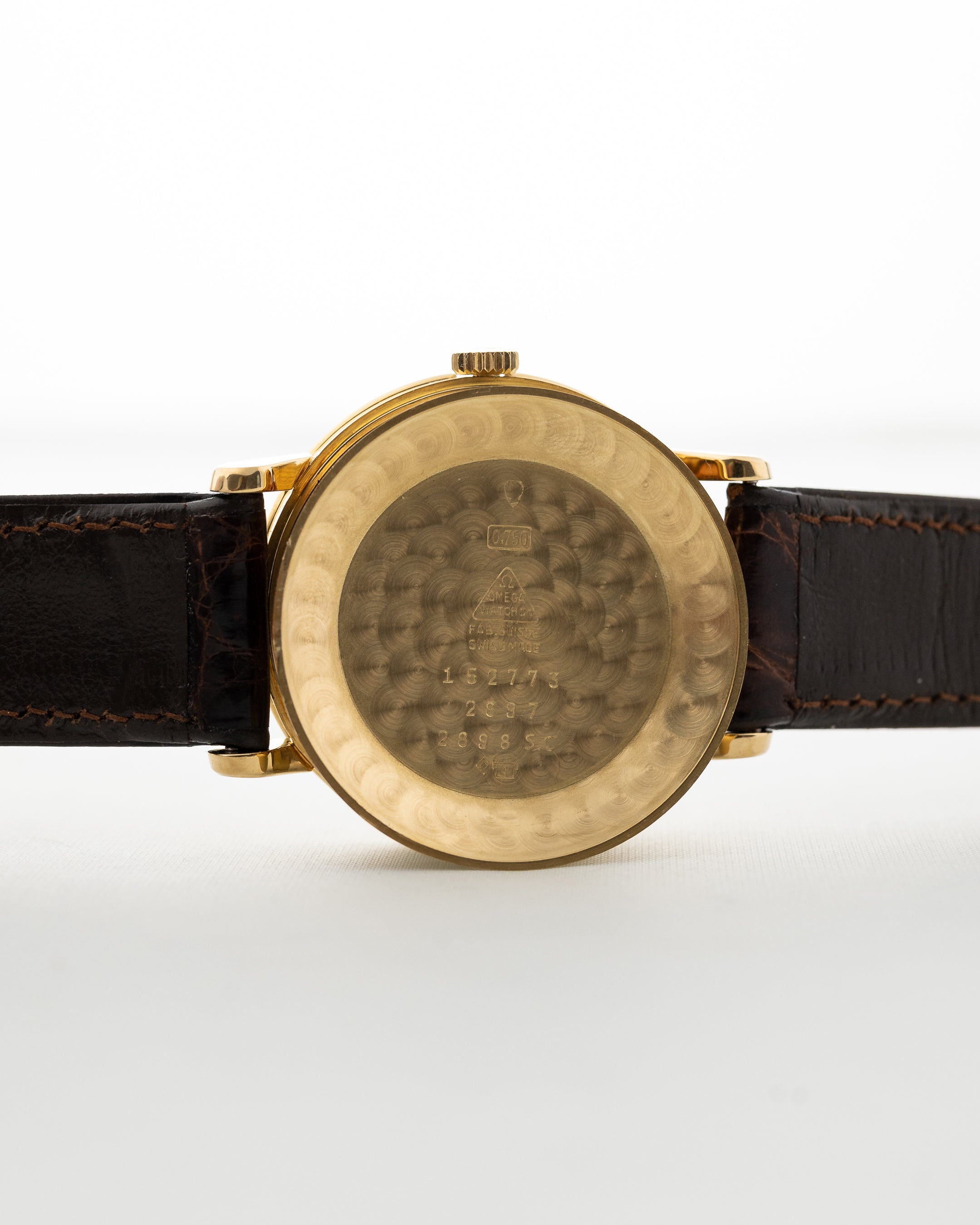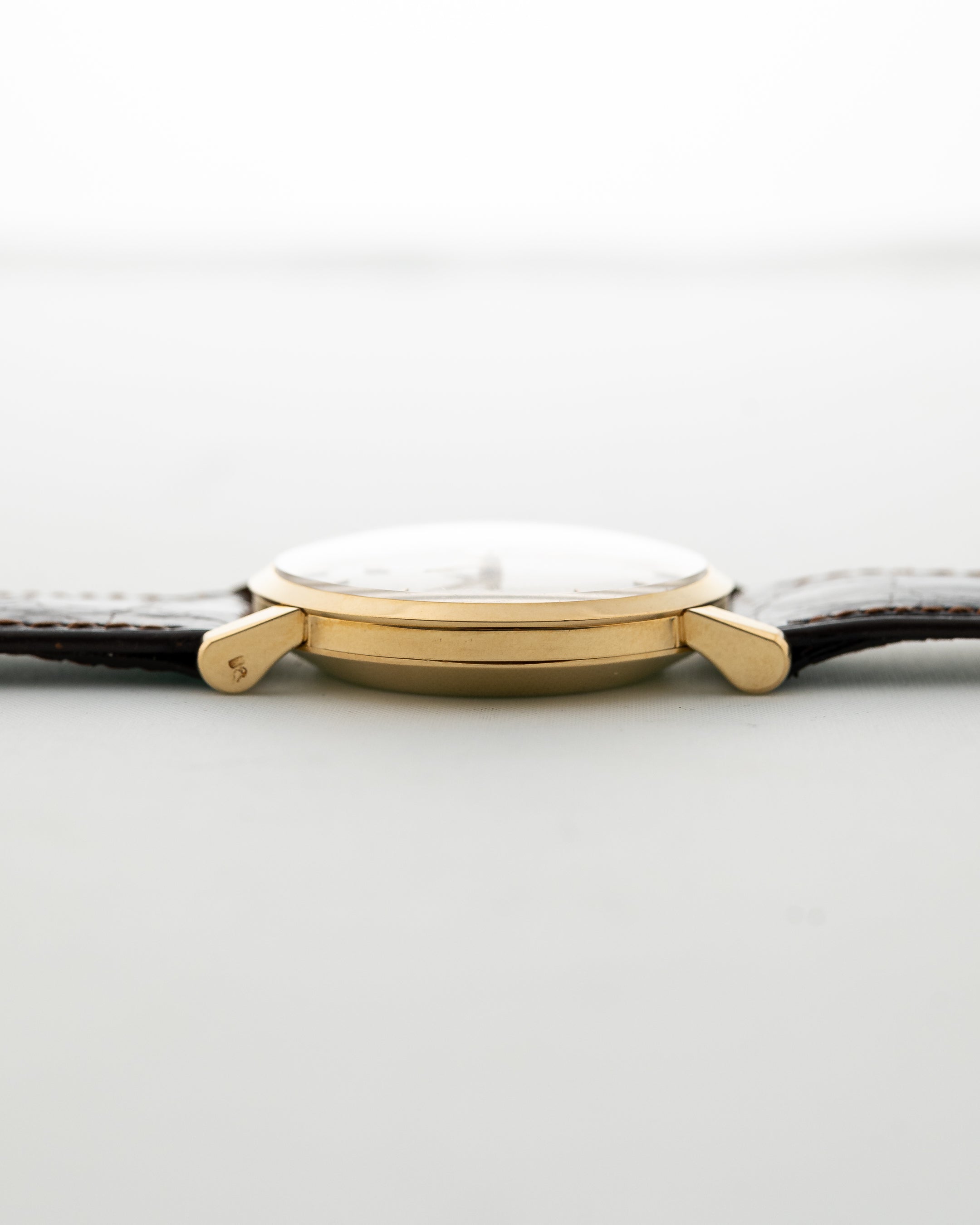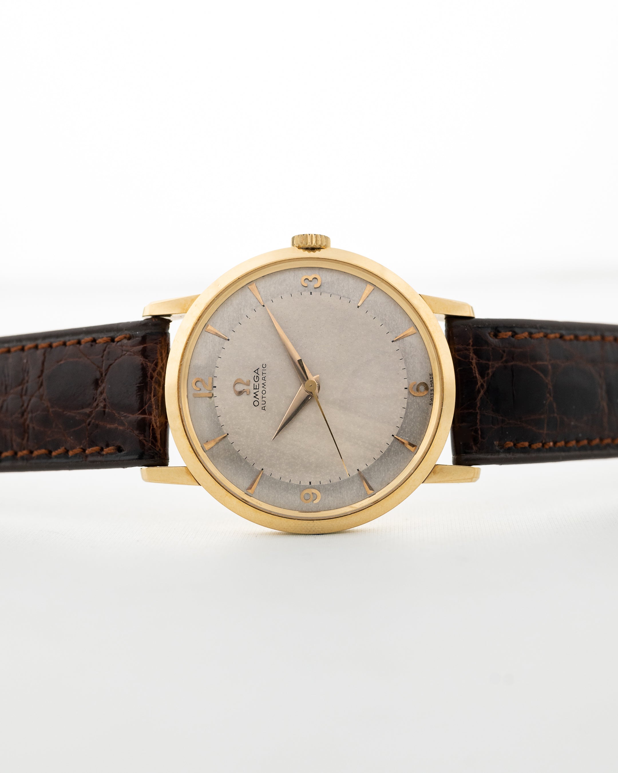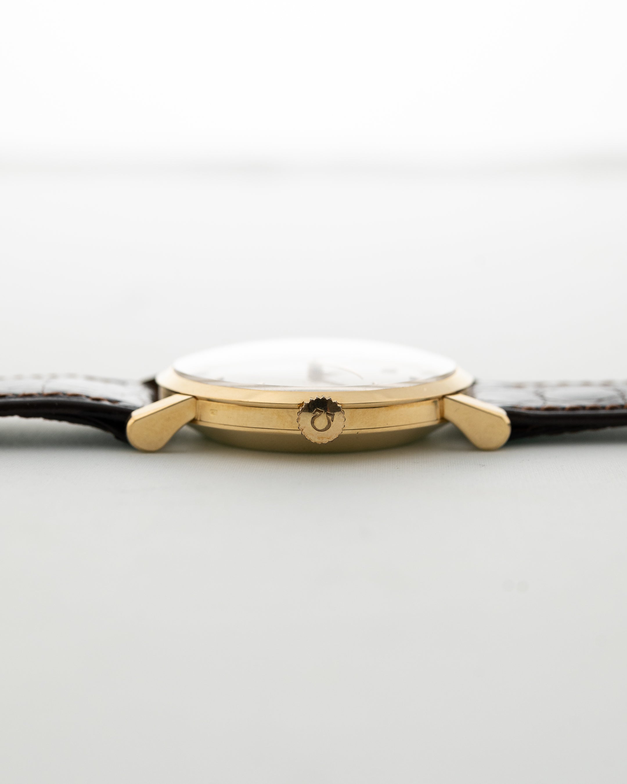 Aquí puede ver un fascinante reloj de vestir fabricado por Omega en 1956. Presenta una caja de 35 mm de oro amarillo de 18 quilates con asas finas y de gran ángulo y una impresionante esfera bicolor plateada/blanca con índices de oro amarillo, una pieza impresionante que le dejará sin aliento.