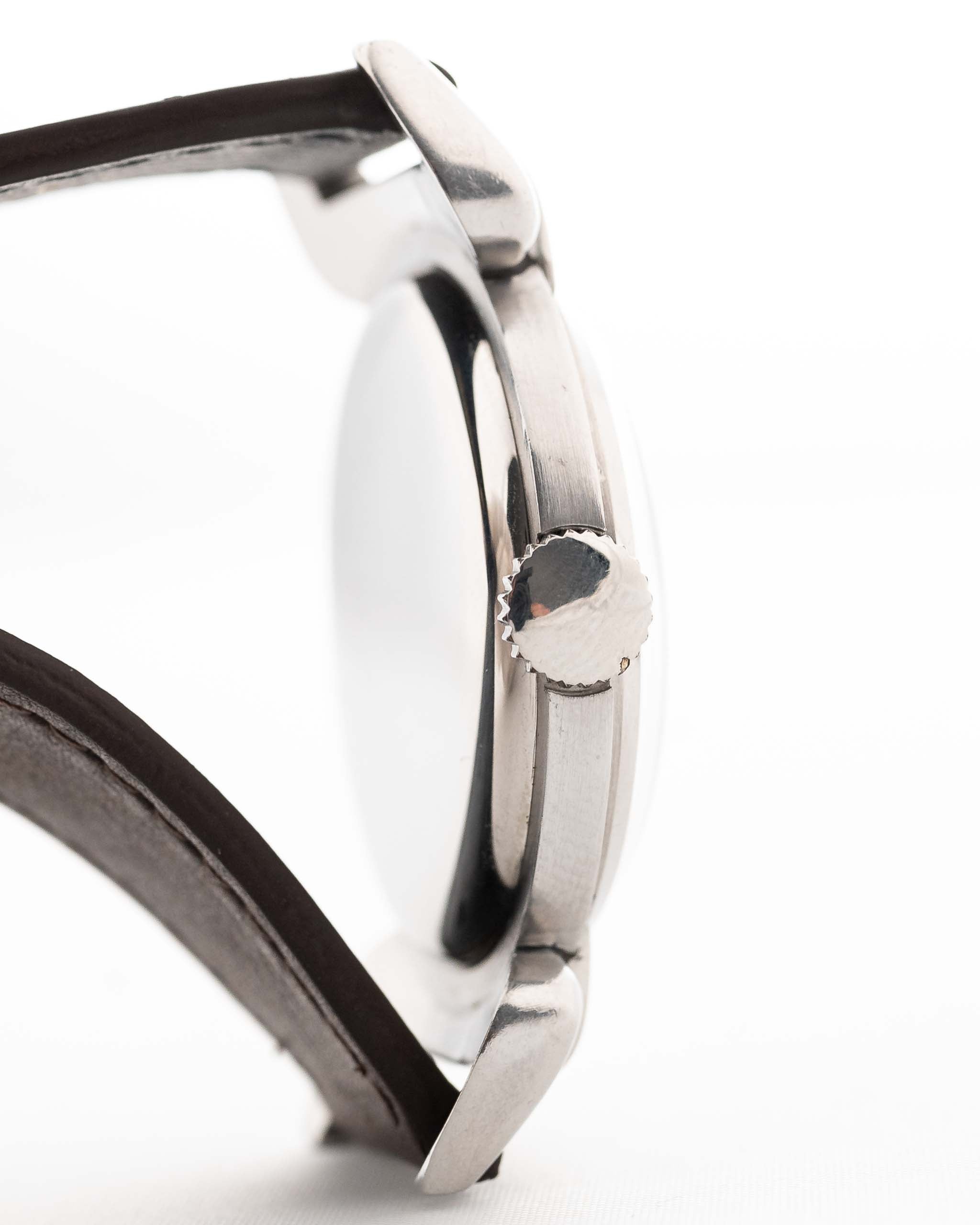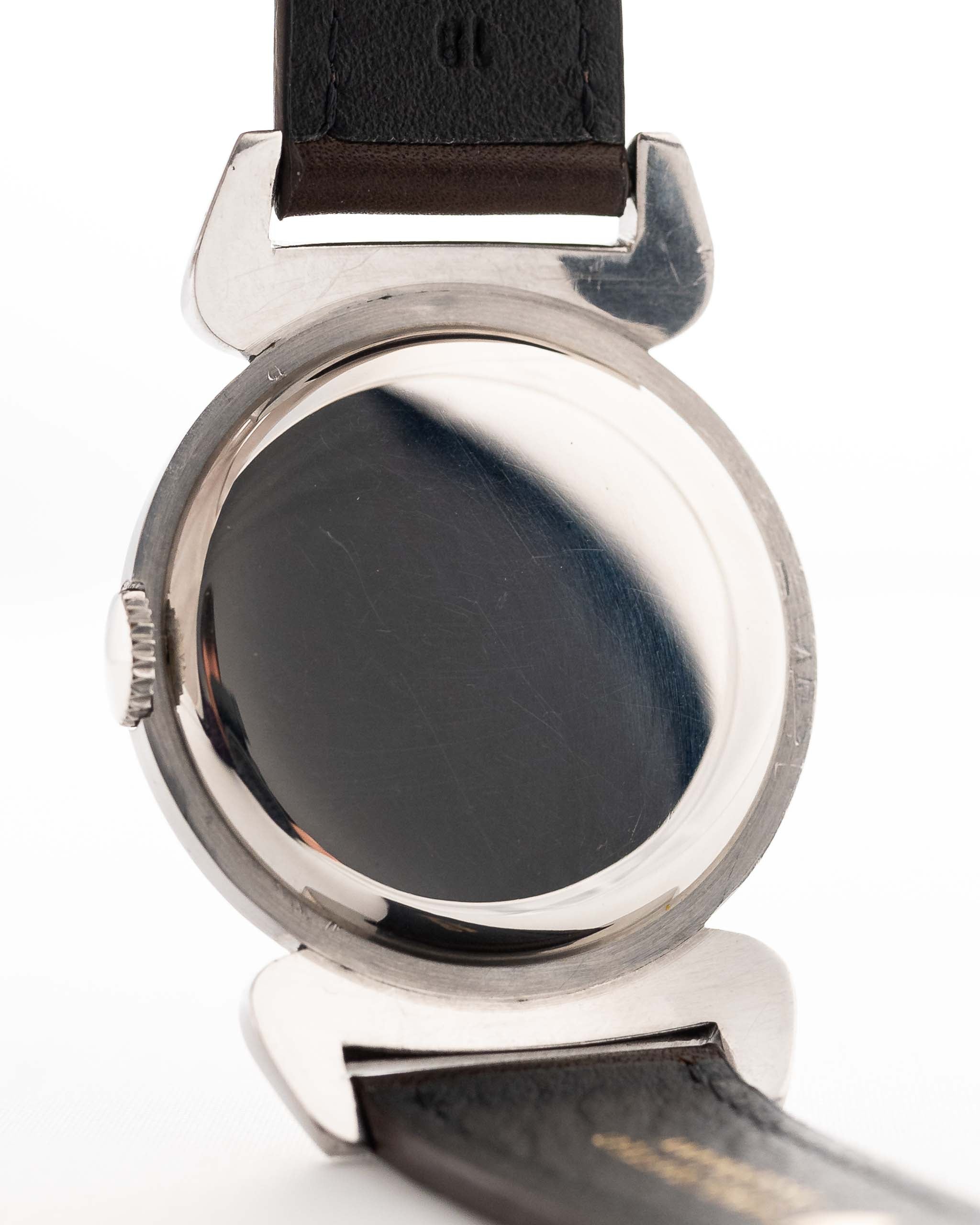 Este raro e impresionante Omega de 1939 exhibe uno de los diseños de caja más espectaculares de la época anterior a la guerra: las asas "escarabajo" sobredimensionadas, que extienden la caja hasta casi 50 mm de asa a asa y le confieren la presencia en la muñeca de un reloj moderno de 37-38 mm.