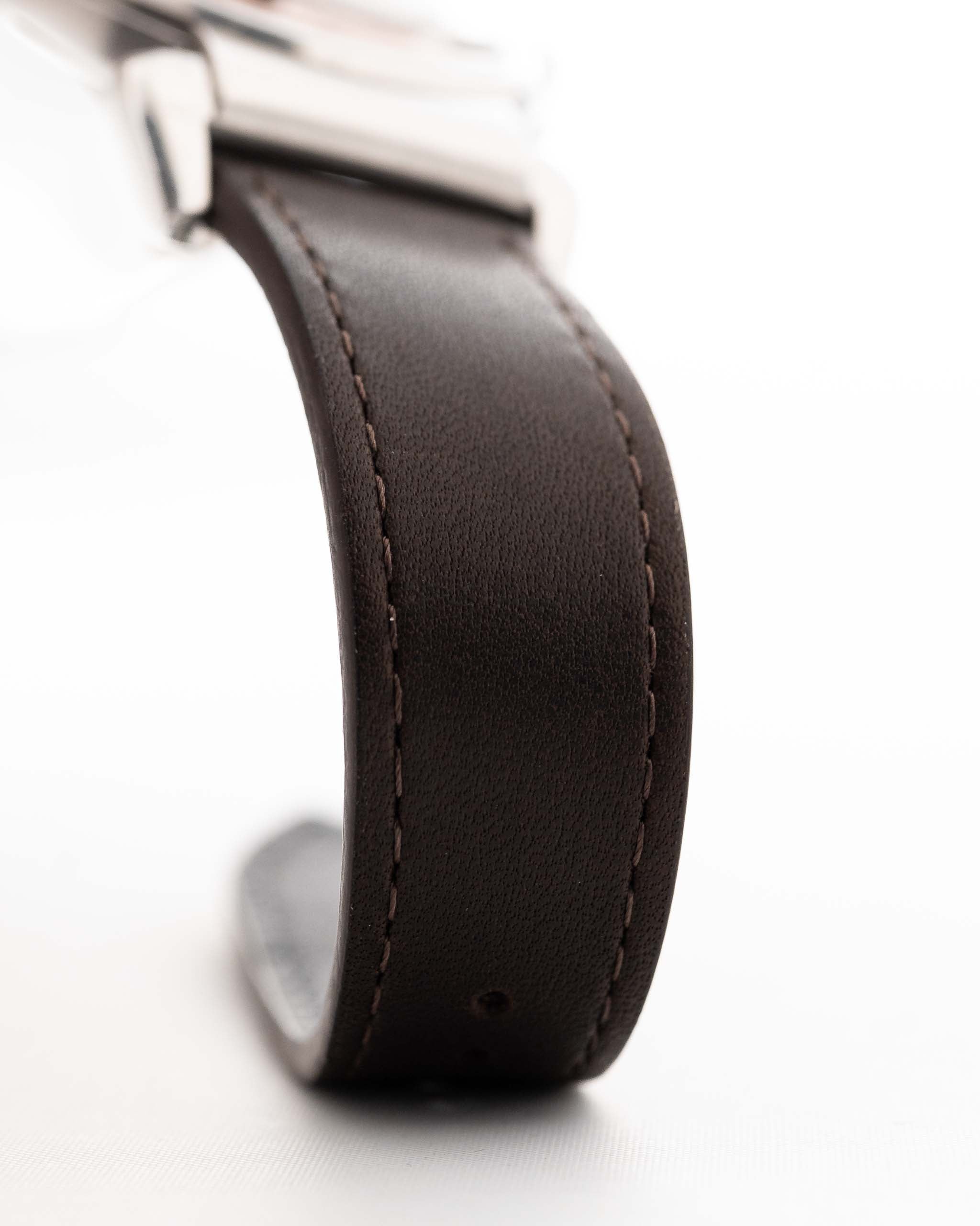 La esfera, de un tono cobrizo intacto, ha desarrollado una pátina cálida y uniforme que le confiere una profundidad y una autenticidad increíbles. Las agujas de bastón de acero azulado añaden un discreto contraste y un destello de elegancia bajo la luz, un detalle que no se olvida una vez que se ve en movimiento.