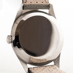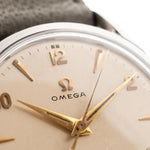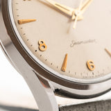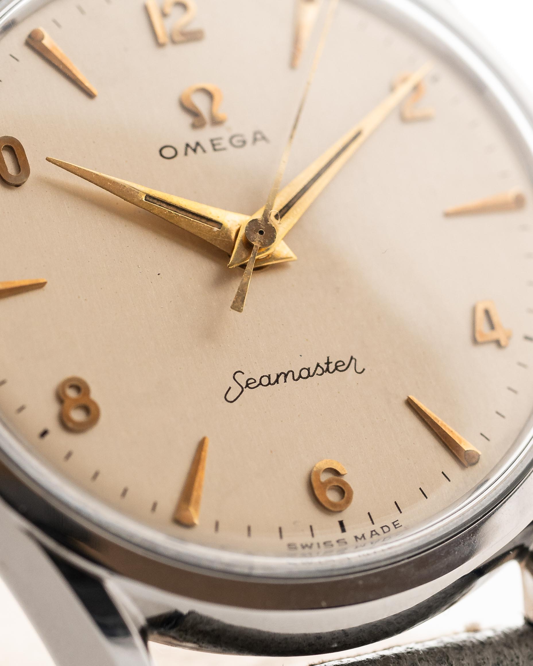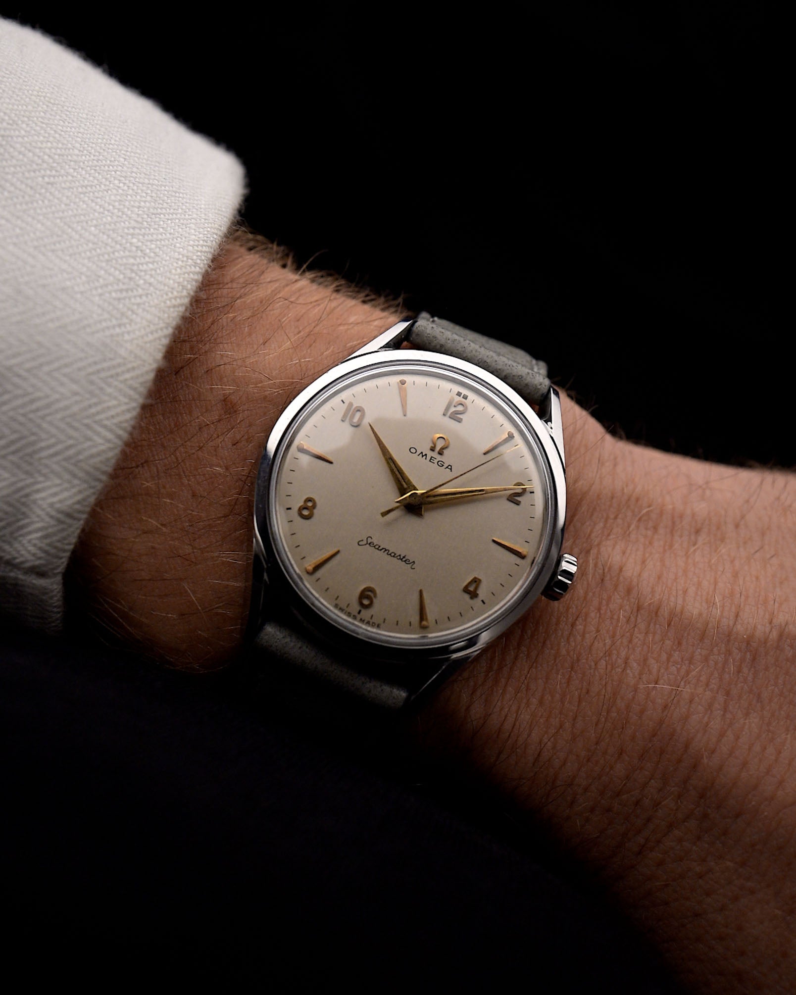 Aquí puede ver un fascinante Seamaster fabricado por Omega en 1954. Presenta una enorme caja de acero inoxidable de 36 mm con asas ligeramente torneadas hacia abajo y viene con una preciosa y limpia esfera color crema, preciosos índices horarios dorados y agujas dauphine.