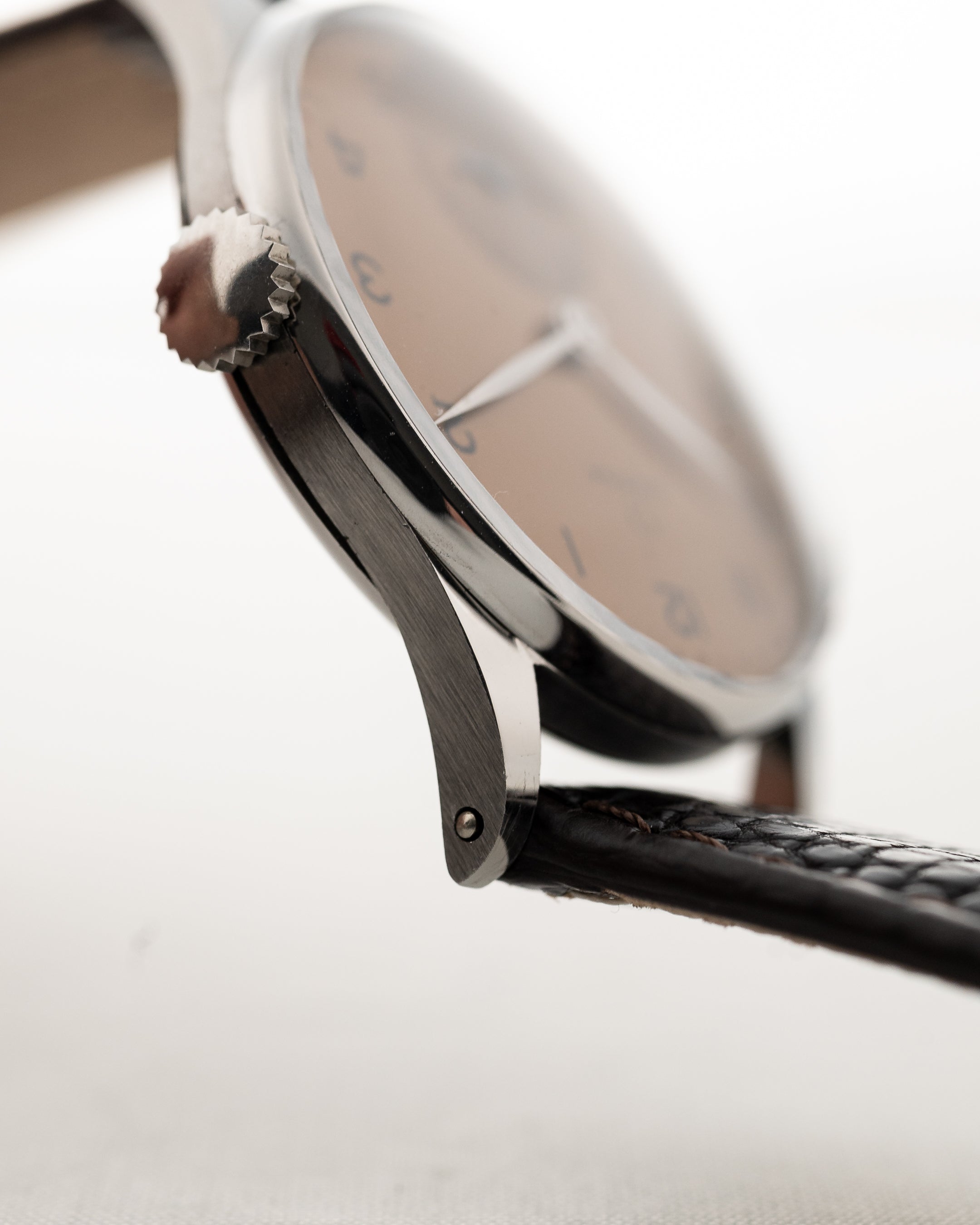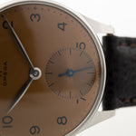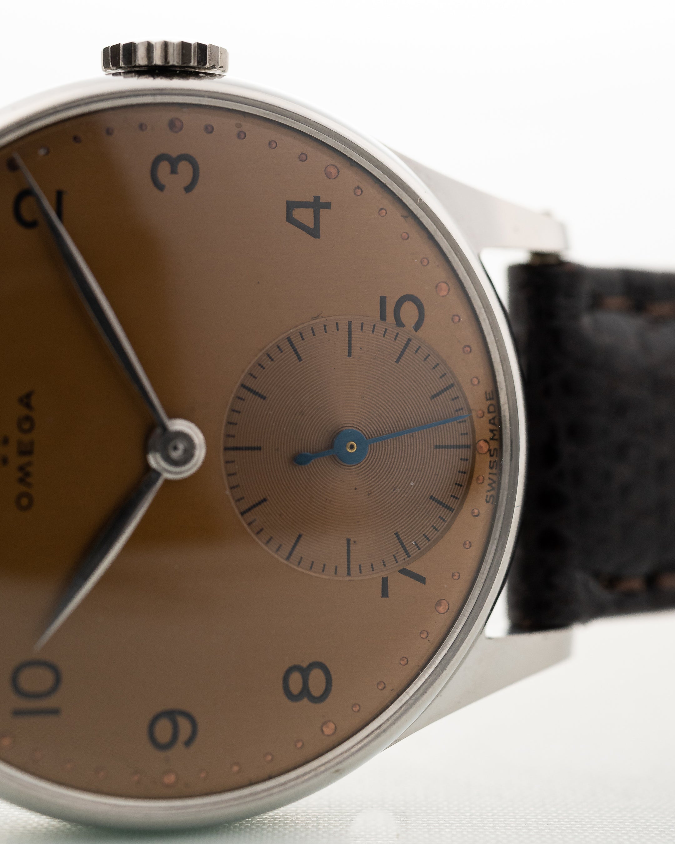 Aquí puede ver un fascinante reloj de vestir fabricado por Omega en 1947. Presenta una caja de acero inoxidable de 33 mm con asas angulares finas y sencillas y una impresionante esfera capuchina en perfecto estado y agujas de hoja de acero inoxidable, una pieza que le dejará sin aliento.