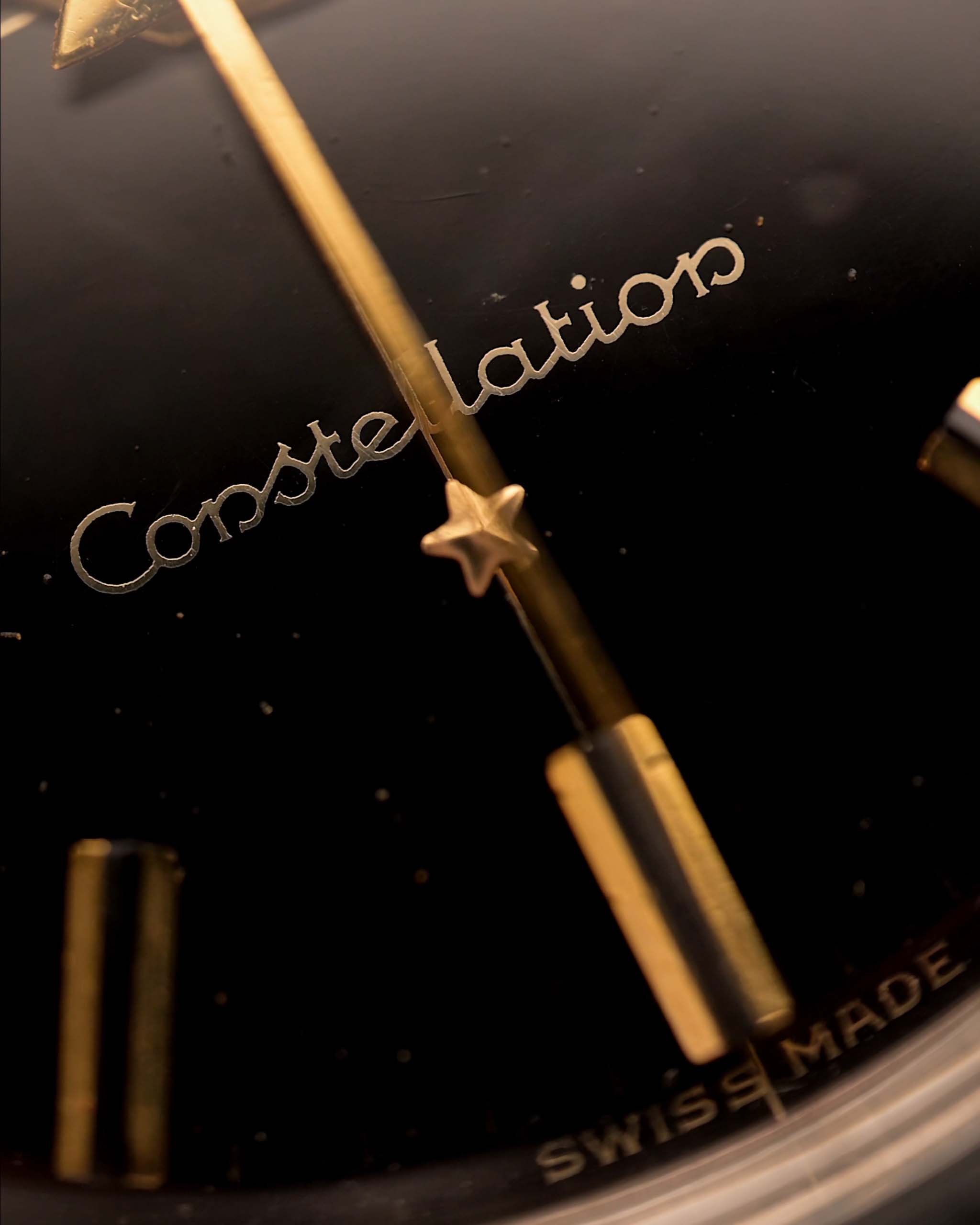 La caja de acero inoxidable de 34 mm presenta una geometría nítida y unos contornos elegantes, equilibrados por la característicaesfera dorada, un sello inconfundible de los primeros Constellation.Los índices bastóndelgados y las agujas dauphine facetadas completan el conjunto, capturando el ideal de refinada sobriedad de mediados de siglo.
