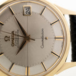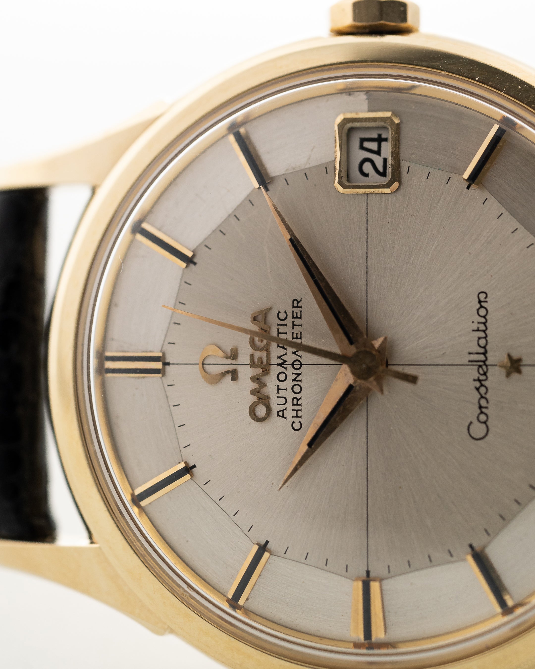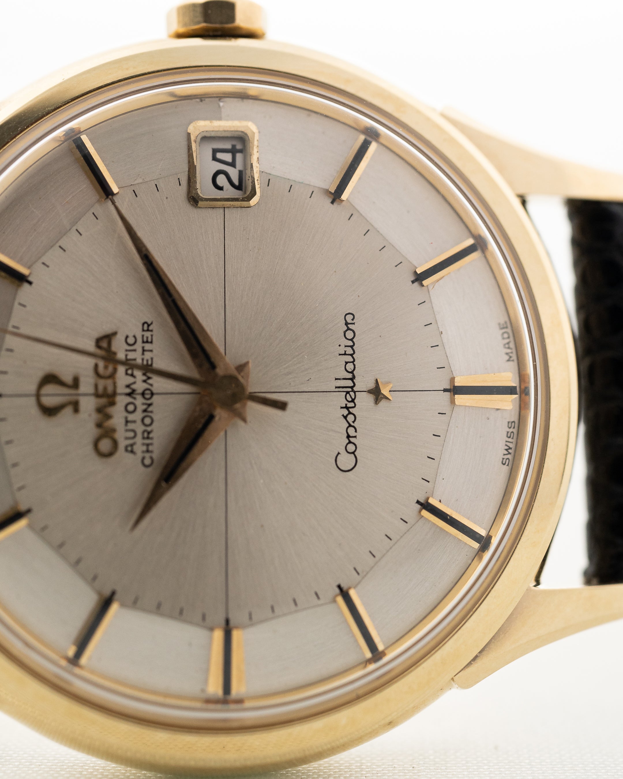 Este compacto y hermoso cronómetro automático Omega Constellation tiene todo lo que usted desea en un reloj de vestir: Caja de 35 mm de oro amarillo de 14 quilates, segundero central, una esfera Pie Pan muy hermosa y unos raros y delgados índices de bastón con centros de ónice. Lanzado por primera vez en 1952, el Constellation fue la respuesta de Omega al Rolex Datejust.