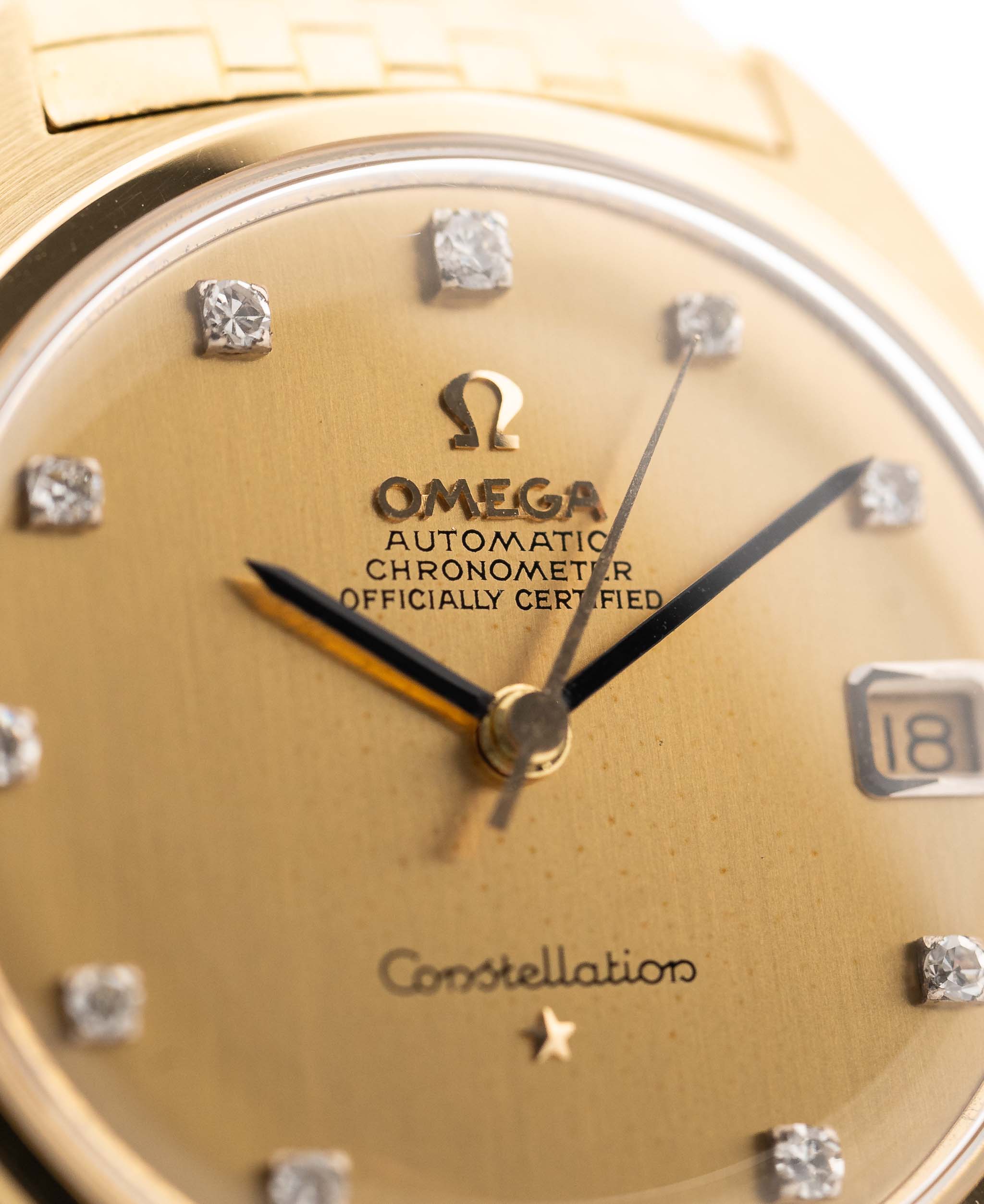 Omega Constellation 168009 Diamond de 1966. 34 mm en oro amarillo de 18 quilates con calibre automático 561, esfera dorada con marcadores de diamantes y brazalete de oro de 18 quilates.