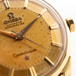 Este compacto y hermoso cronómetro automático Omega Constellation tiene todo lo que usted desea en un reloj de vestir: caja de 34 mm de oro rosa de 18 quilates, segundero central, una esfera dorada muy bonita de tipo pastel y unos raros índices de bastón. Lanzado por primera vez en 1952, el Constellation fue la respuesta de Omega al Rolex Datejust.