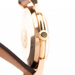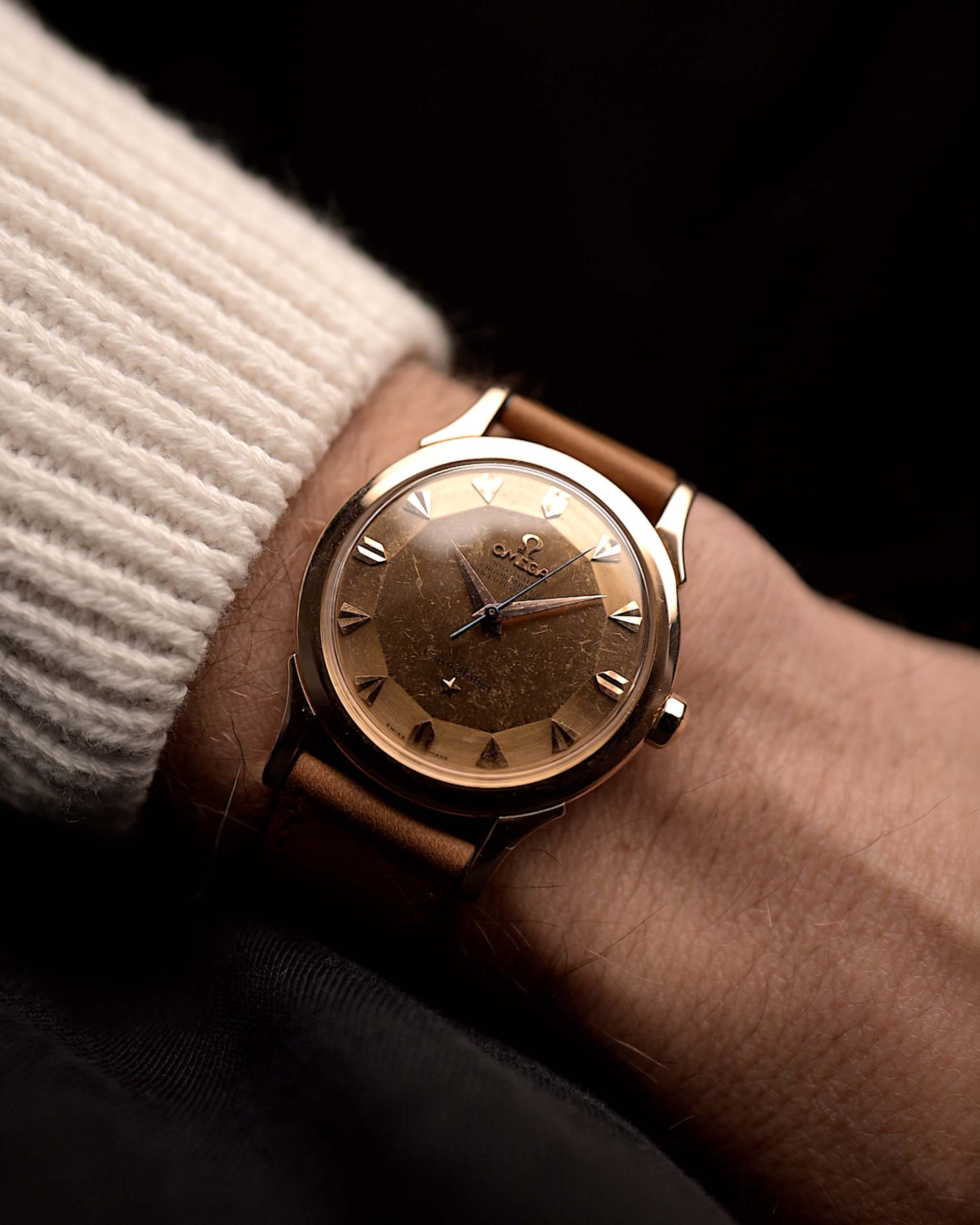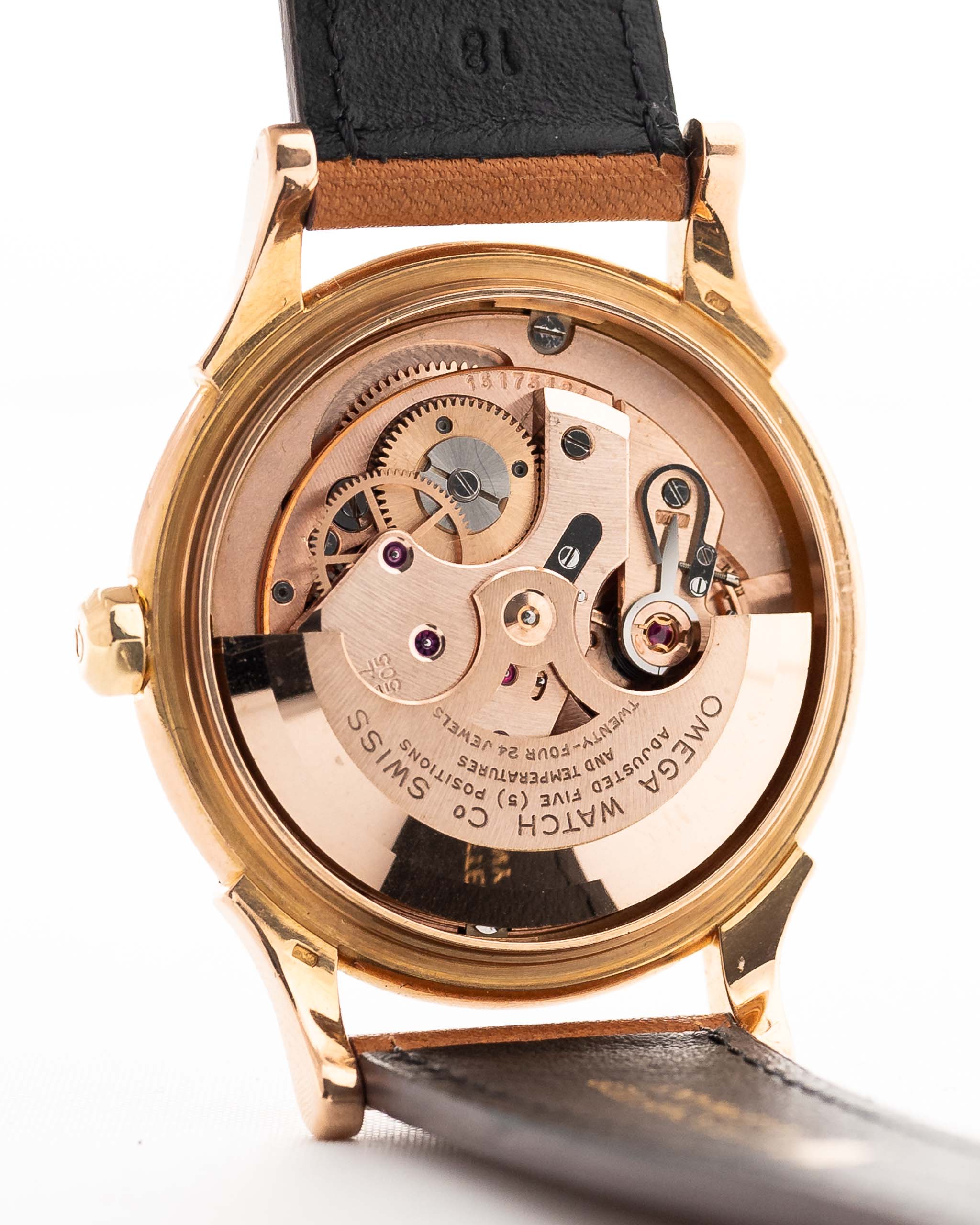 Este compacto y bello cronómetro automático Omega Constellation tiene todo lo que usted desea en un reloj de vestir: Caja de 35 mm de oro rosa de 18 quilates, segundero central, esfera de oro rosa tipo pastel e impresionantes marcadores horarios con cabeza de flecha. Lanzado por primera vez en 1952, el Constellation fue la respuesta de Omega al Rolex Datejust.