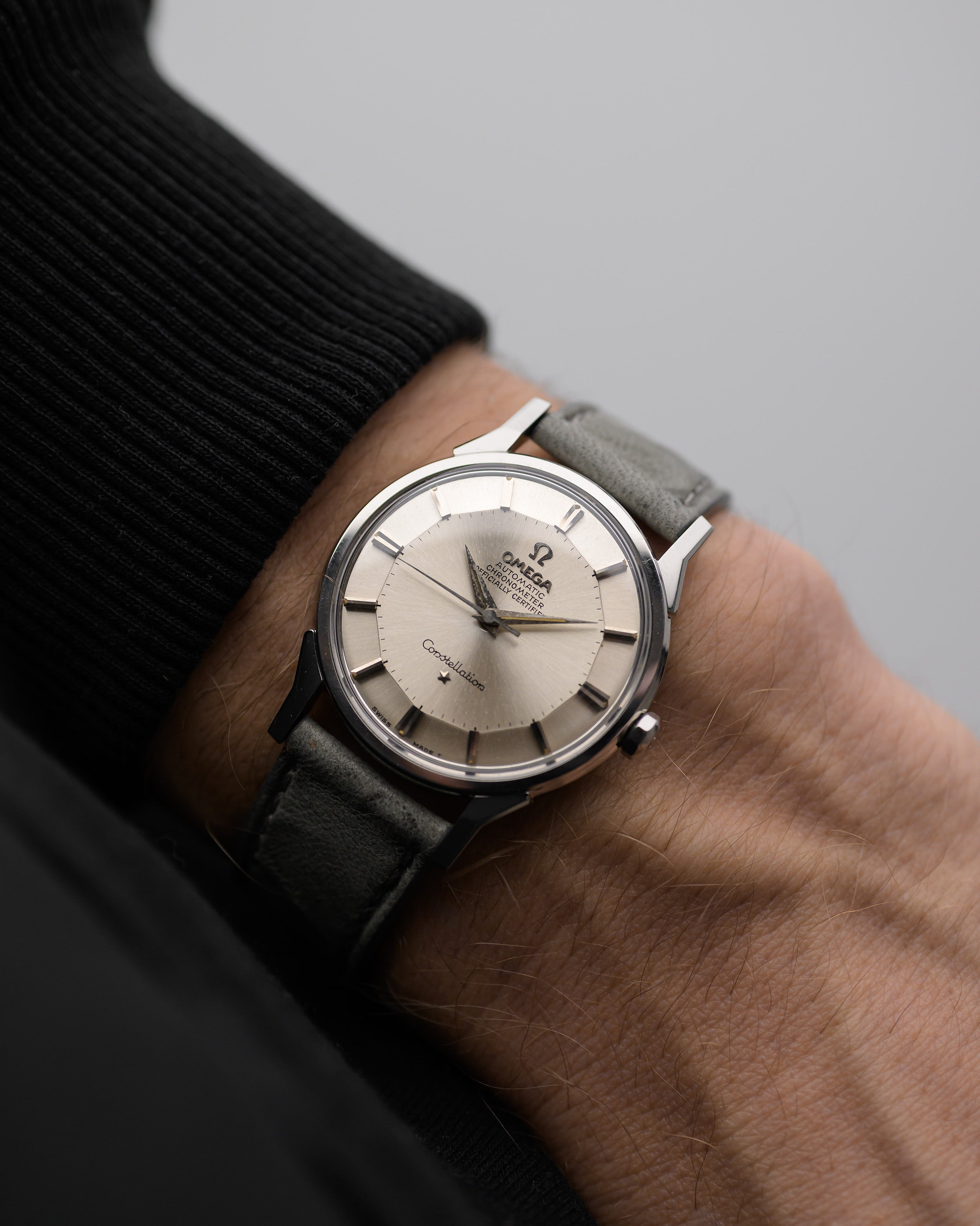 Este compacto y hermoso cronómetro automático Omega Constellation tiene todo lo que usted desea en un reloj de vestir: Caja de acero inoxidable de 34 mm, segundero central, una esfera plateada sunburst muy bonita y unos raros y finos índices de bastón y una esfera Pie Pan. Lanzado por primera vez en 1952, el Constellation fue la respuesta de Omega al Rolex Datejust.